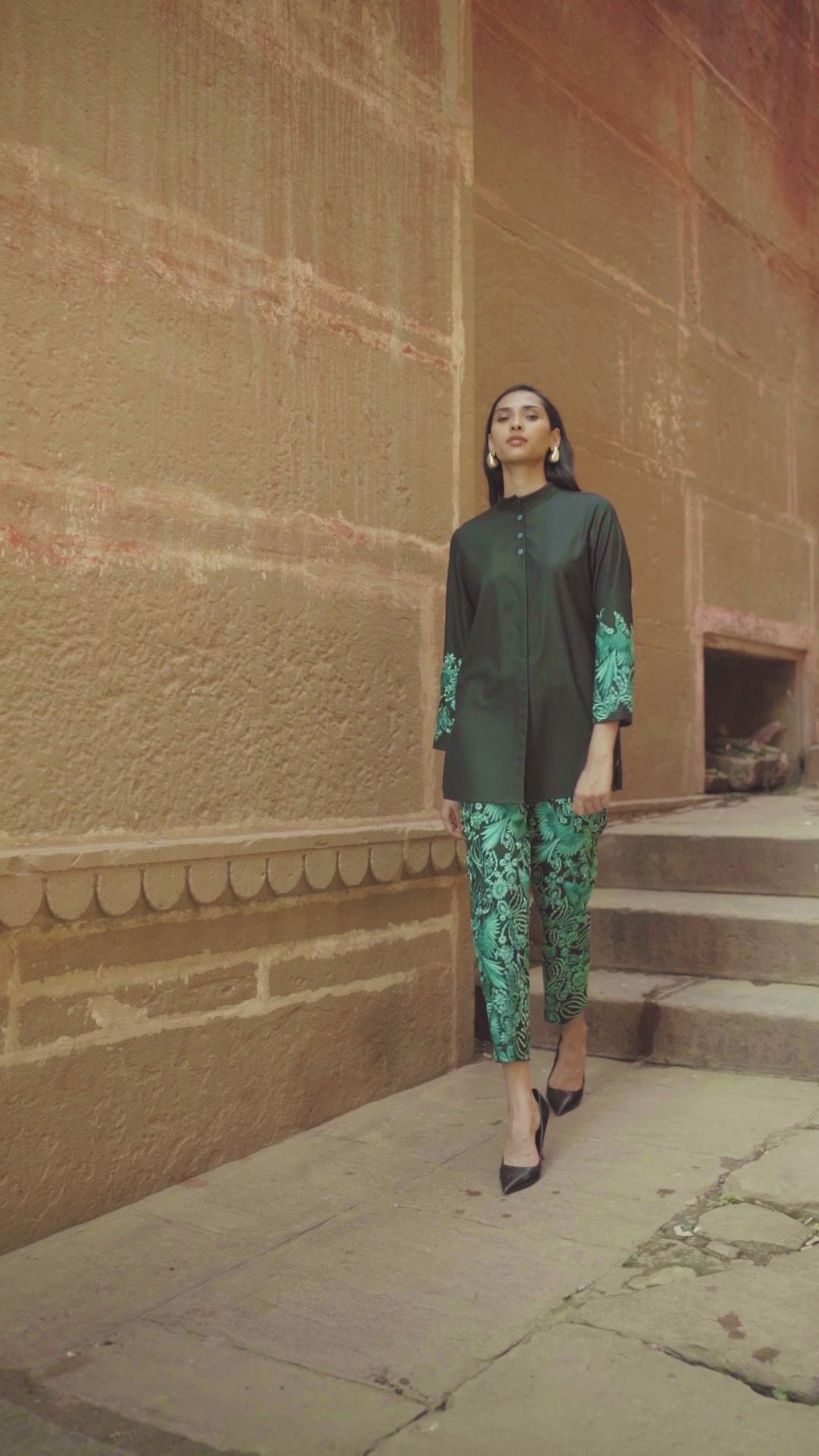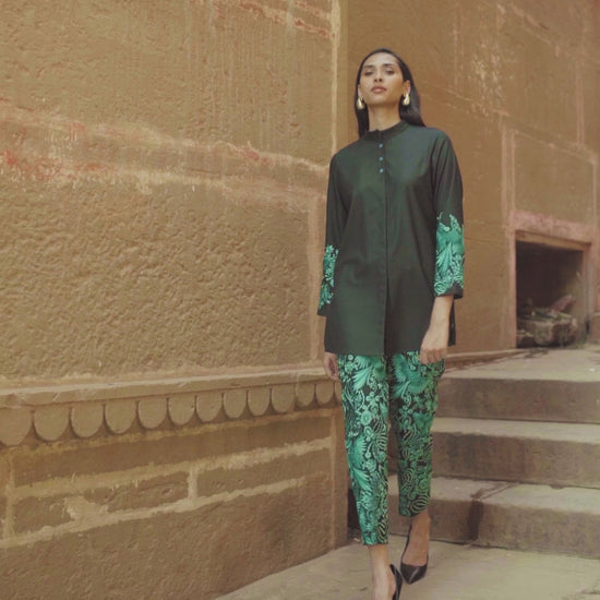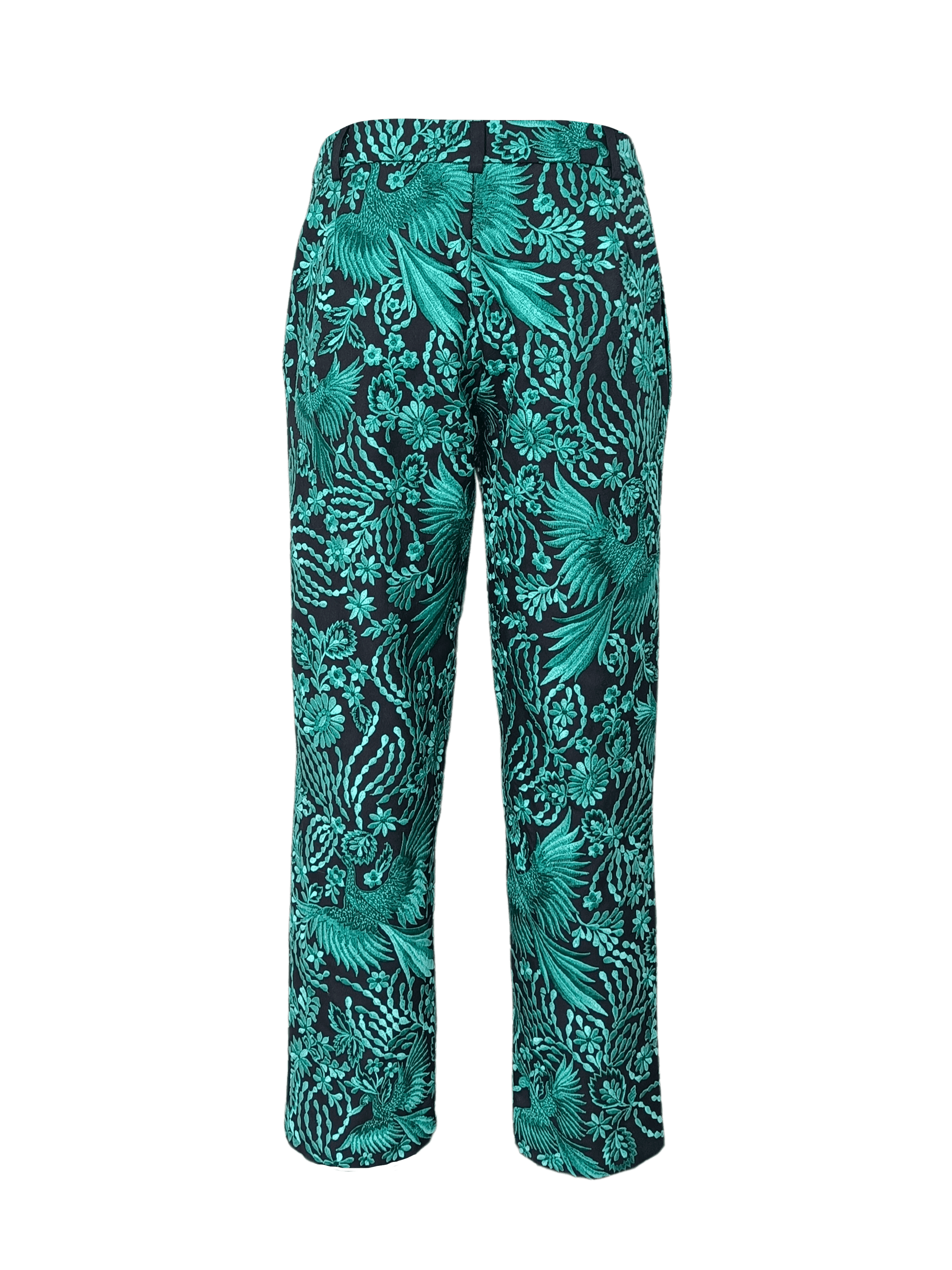 Black tapered fit pants in all over gara stitch inspired embroidery in emerald green. Pockets at the side.Hook and zip closure at the front. Belt loops.