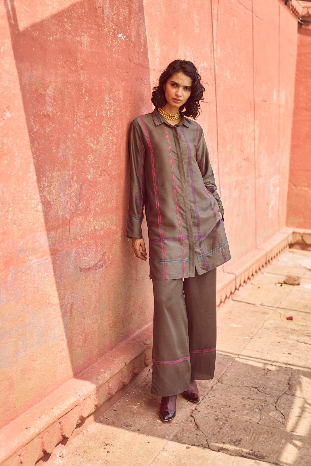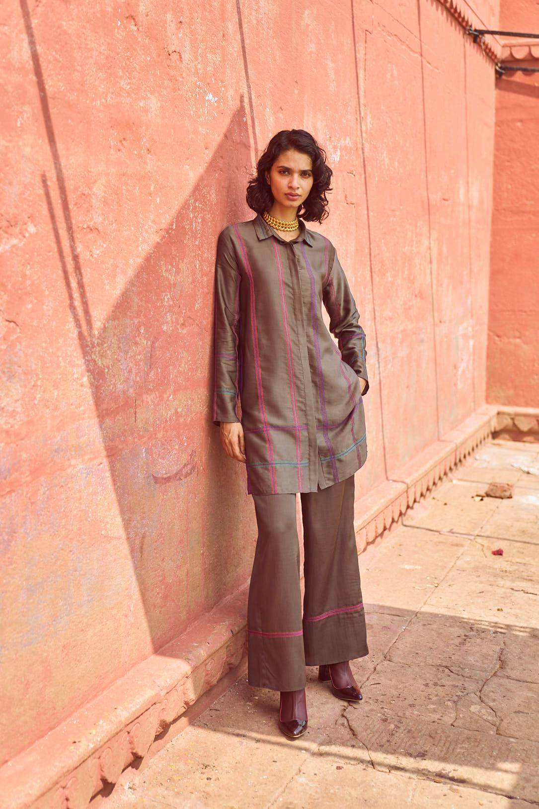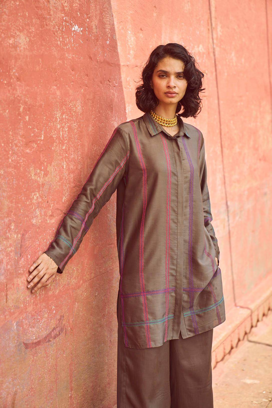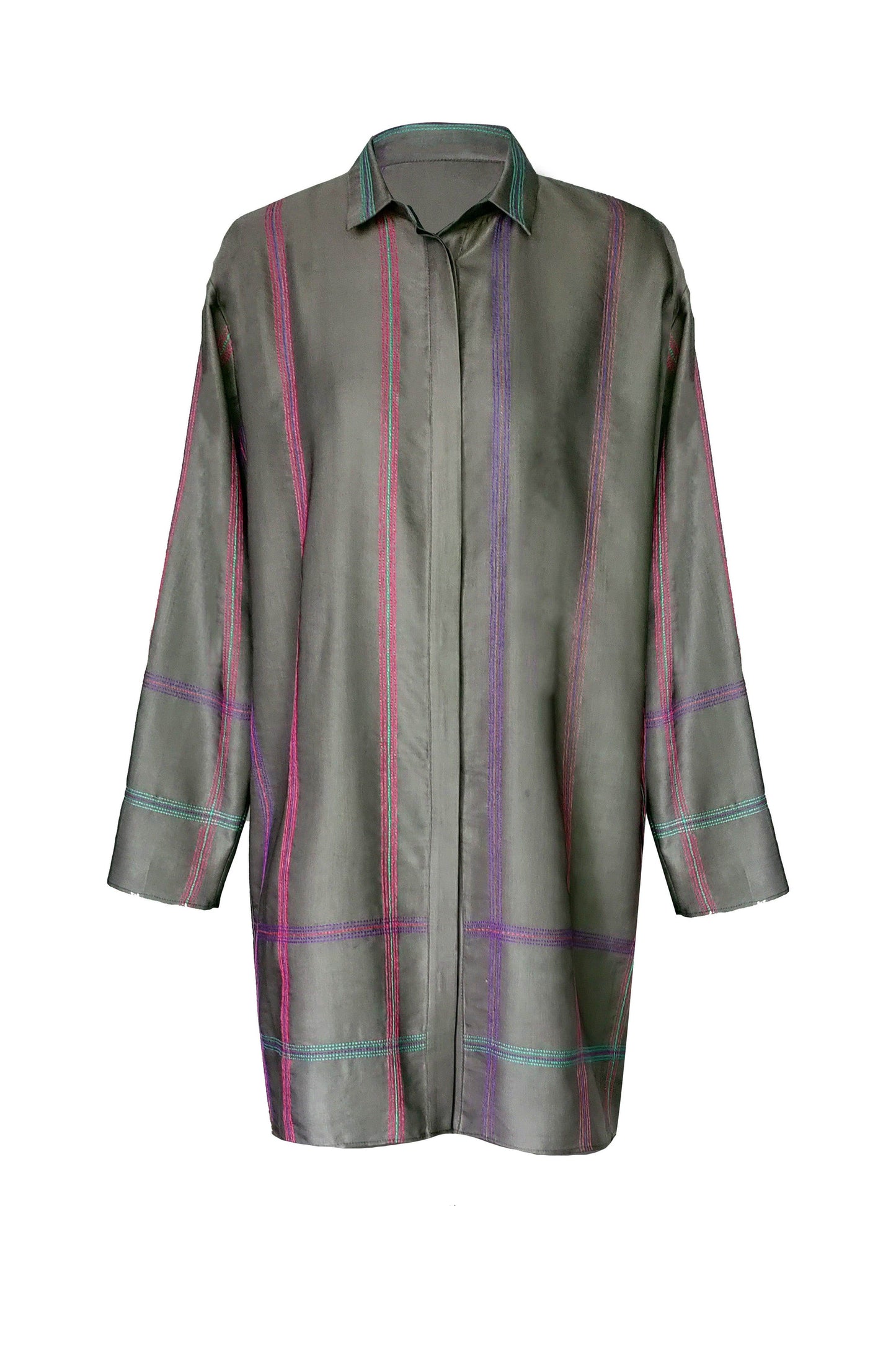 Dove grey longline top in organic flowy viscose satin fabric. Vertical chain stitch stripe on the top that ends in checked border around the hem in pleasant tones of aqua, fuchsia and purple. Boxy fit silhouette with tapered sleeves. Shirt collar. Concealed button placket. Slit on the sides.