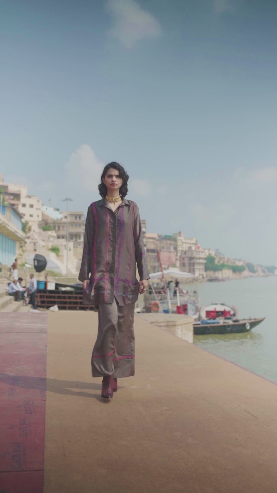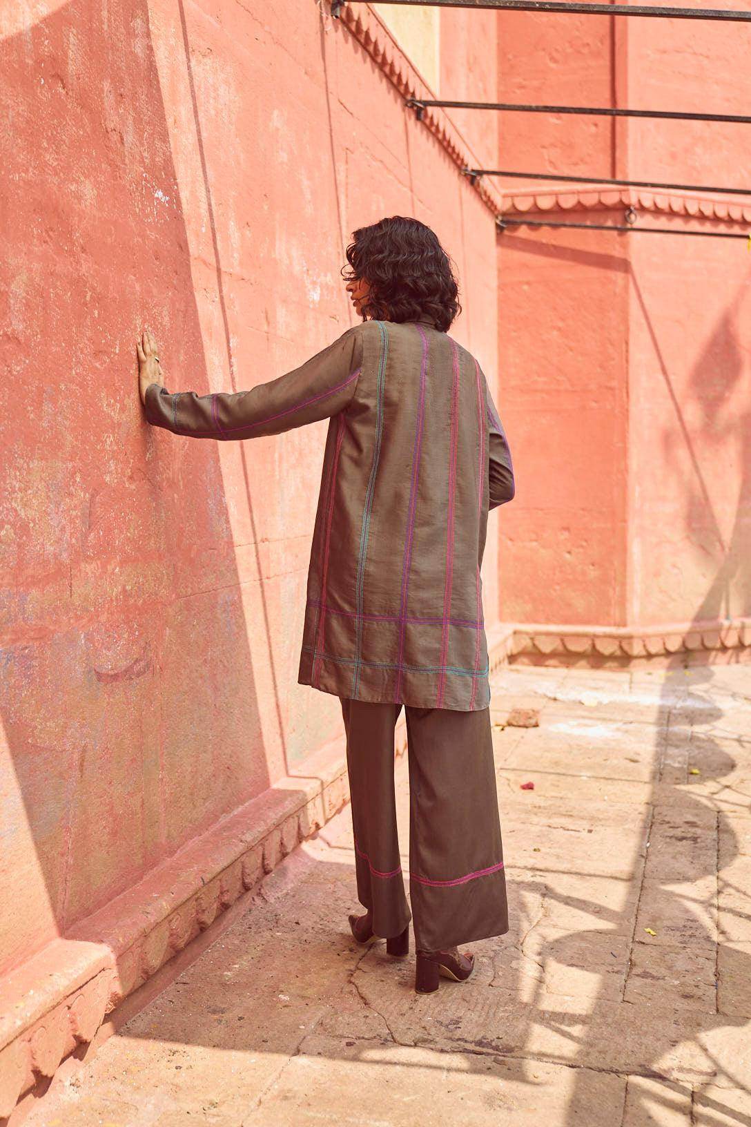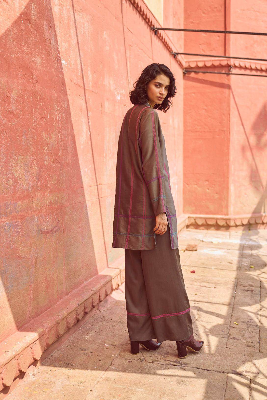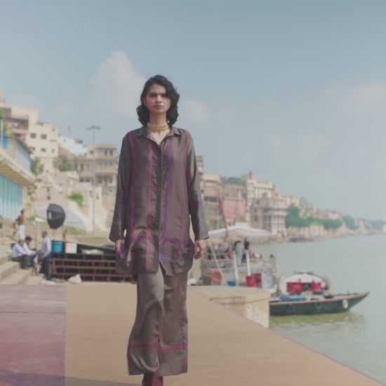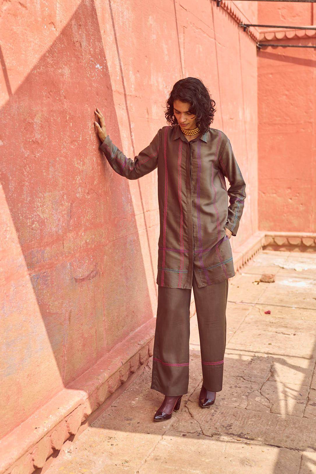 Dove grey longline top in organic flowy viscose satin fabric. Vertical chain stitch stripe on the top that ends in checked border around the hem in pleasant tones of aqua, fuchsia and purple. Boxy fit silhouette with tapered sleeves. Shirt collar. Concealed button placket. Slit on the sides.