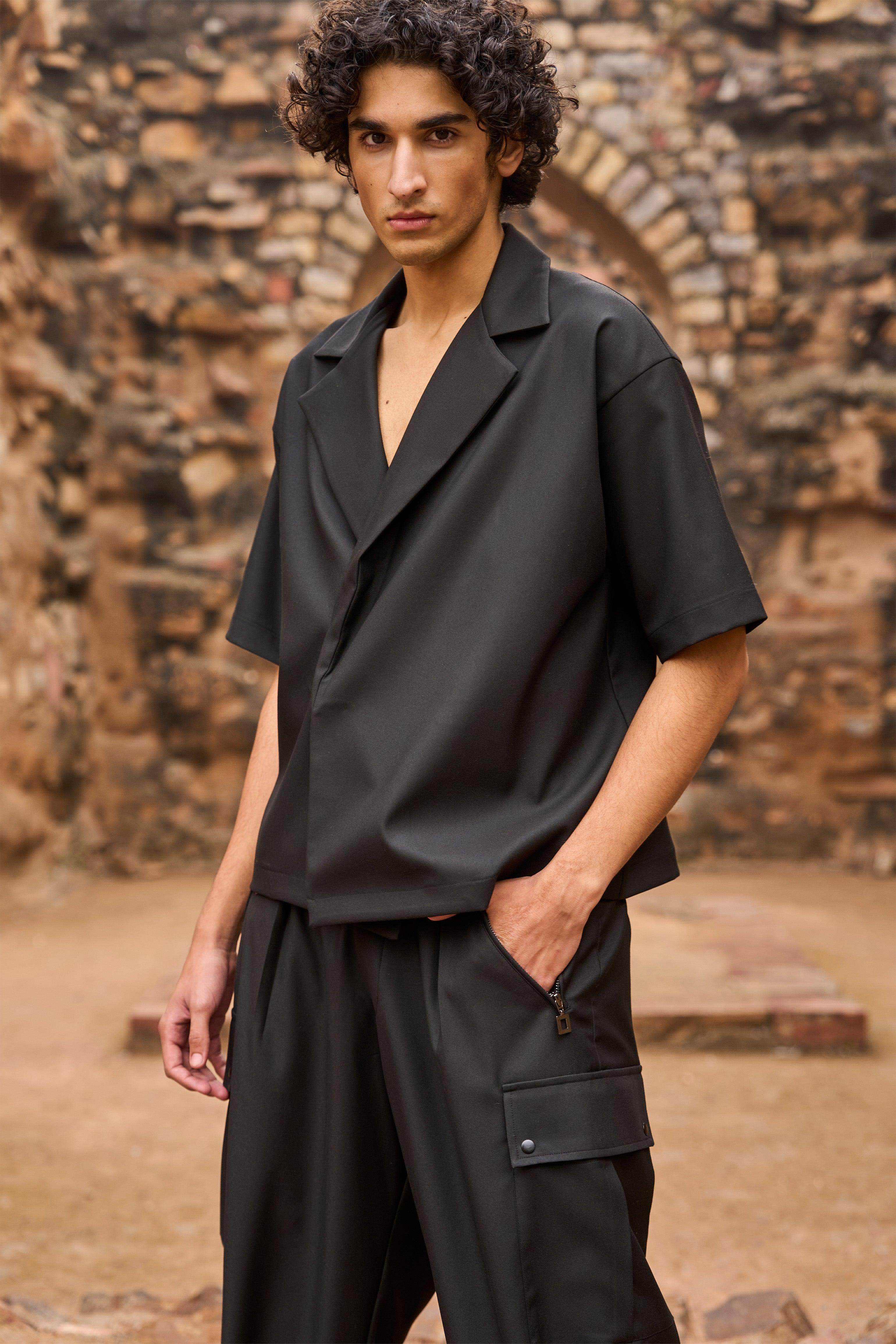 Blazer inspired half sleeve shirt with notch lapels. Concealed single button in the front. Relaxed fit. Paired with matching carrot legged pants with patch pockets and zip details. Belt loops and hook/eye + zipper closure. Inverted pleats in the front add to its flattering shape.