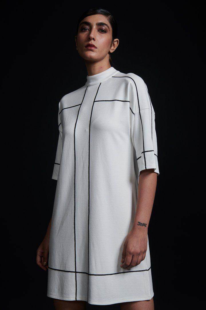 High-neck shift dress with drop shoulder. Features contrast-stitch geometric lines. Comfort fit.
