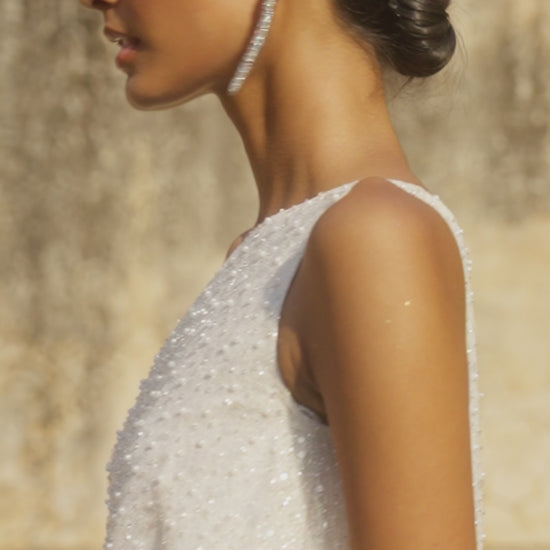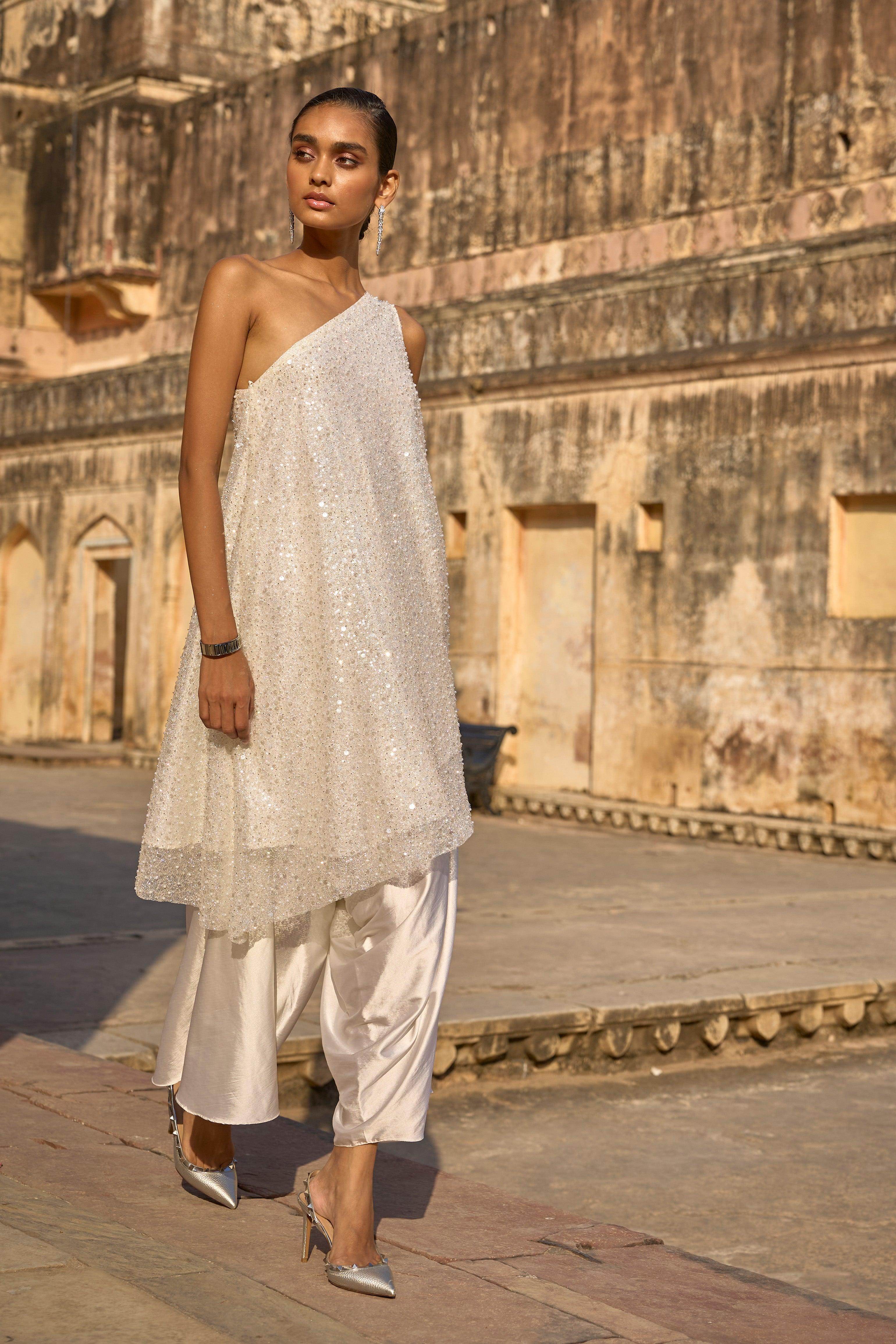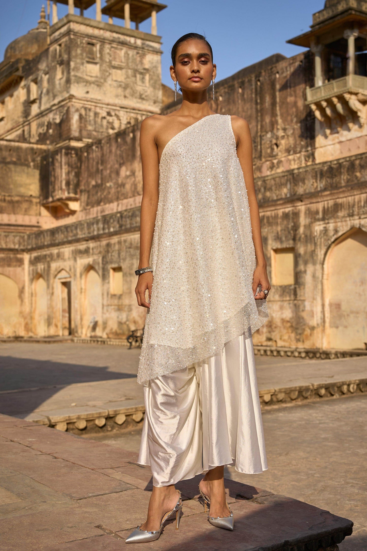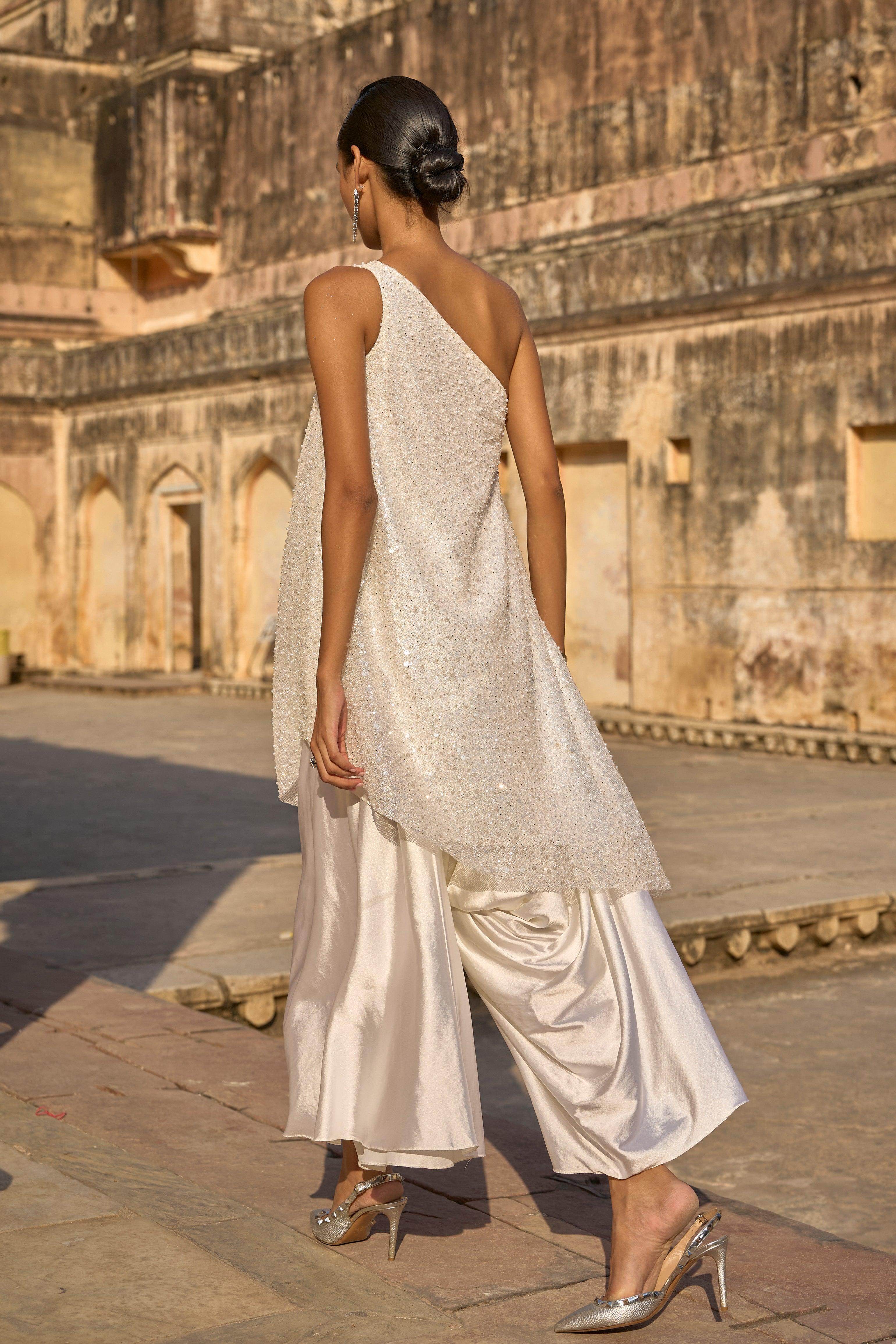 Draped culotte pant in an ivory satin fabric. Harem pant inspired shape. Semi elasticated at the waist with zip and hook/eye closure on the side. Flared at the hem.