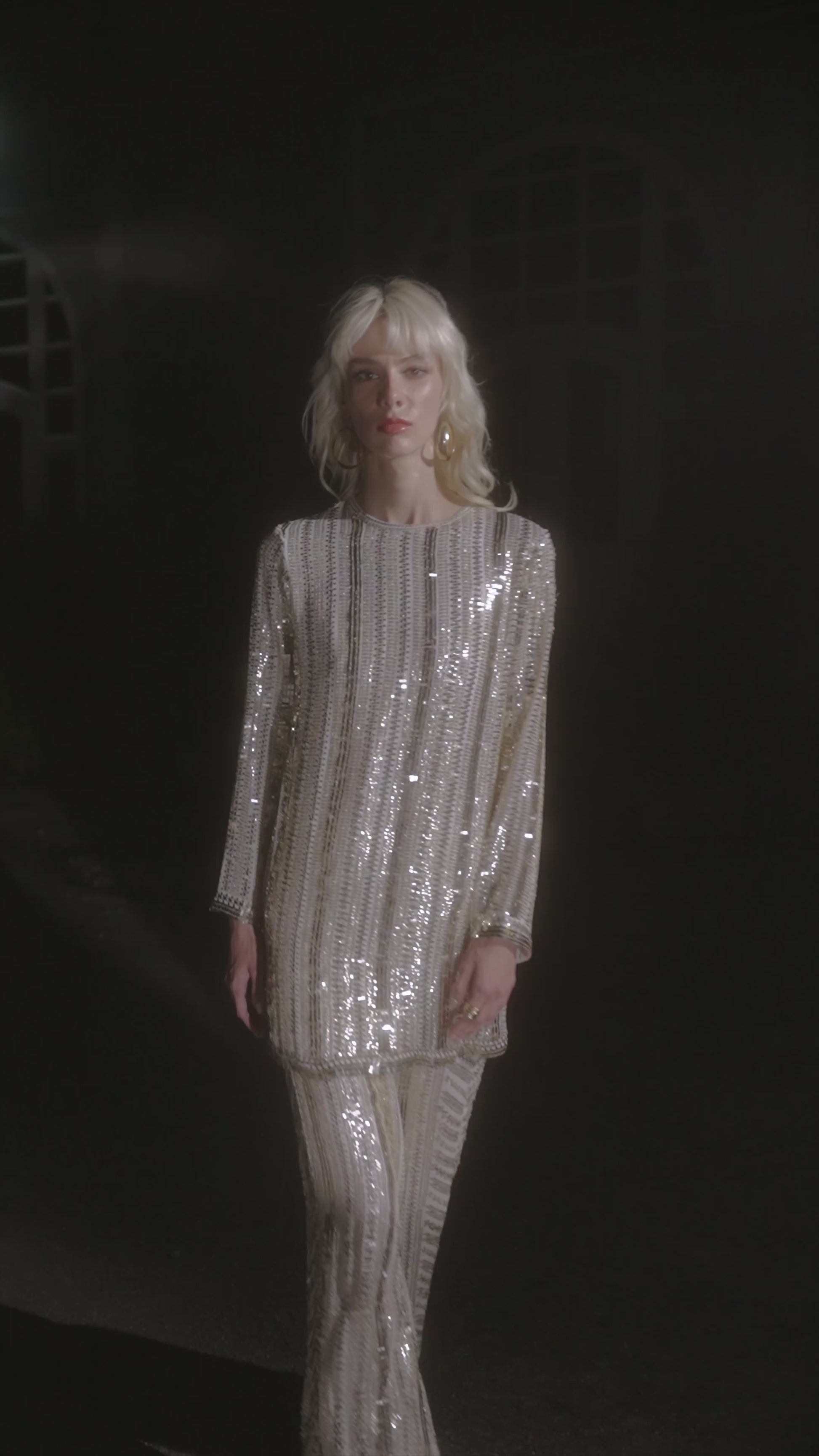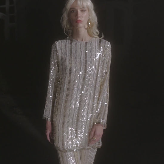 Longline top in gold linear sequin and thread embroidery that shift with light. Geometric layout in soft champagne gold tones on an ivory base, give the garment a luxe, luminous finish. Full sleeves in a straight cut, relaxed fit. Round neck with pearl button and loop closure at the back. Slits in the sides. Garment is fully lined. Paired with matching wide-legged flared pant. Concealed side zip with hook/eye closure. Garment is fully lined.