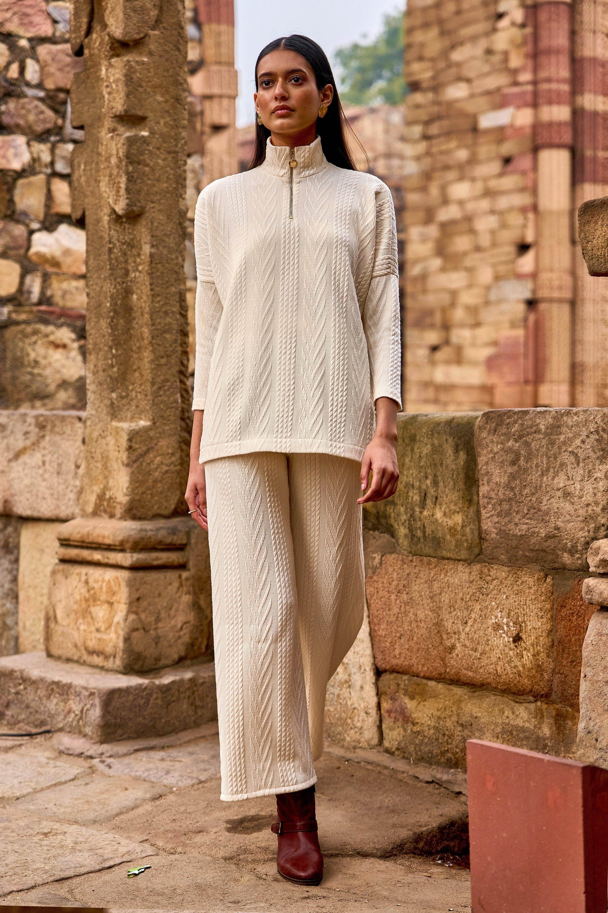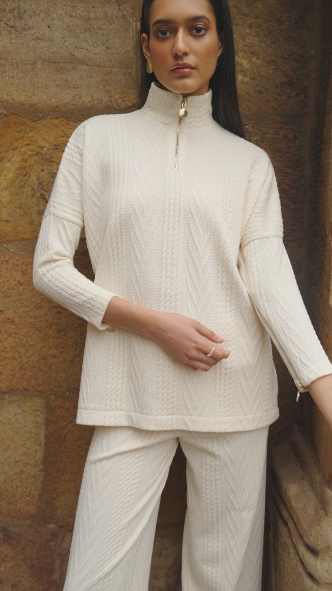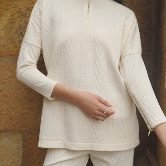 Soft knitted straight legged pant. Textured jacquard in a cable knit pattern. Elasticated at the waist.