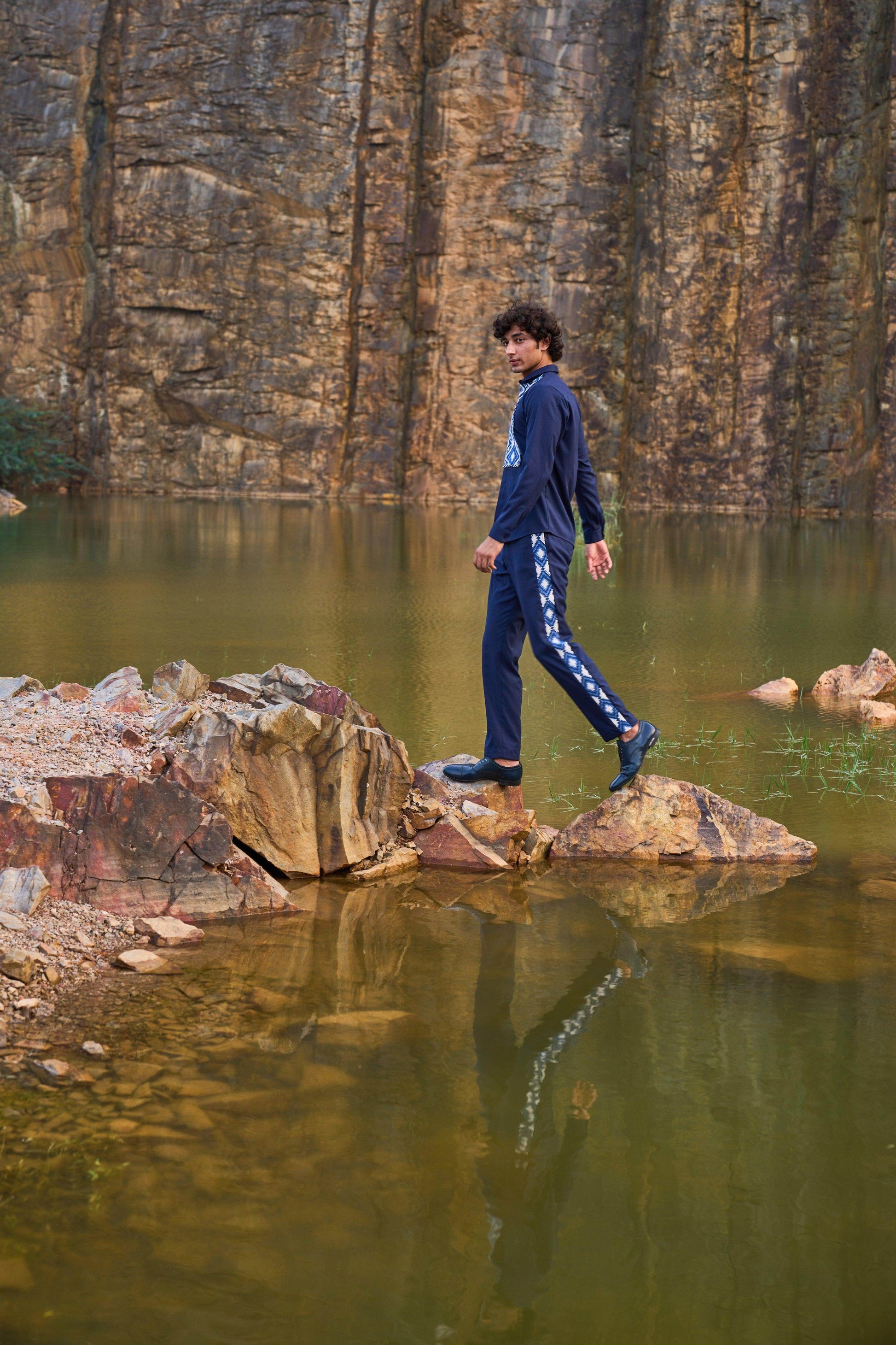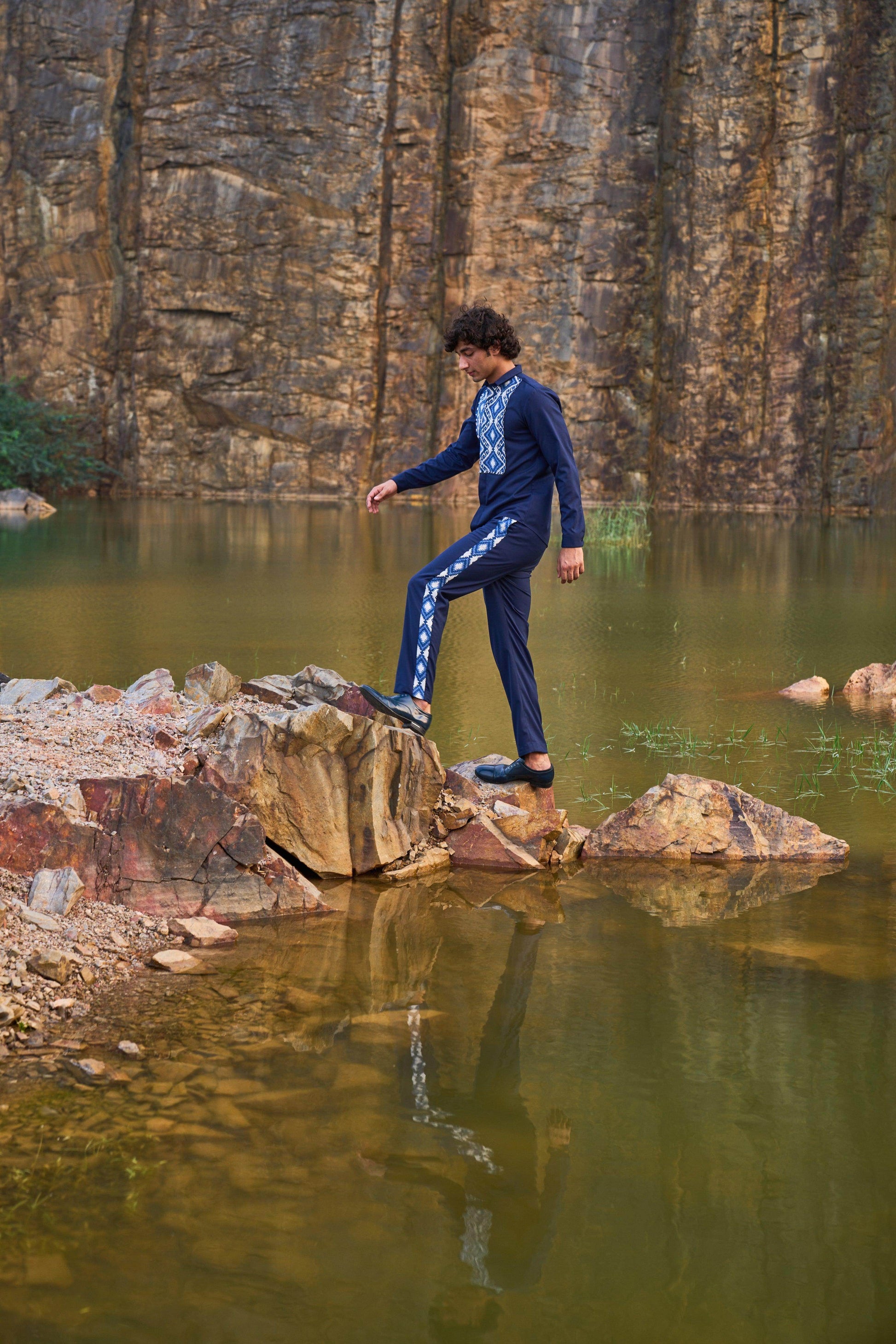 Blue button-down full sleeve shirt with a paneled patterned jacquard bib at the front. Concealed buttons. Regular fit. Paired with matching pants with patterned jacquard stripe detail down the sides. Zip closure at the front, belt loops. Pockets on the side and back. Made of all weather suiting material.