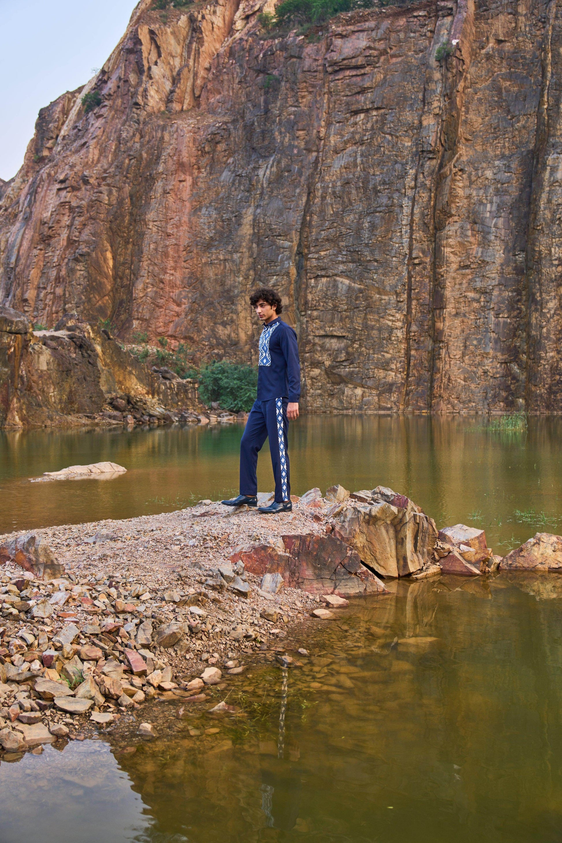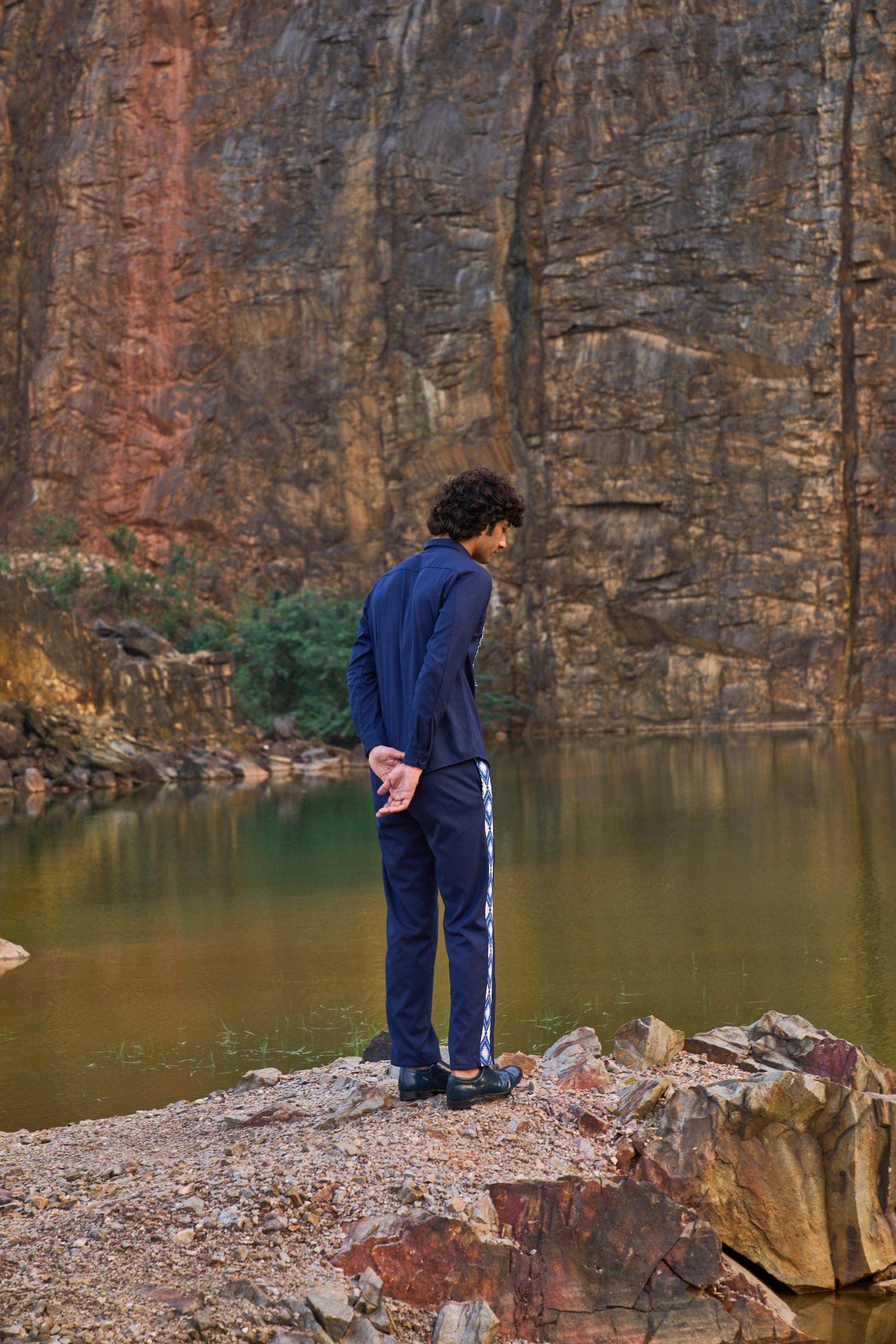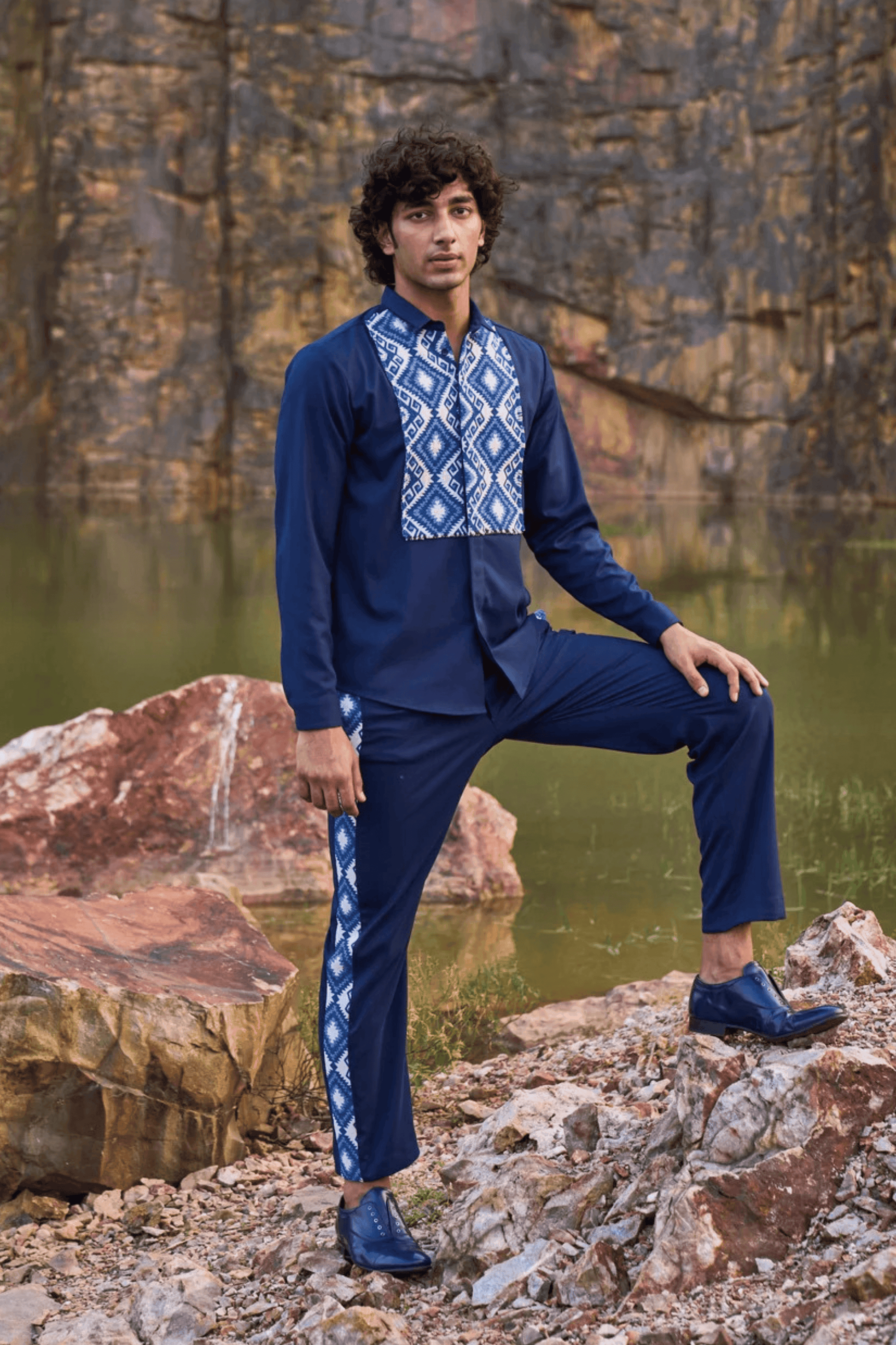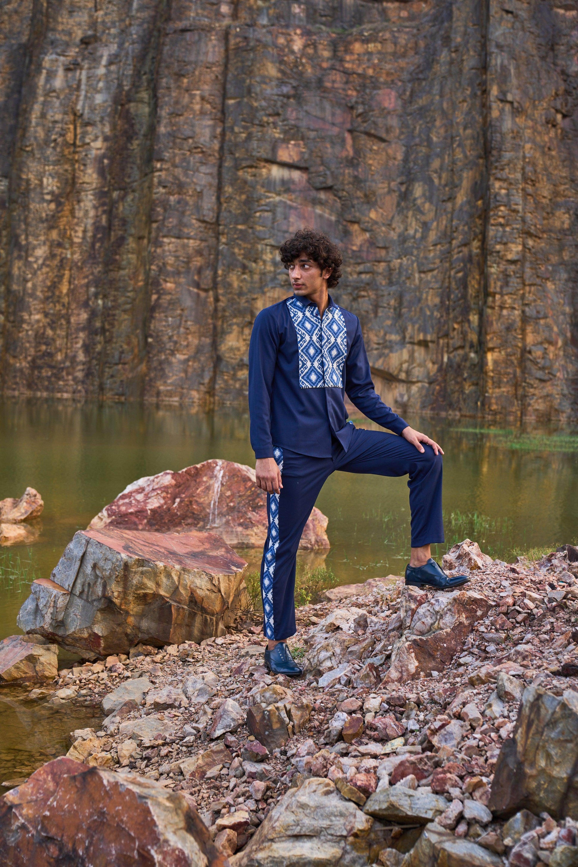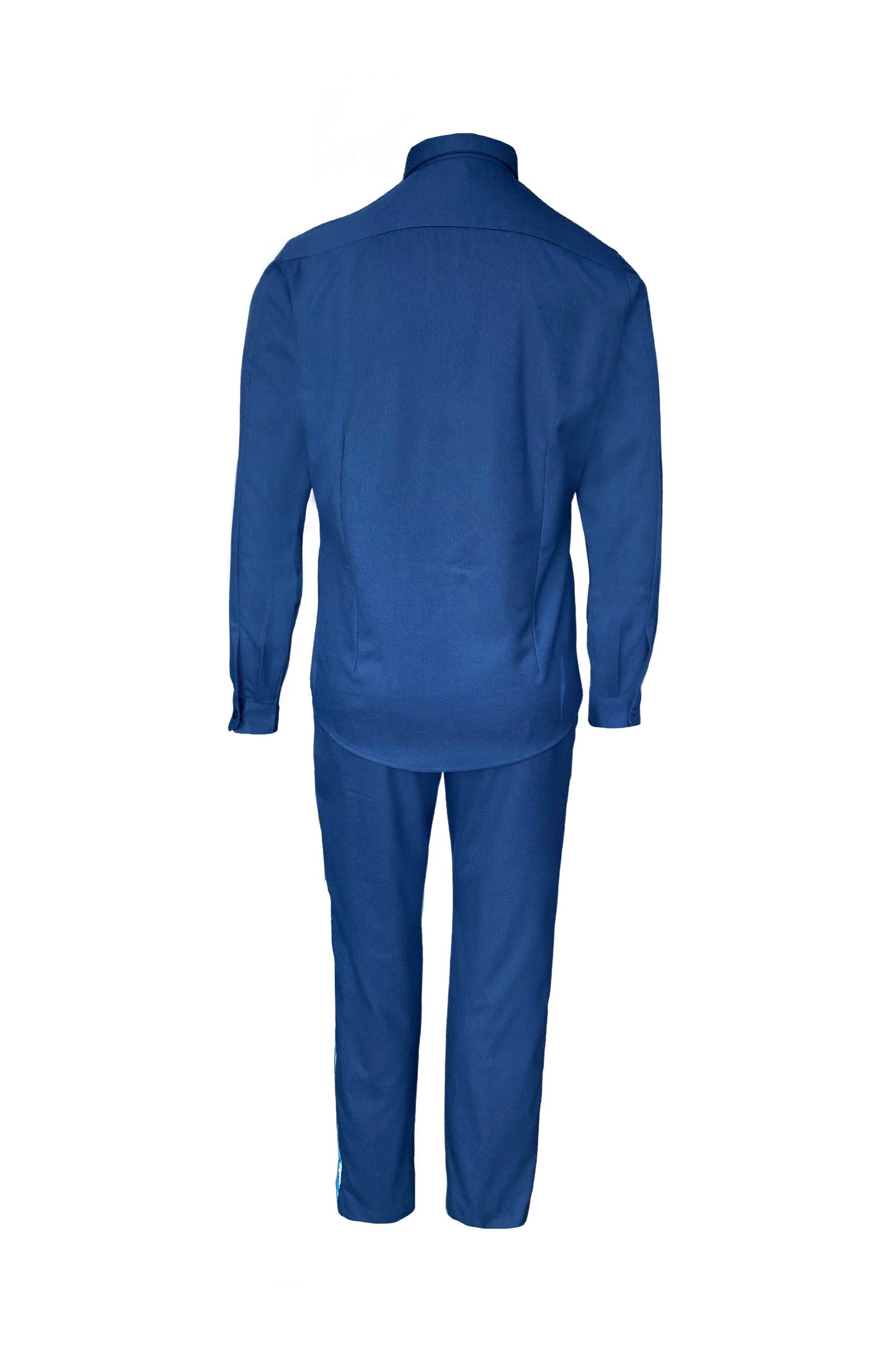 Blue button-down full sleeve shirt with a paneled patterned jacquard bib at the front. Concealed buttons. Regular fit. Paired with matching pants with patterned jacquard stripe detail down the sides. Zip closure at the front, belt loops. Pockets on the side and back. Made of all weather suiting material.