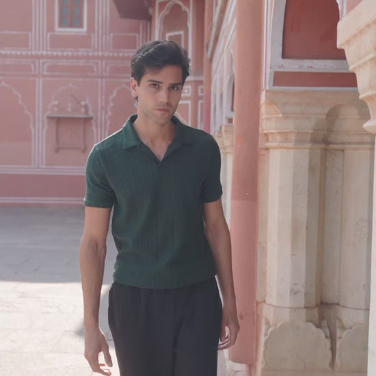 Jacquard geometric patterned knit polo in forest green. Collar placket, bottom band and cuff. Short sleeves.