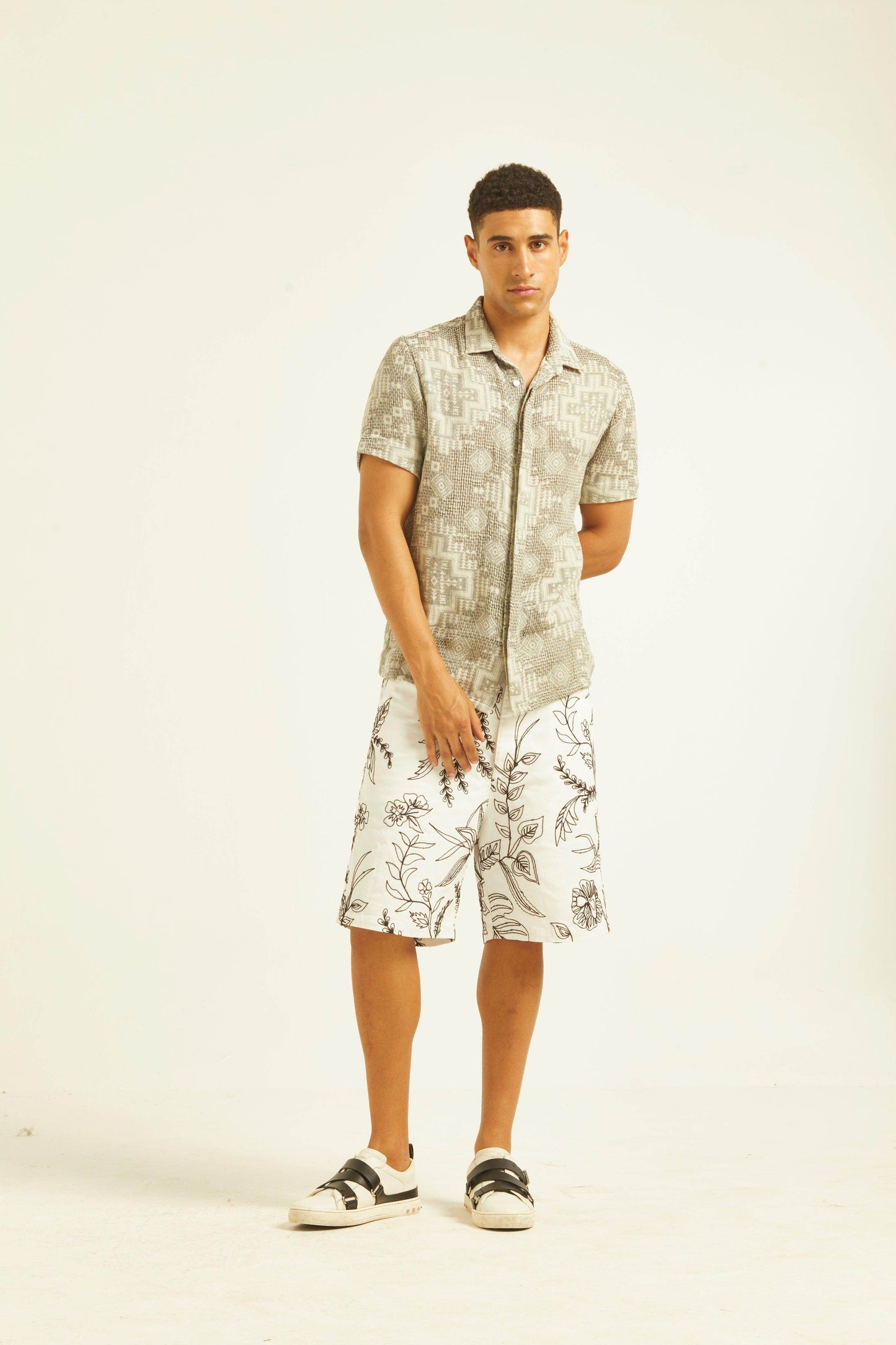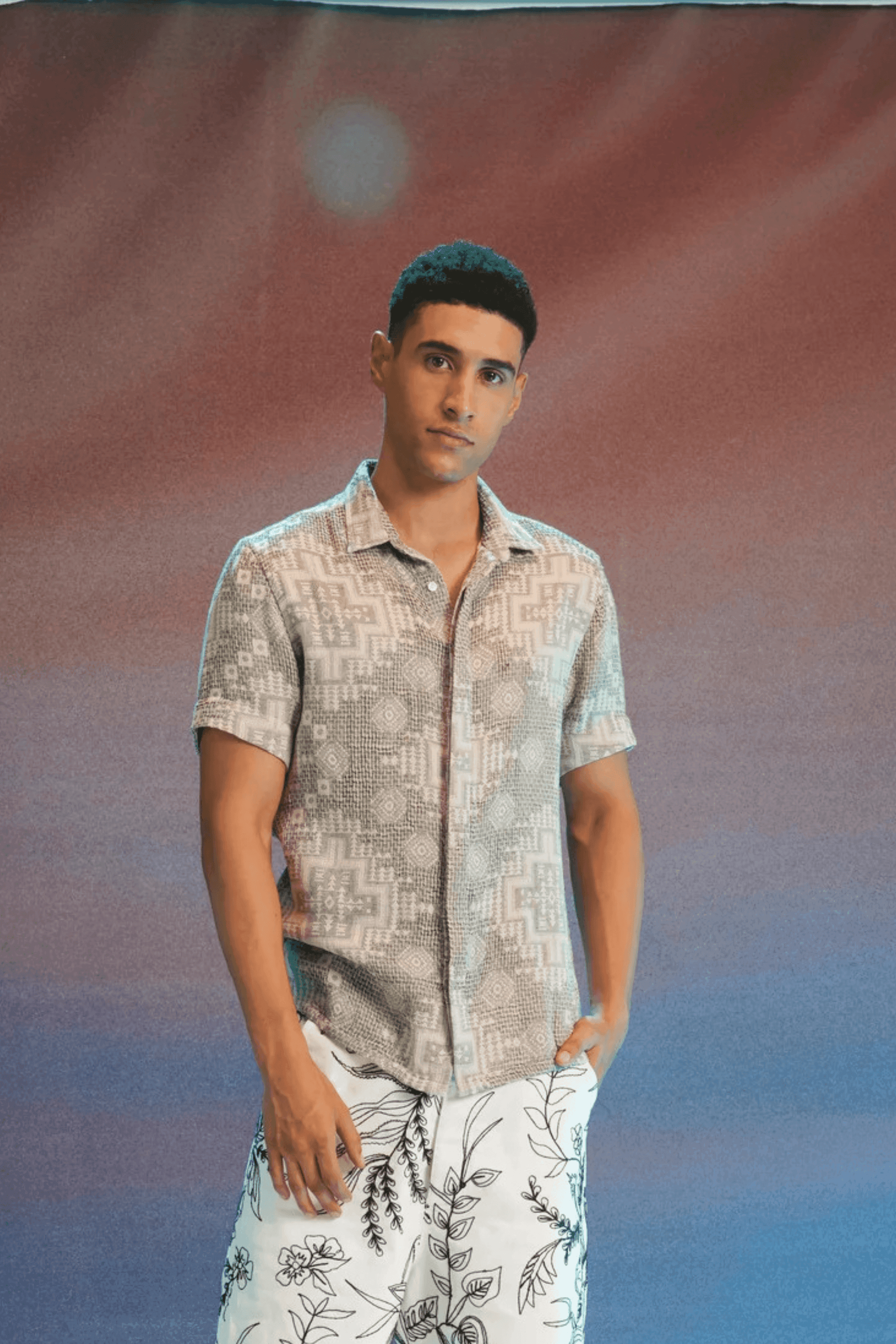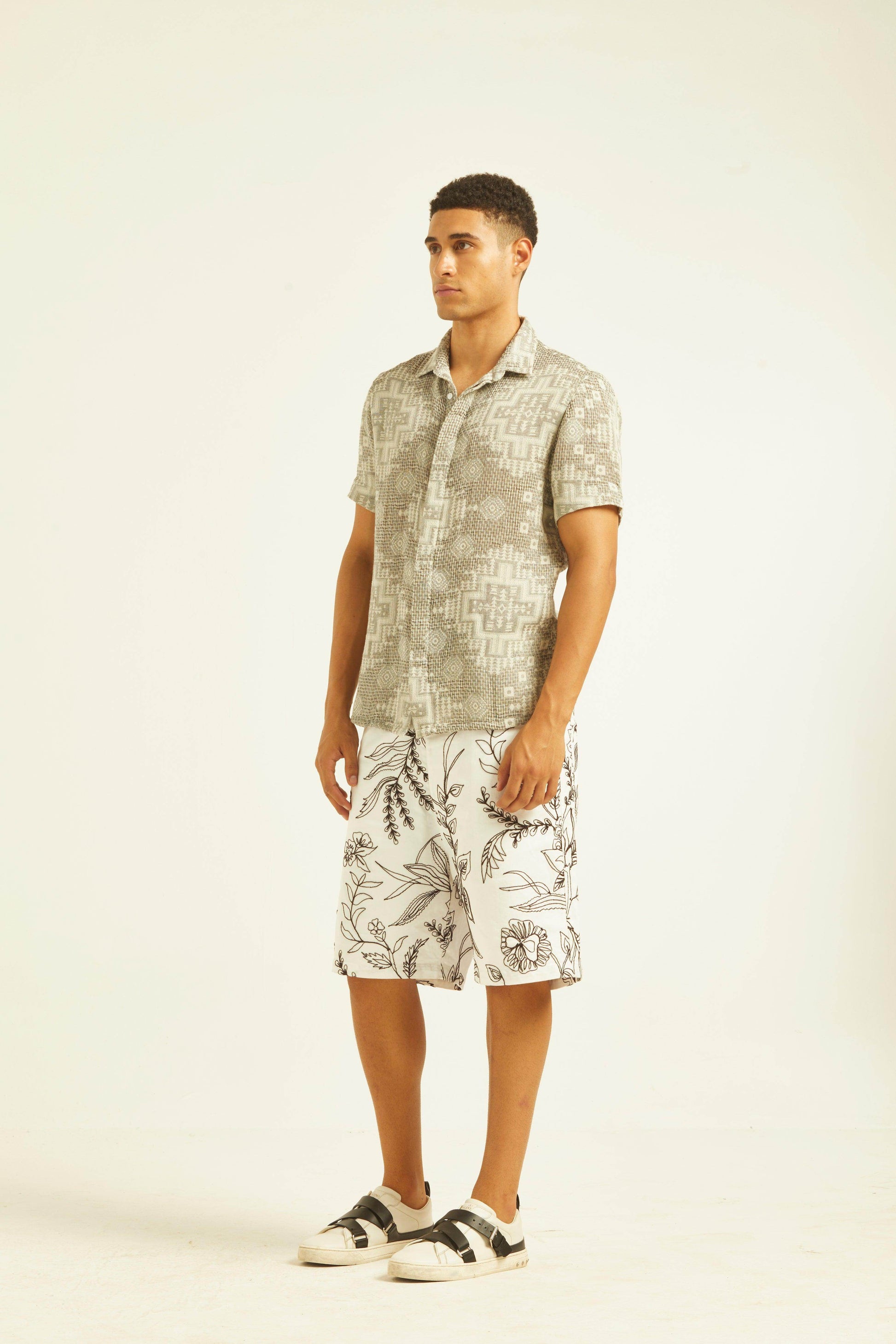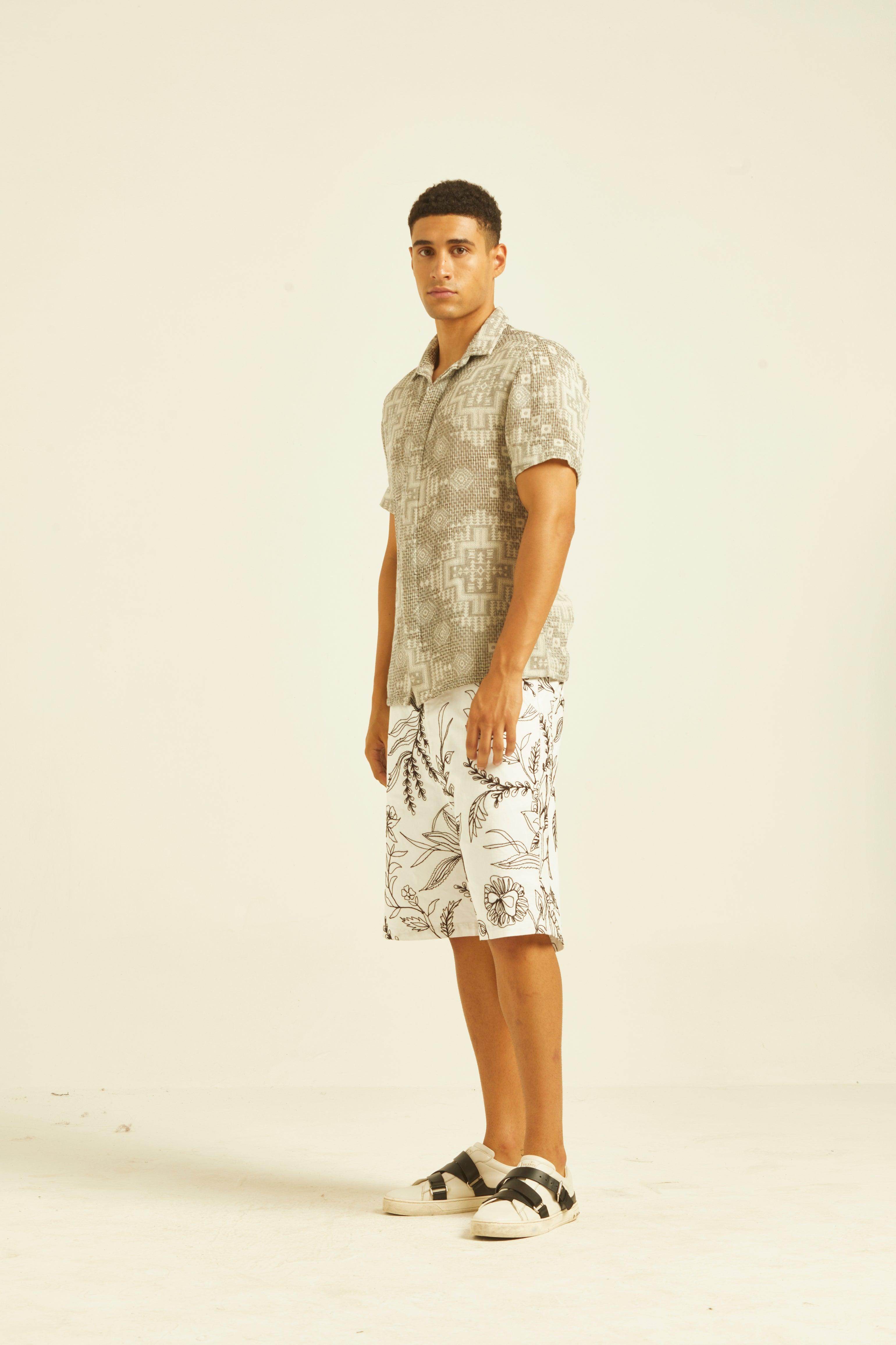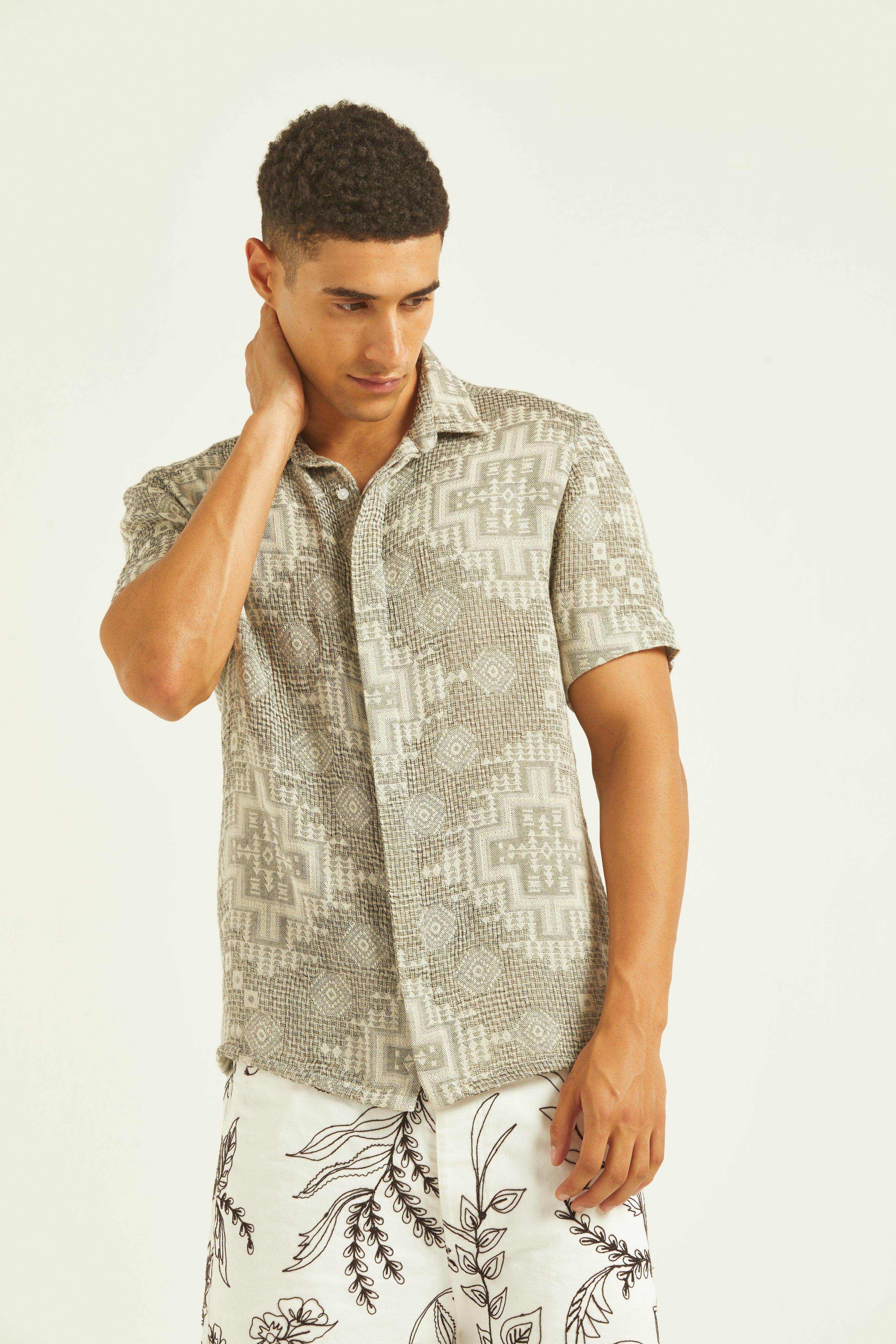 Loose weave jacquard shirt in tones of grey. Button-down front, half sleeve. Concealed placket.