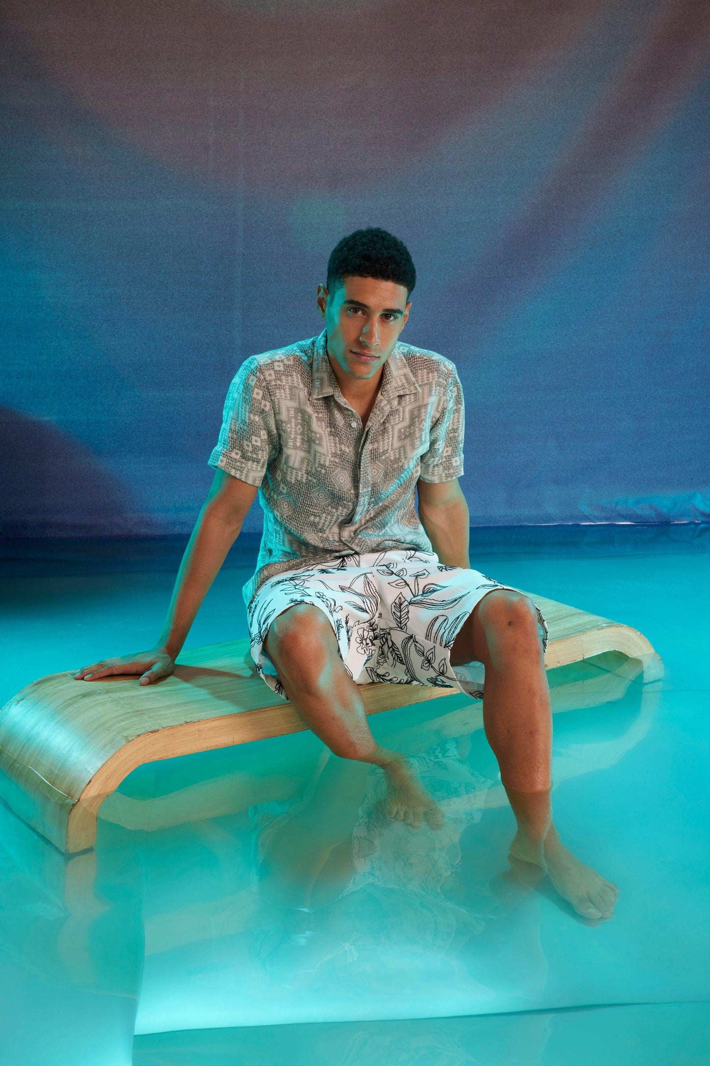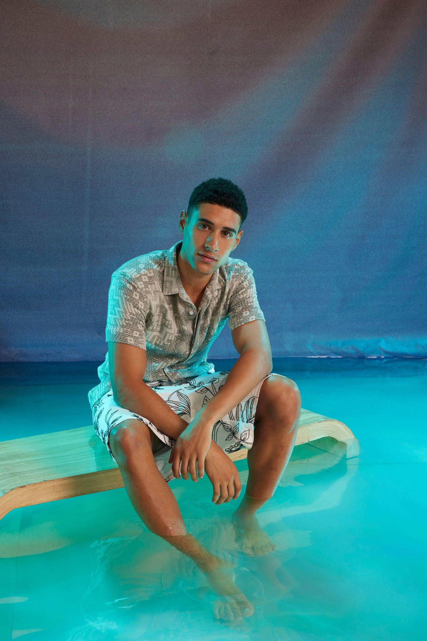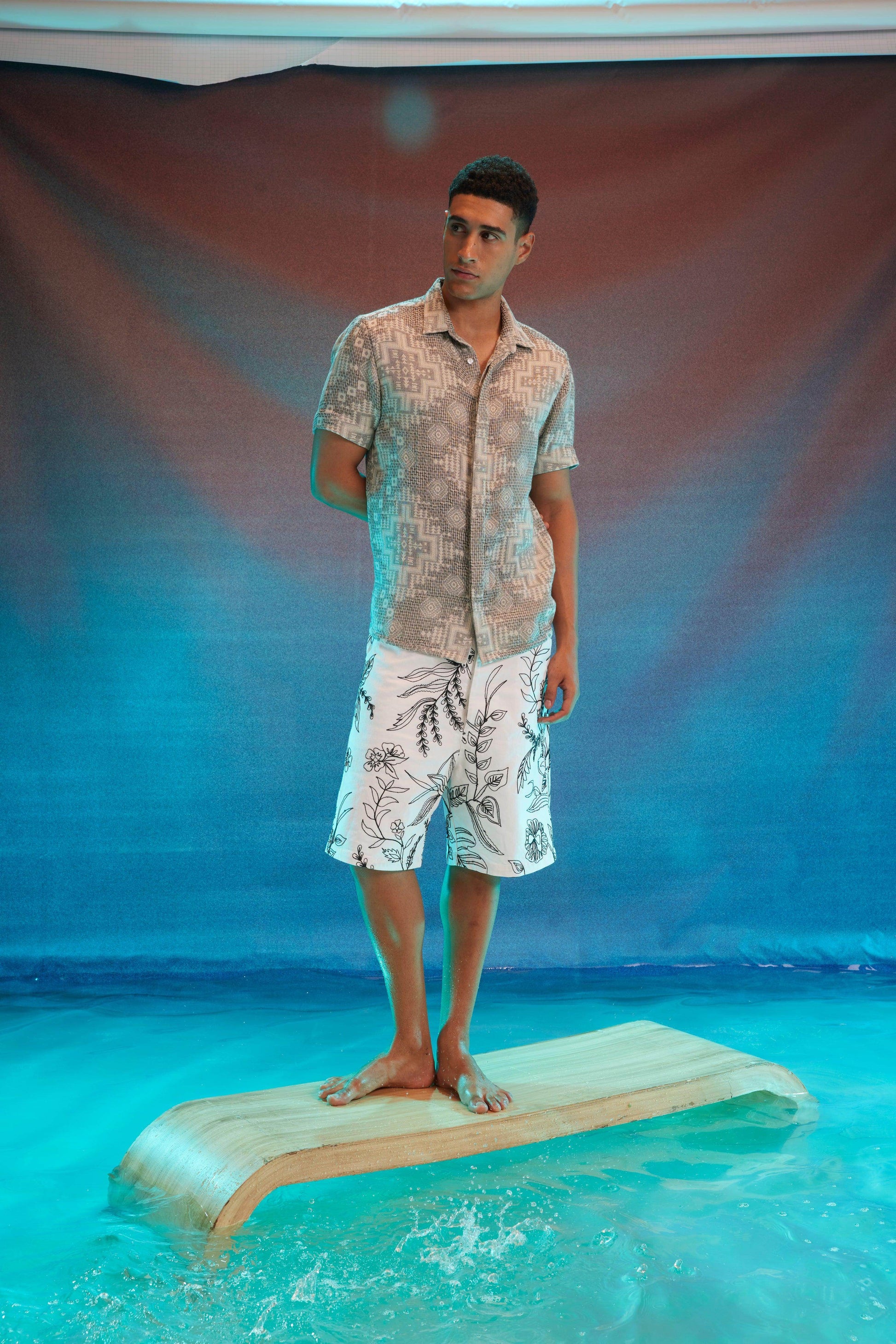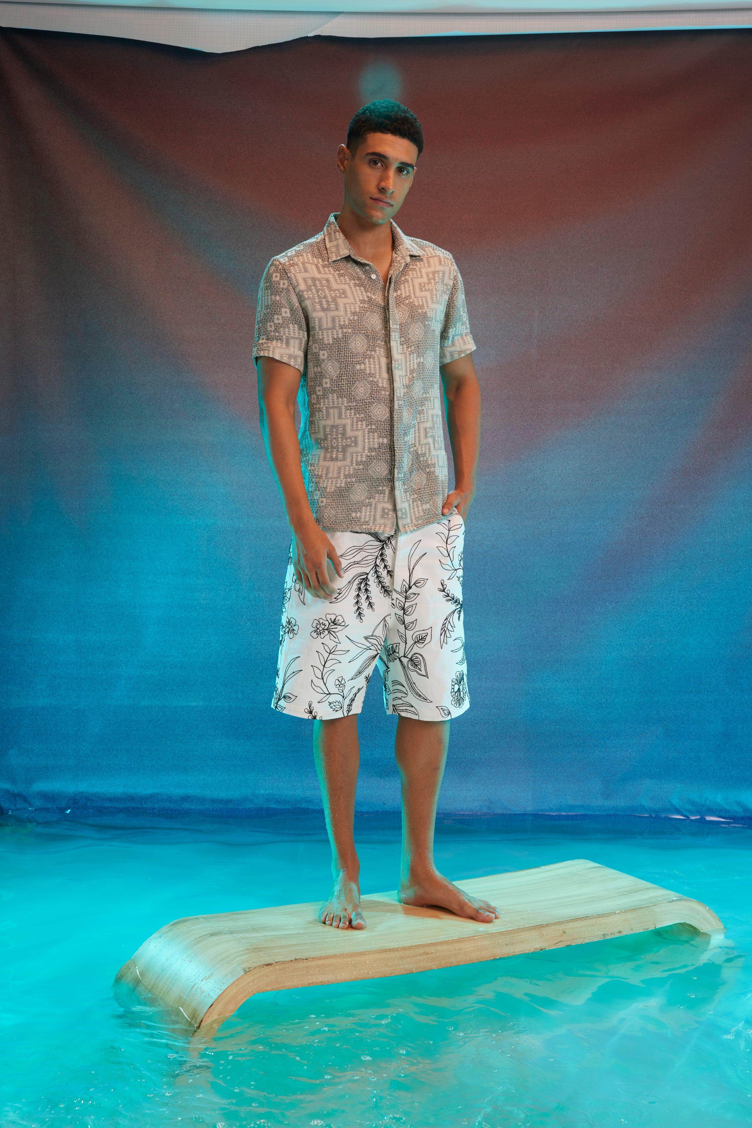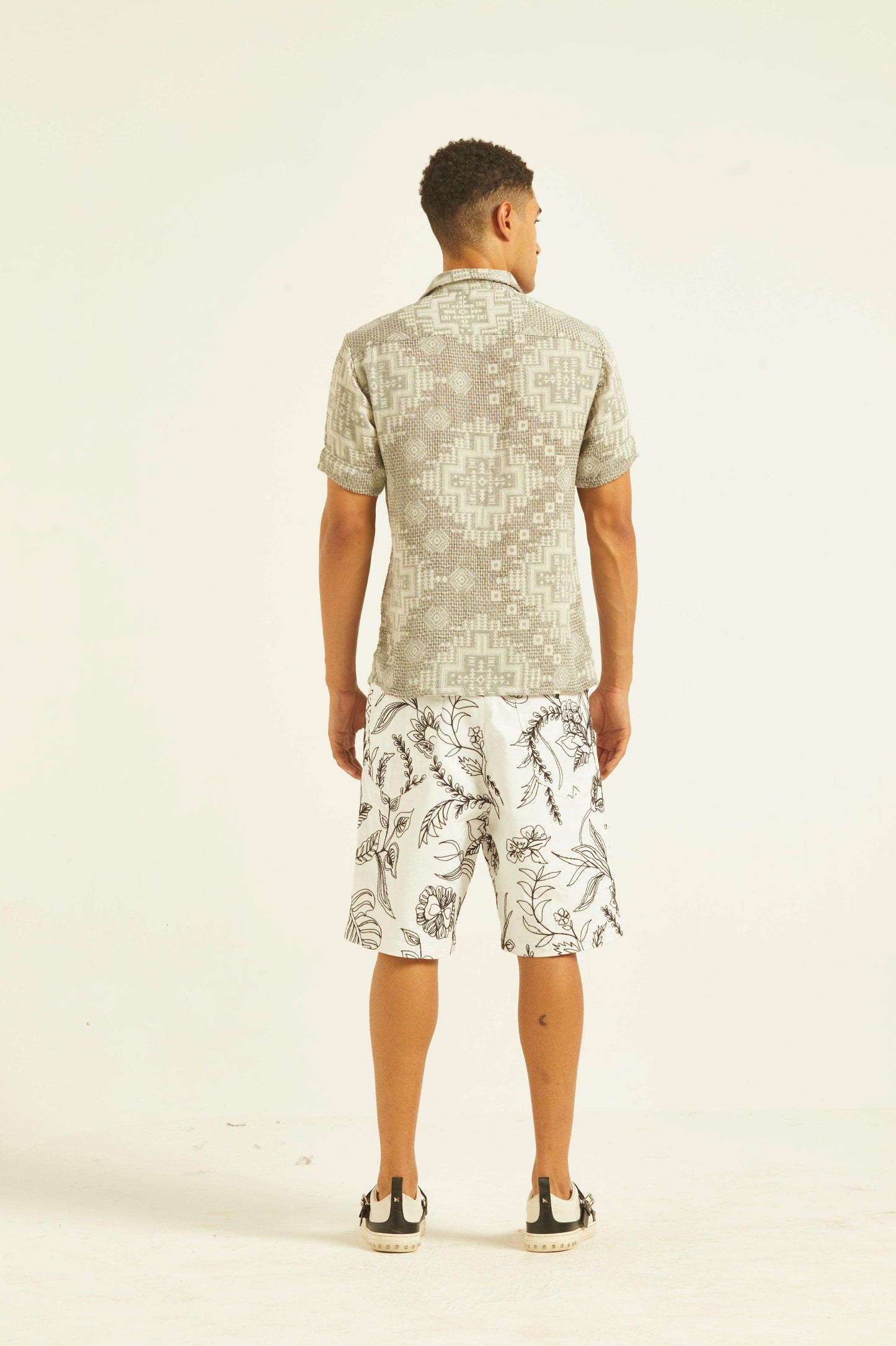 Loose weave jacquard shirt in tones of grey. Button-down front, half sleeve. Concealed placket.