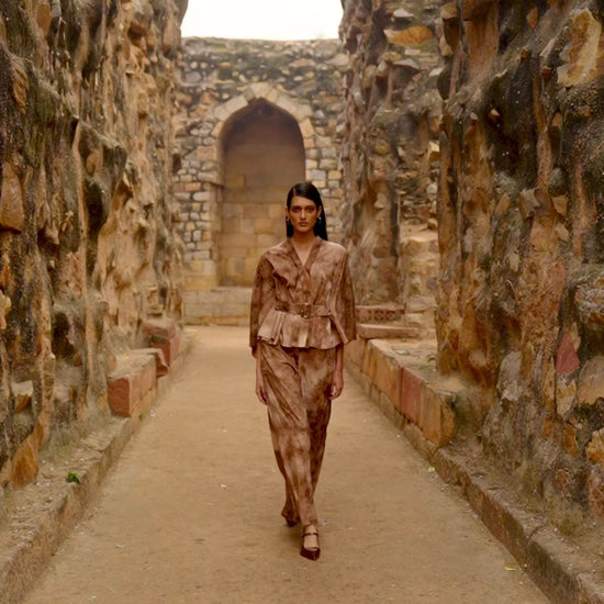 Rich tonal coffee coloured floral jacquard fabric with a tie-dye effect. Straight pant that is semi-elasticated and has a drawstring at the waist. Faux fly in the front, pockets in the sides.