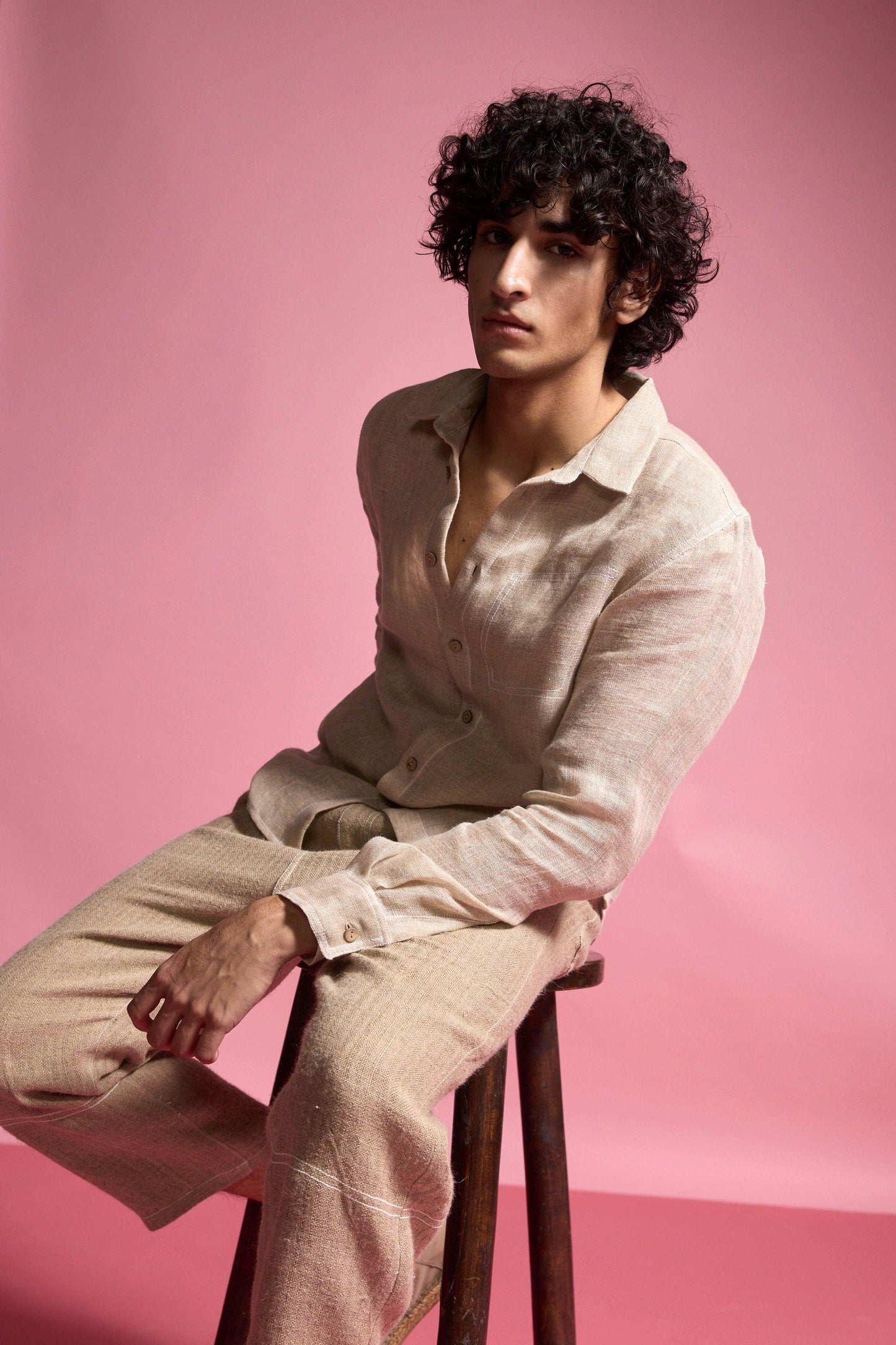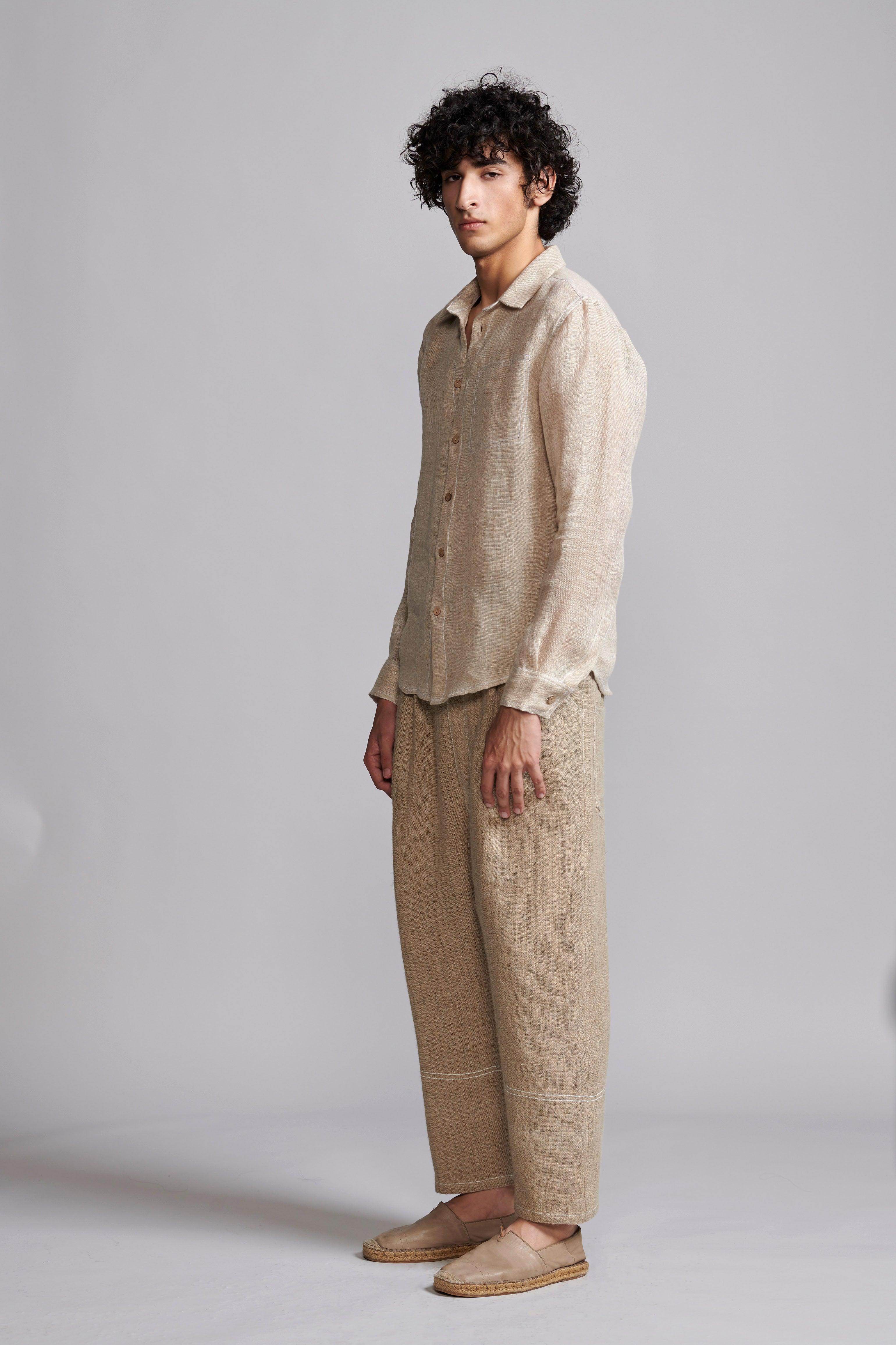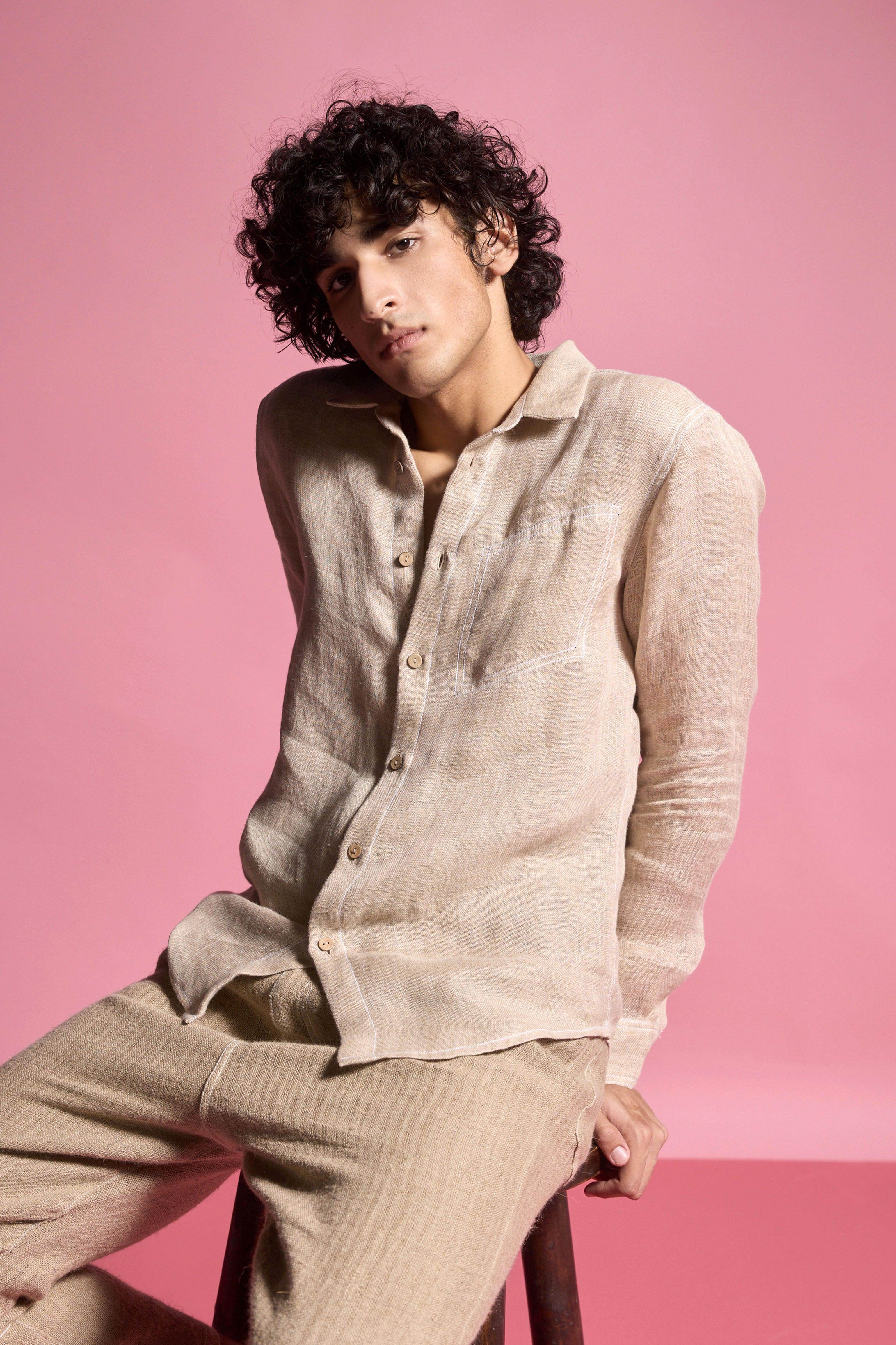 Natural lightweight soft jute shirt with contrast off-white stitch detailing on the front and seams. Features a wooden button-down placket, full sleeves, and is lined in the front and back with self fabric.