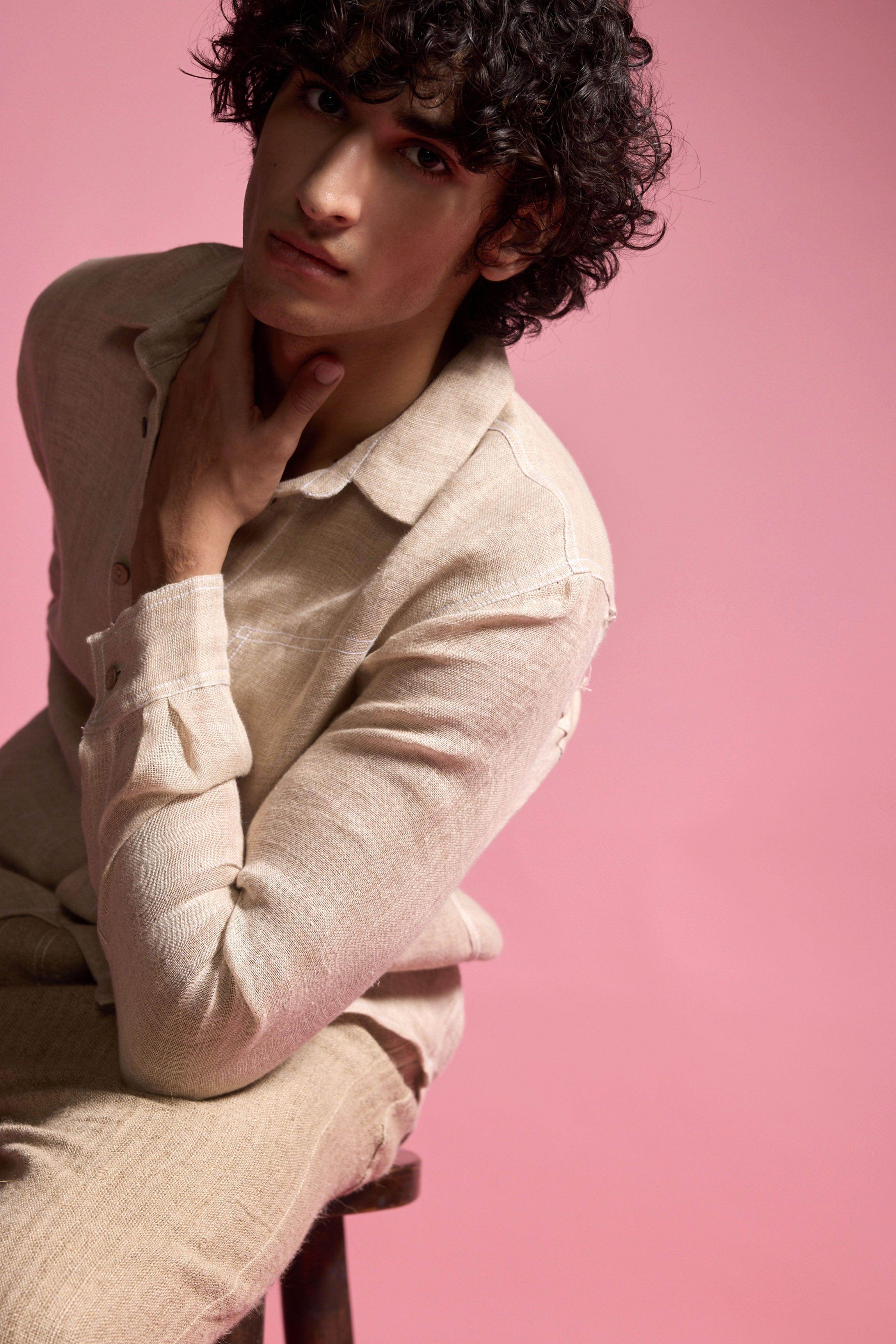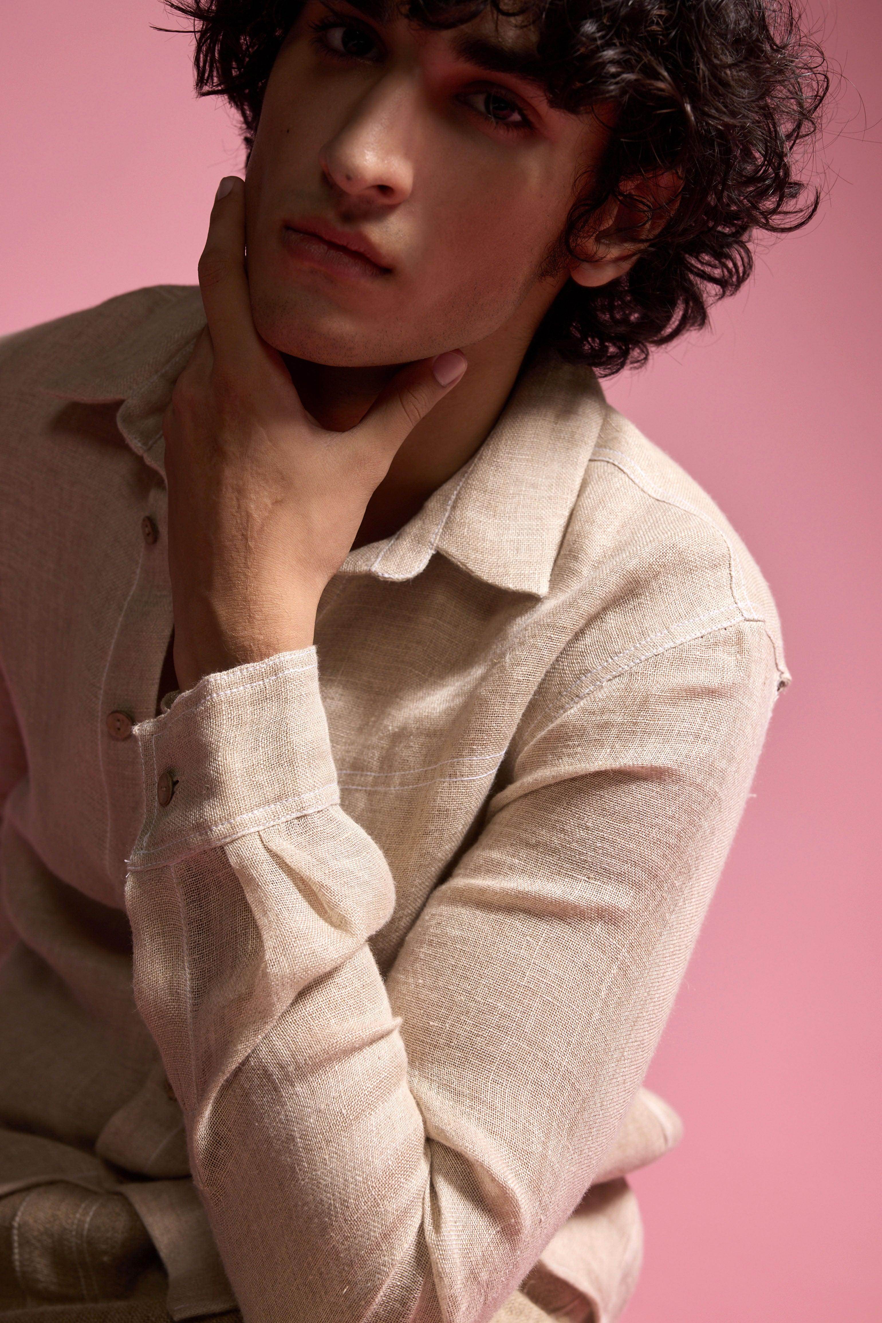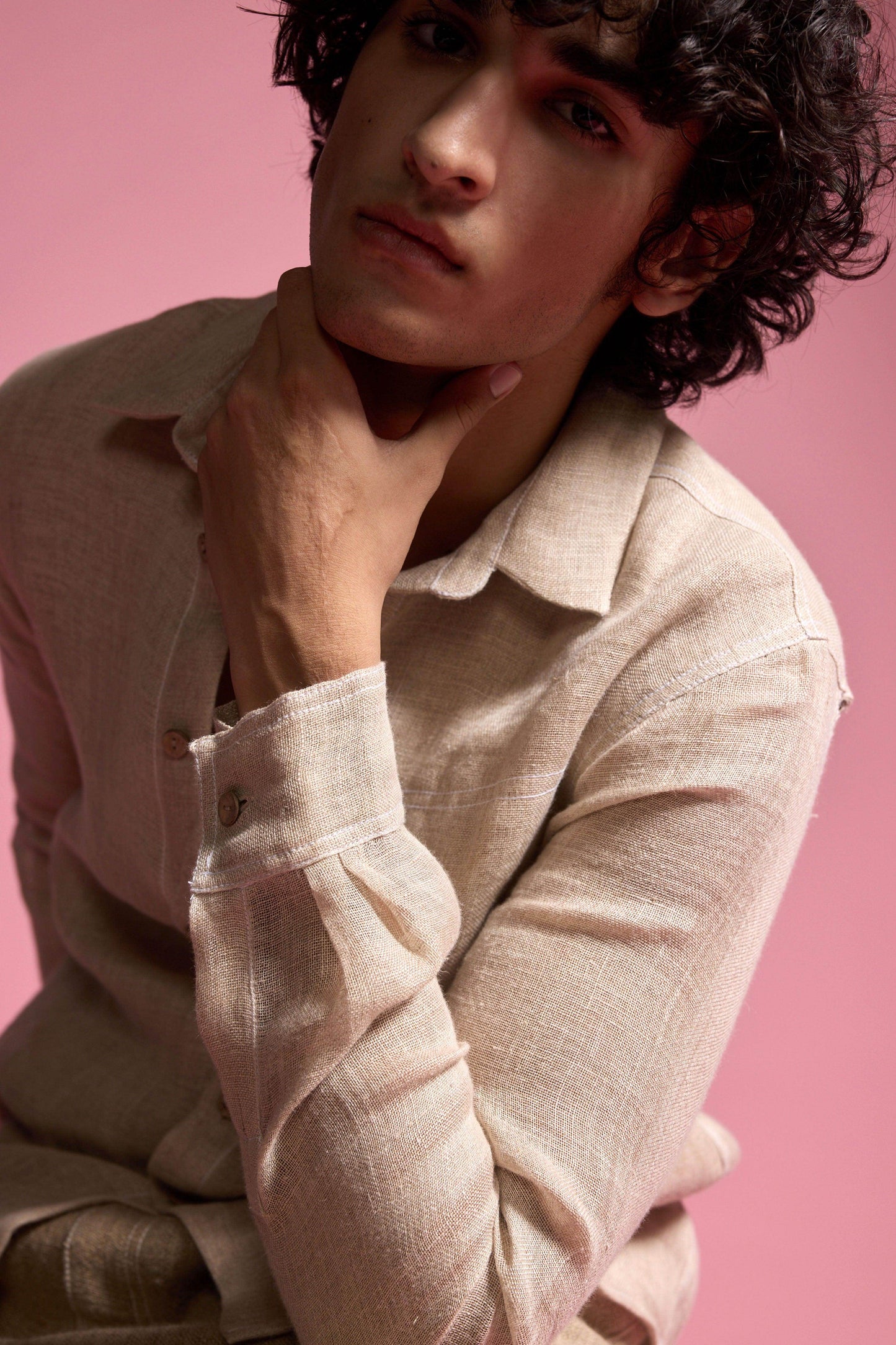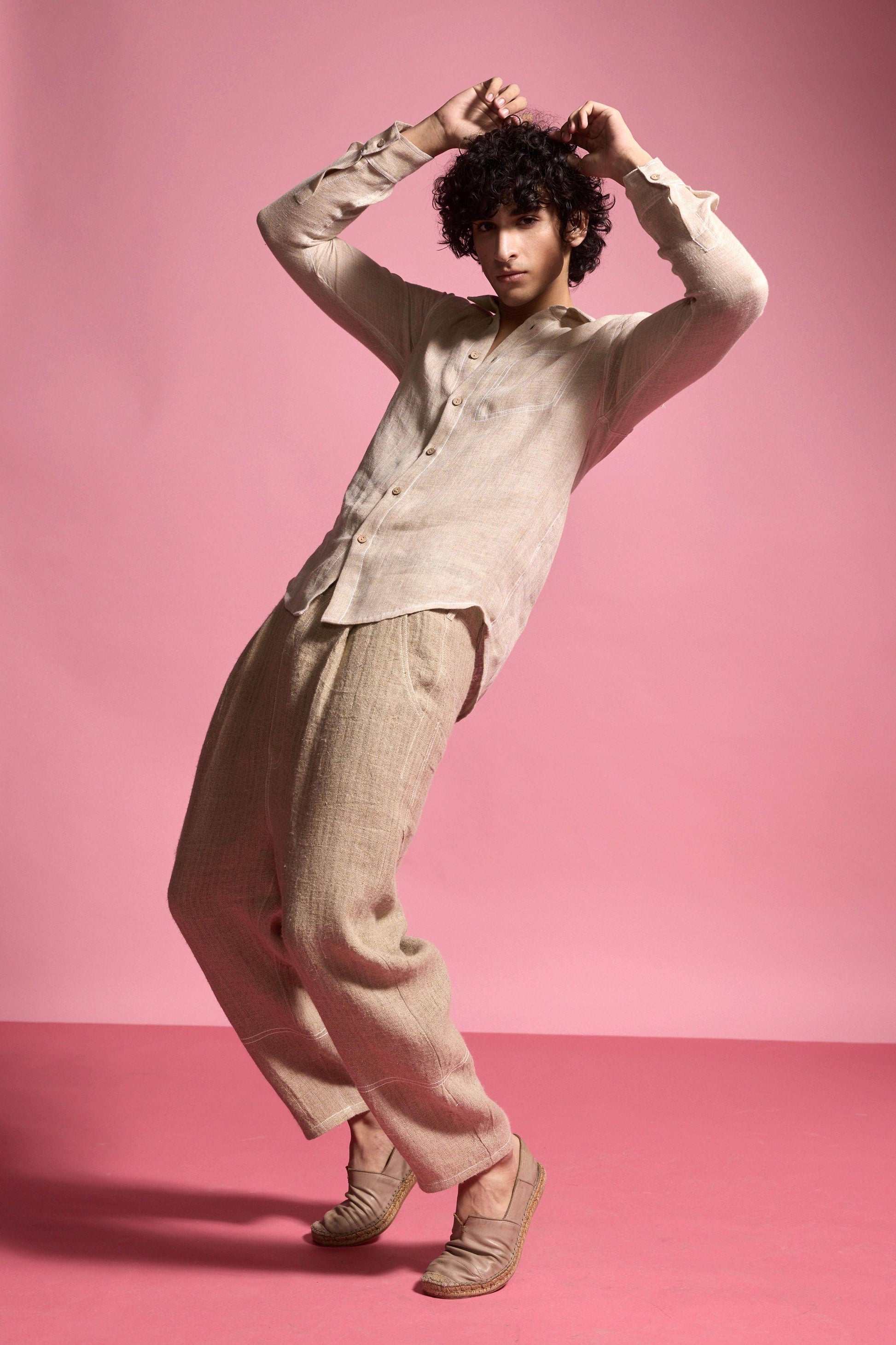 Natural lightweight soft jute shirt with contrast off-white stitch detailing on the front and seams. Features a wooden button-down placket, full sleeves, and is lined in the front and back with self fabric.