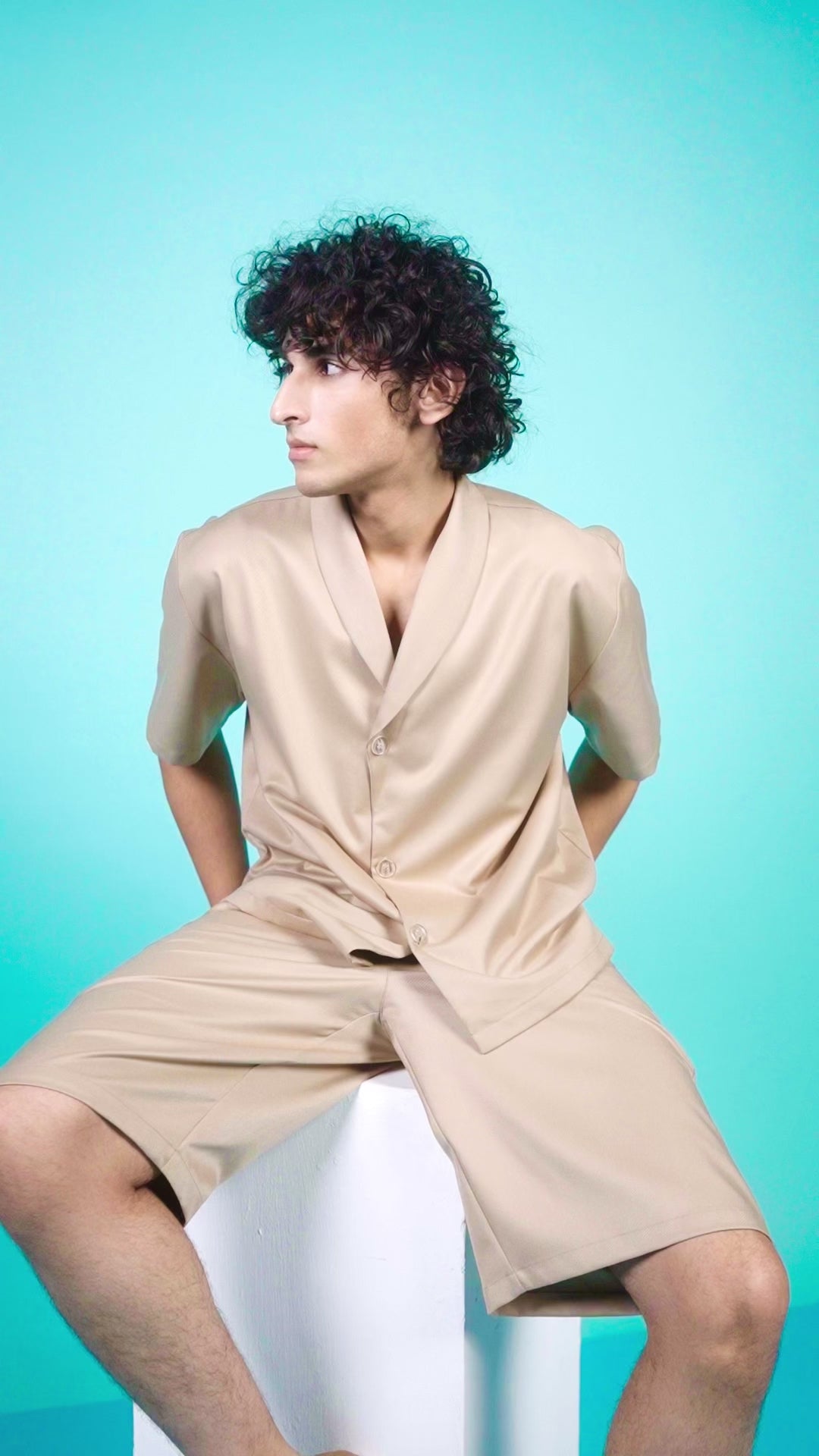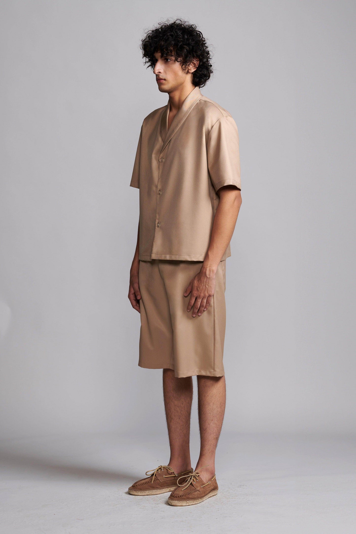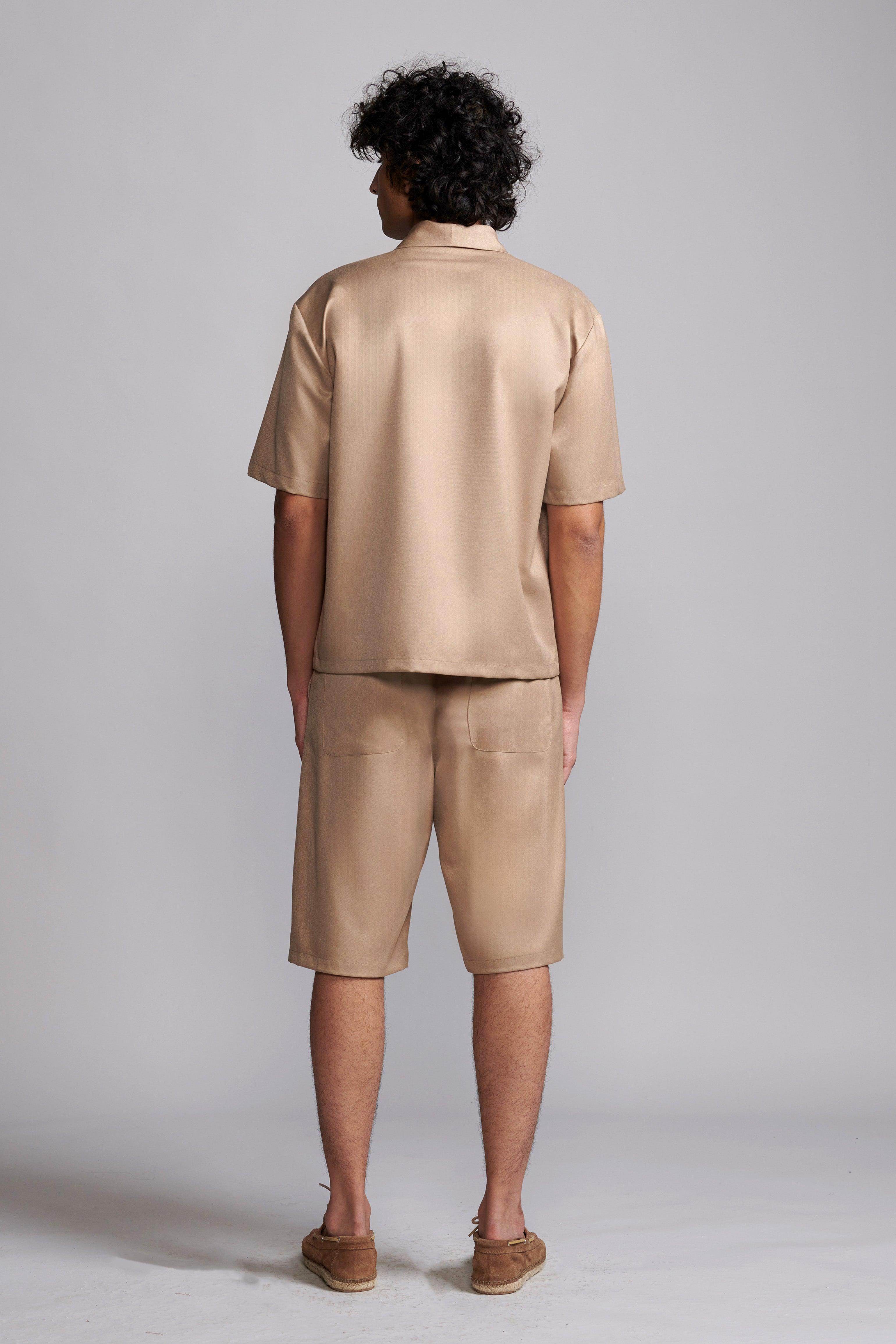 Khaki shorts in all-weather suiting material. Features an elasticated waistband with drawstrings, button and zip closure, and side and back pockets.