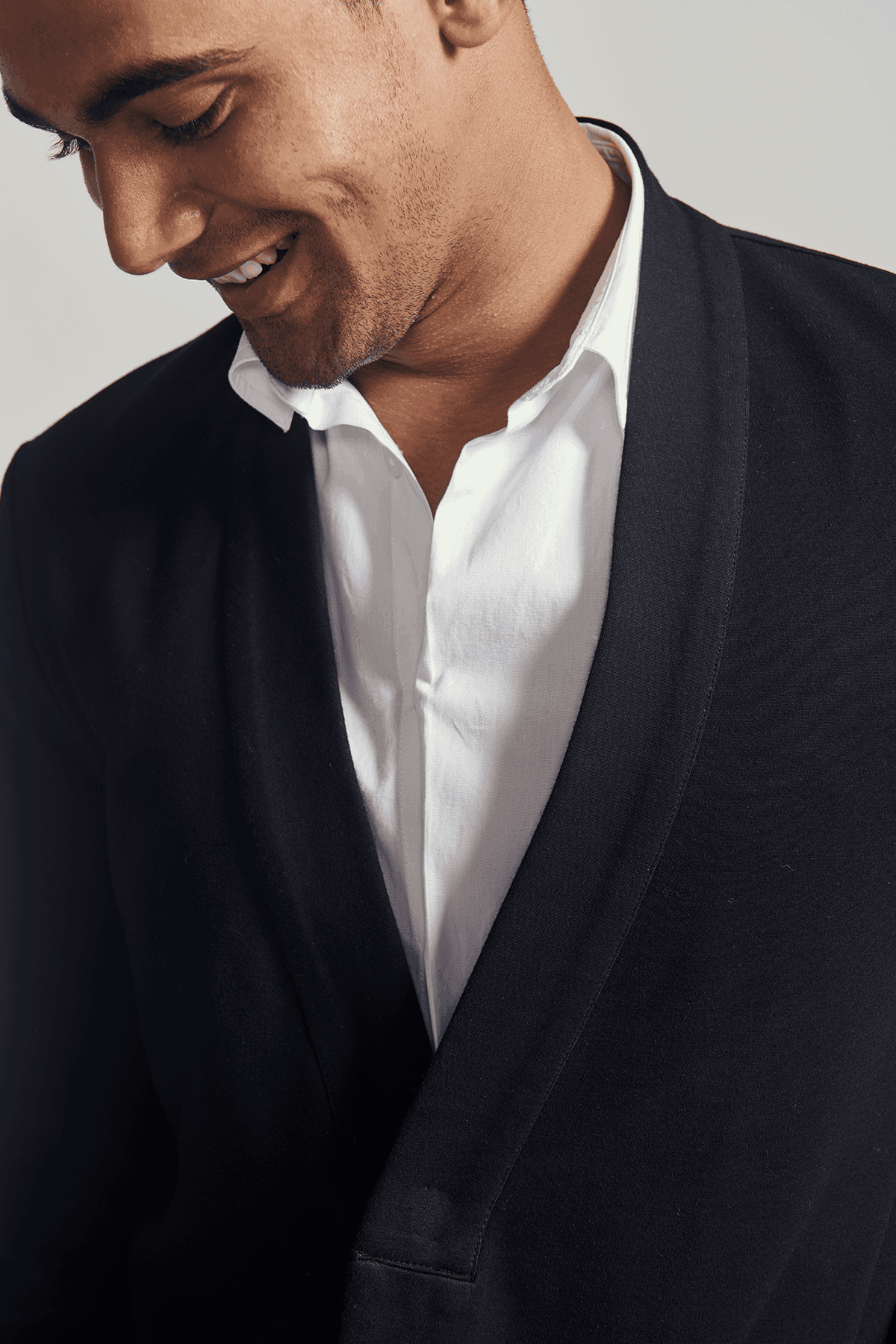 Work•Play. Formal aesthetic, lounge fabric. Comfortable, stretch-knit jacket. Single front snap button. Asian inspired set-in shawl lapel.