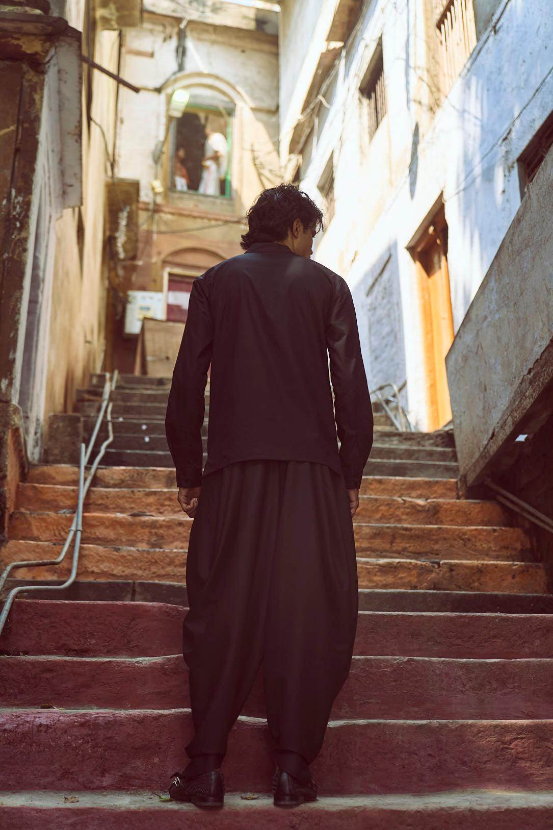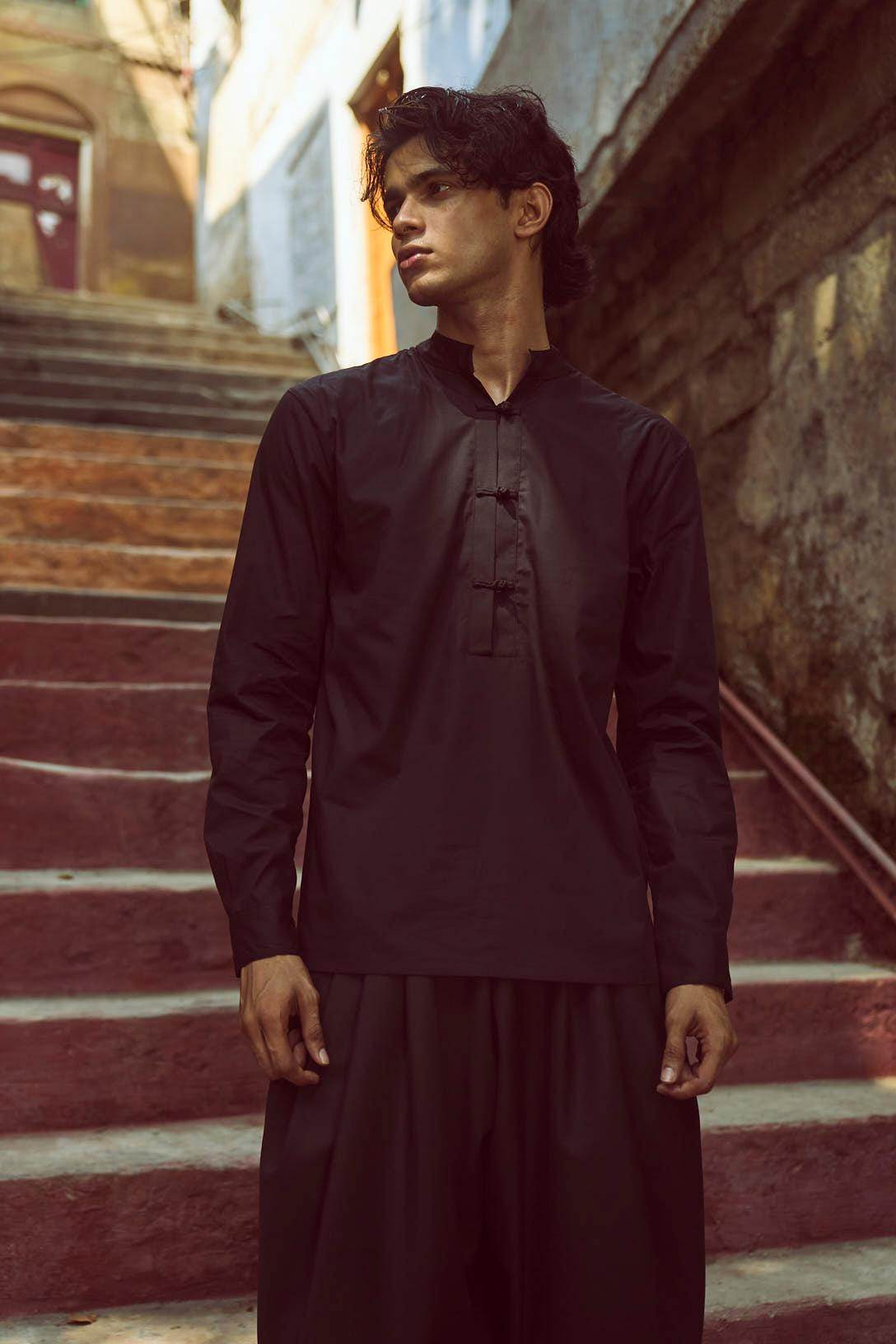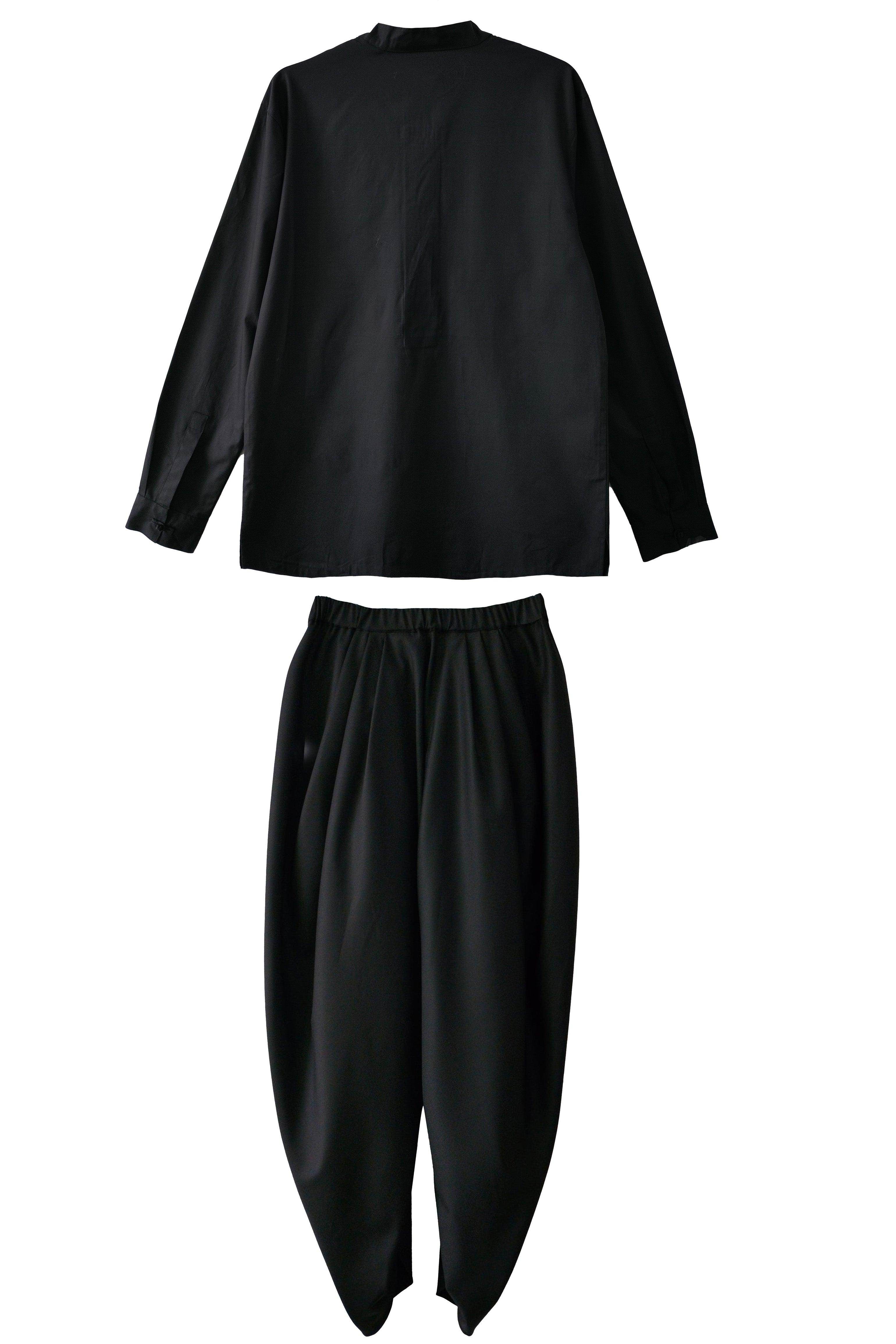 Black band collar full sleeve popover shirt in cotton poplin. With oriental-style hand-knotted buttons and loop detailing at the front placket and cuff. Regular fit. Paired with black cowl pants in all weather suiting material. Dhoti-inspired draped pleat detail at add volume. Elasticated waist. Comfort fit.