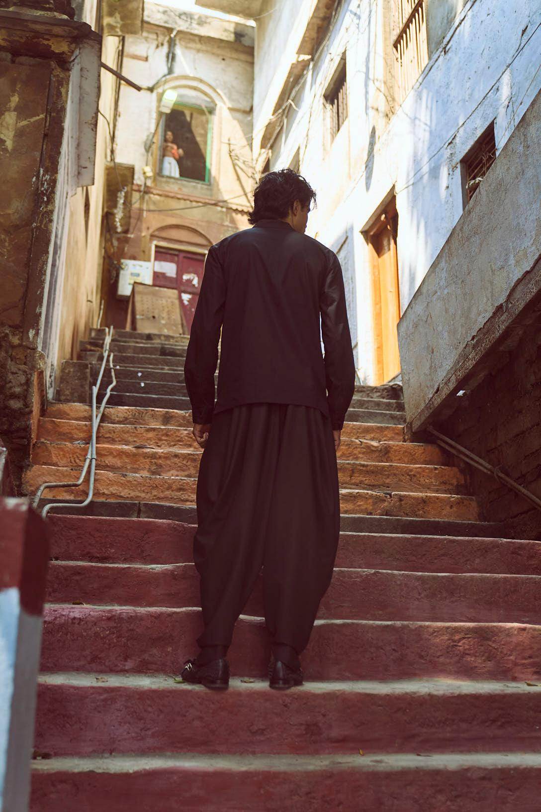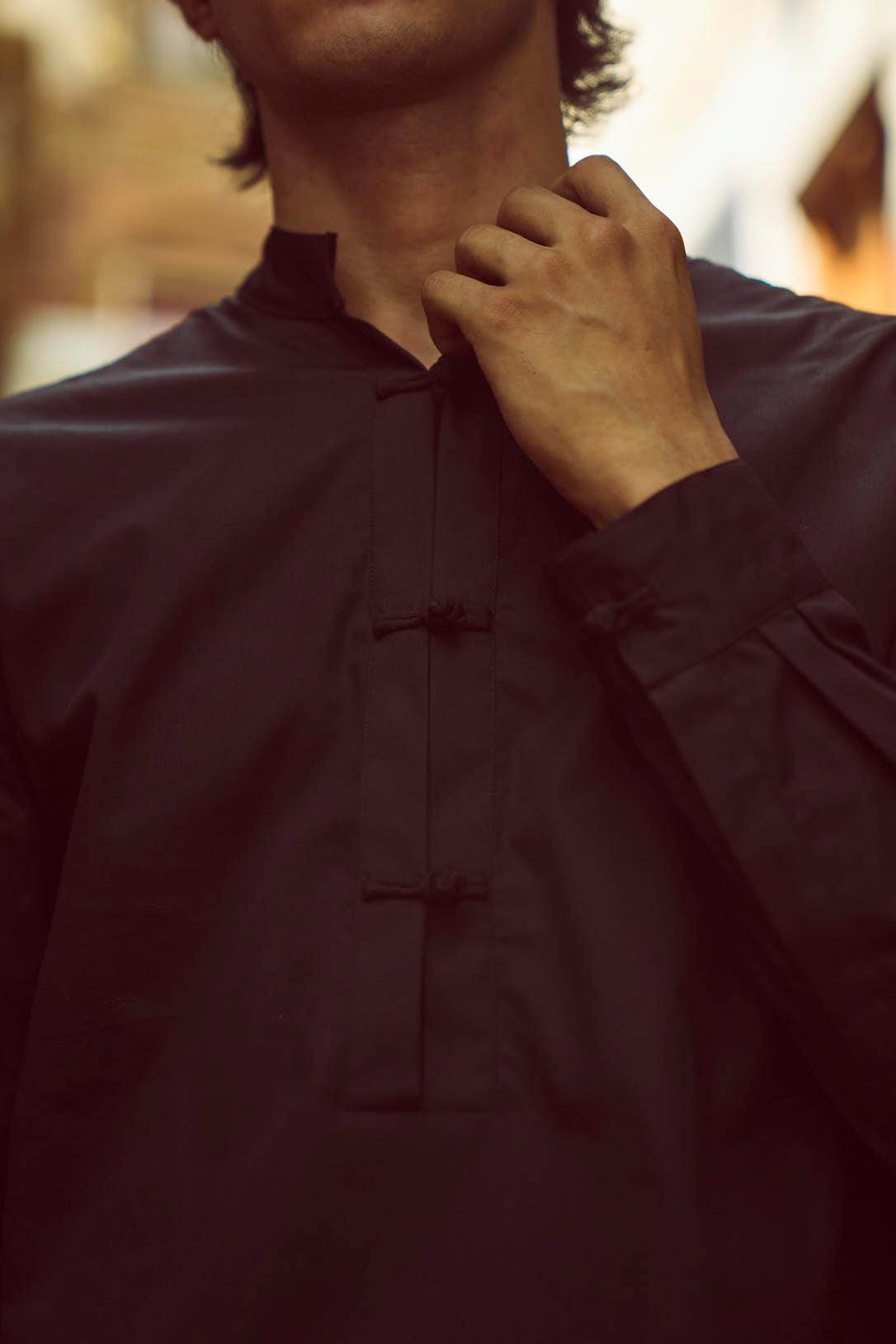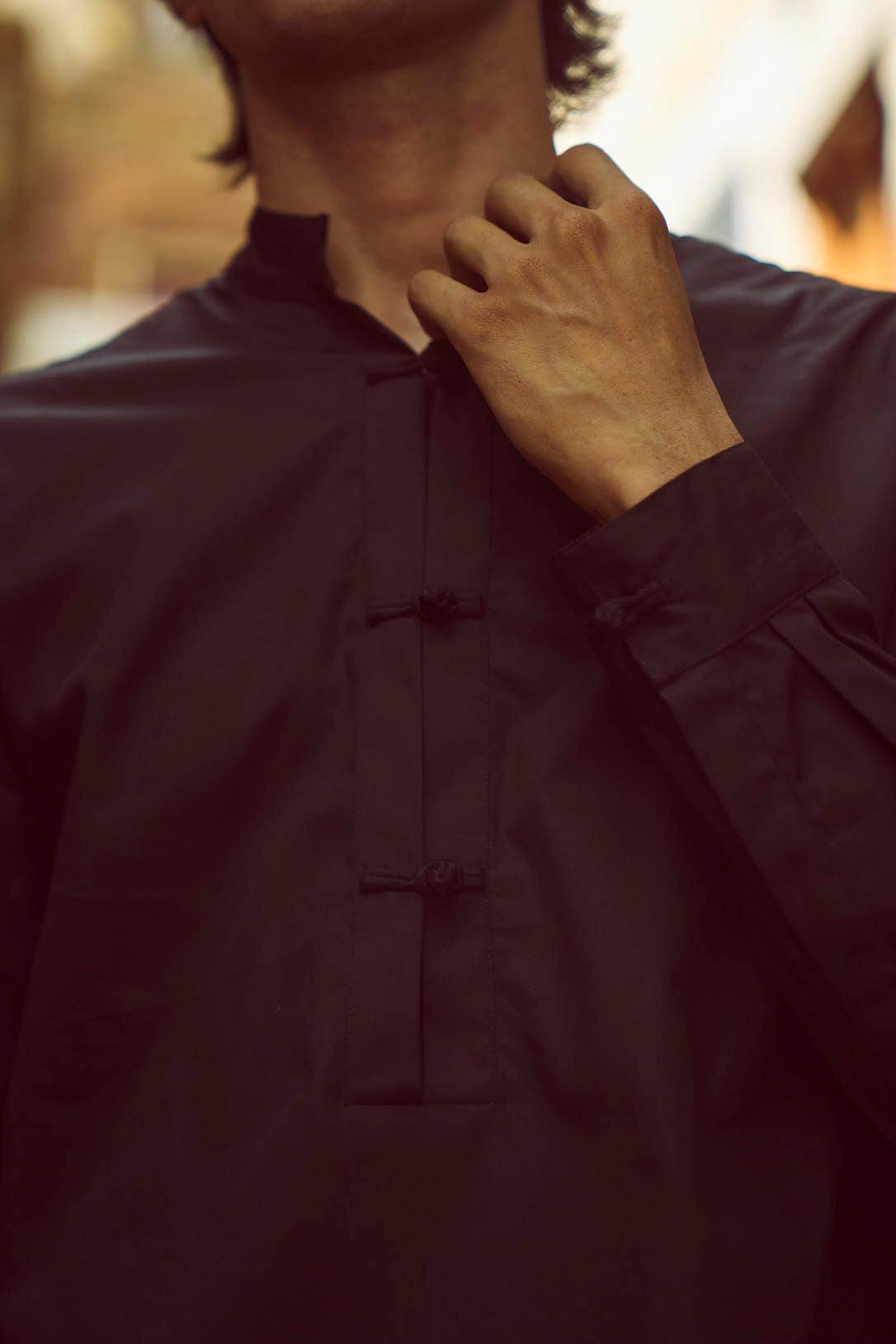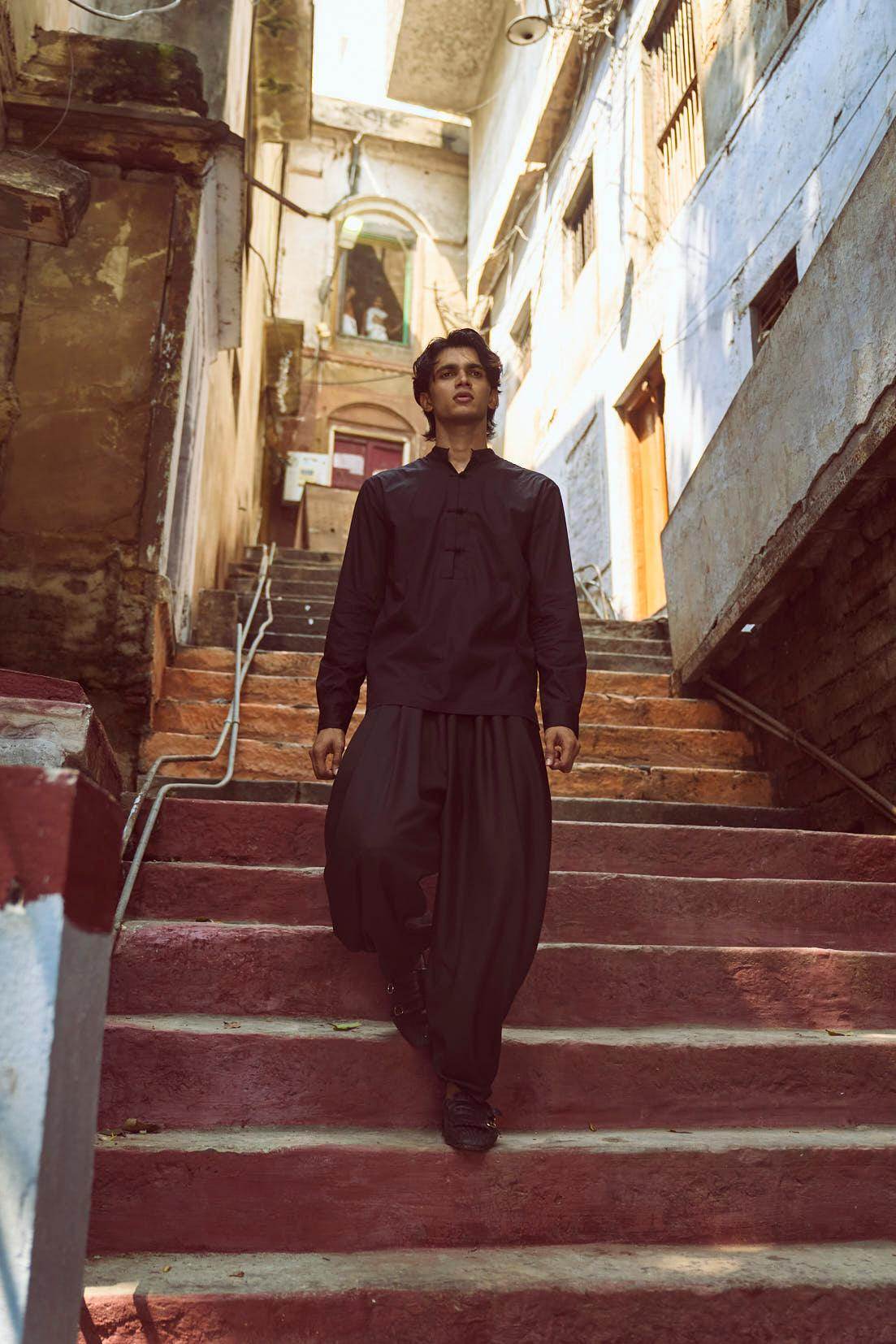 Black band collar full sleeve popover shirt in cotton poplin. With oriental-style hand-knotted buttons and loop detailing at the front placket and cuff. Regular fit. Paired with black cowl pants in all weather suiting material. Dhoti-inspired draped pleat detail at add volume. Elasticated waist. Comfort fit.