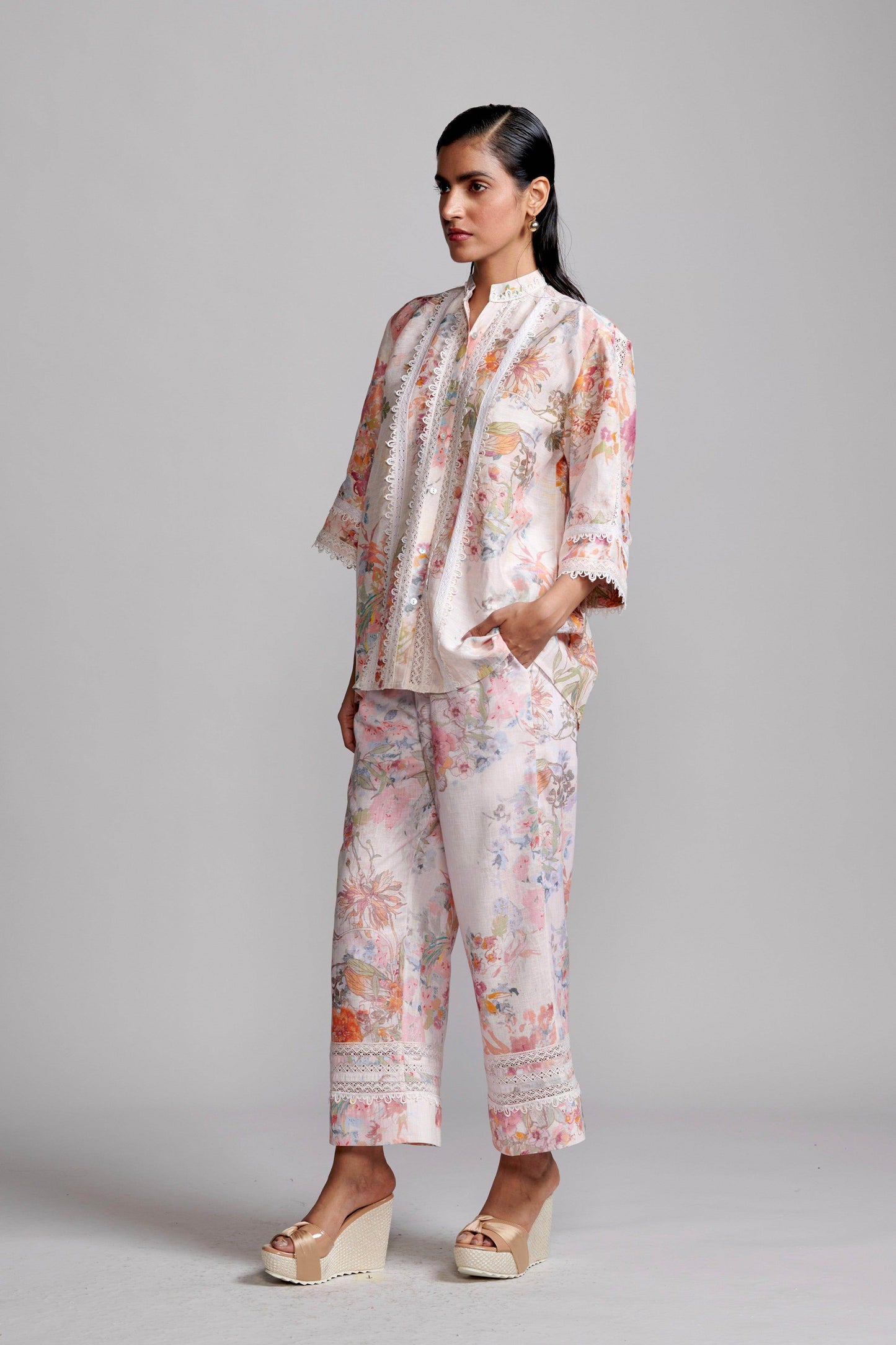 Pastel multi-floral print on a breathable natural linen blend base. Features natural contrast laces on the bottom hem border. Elasticated waist with drawstring. Side pockets. Lined to the shorts. Relaxed fit.