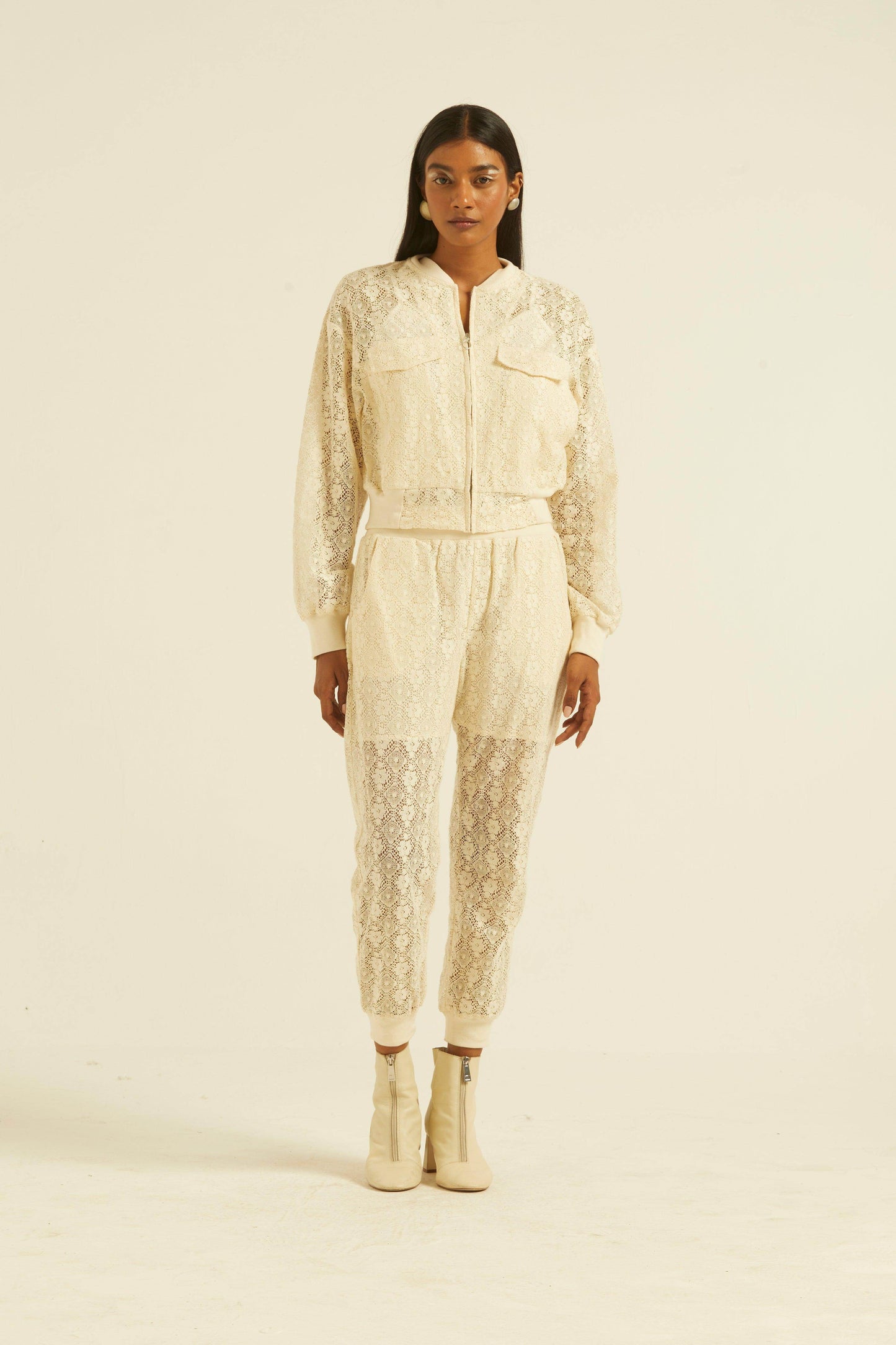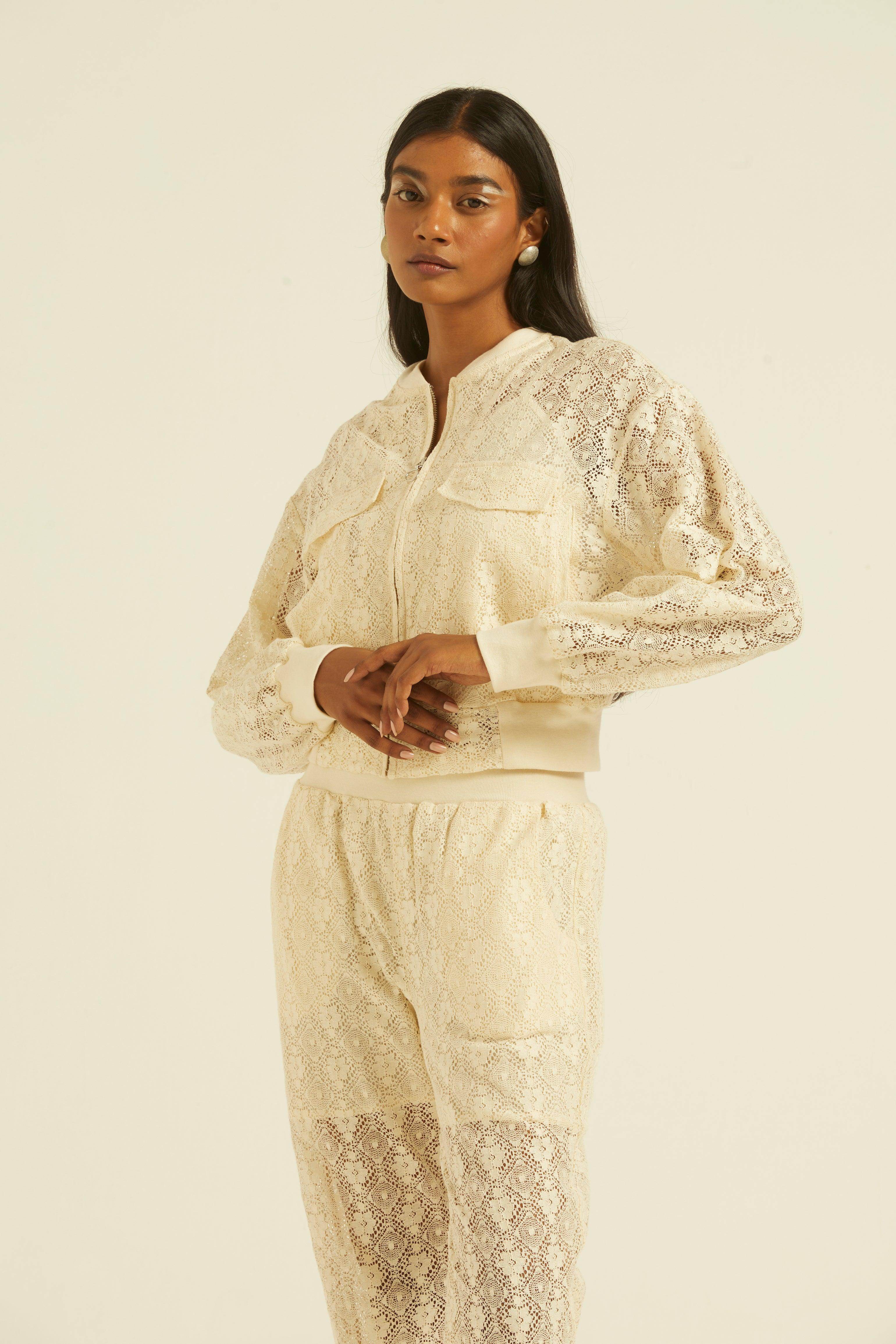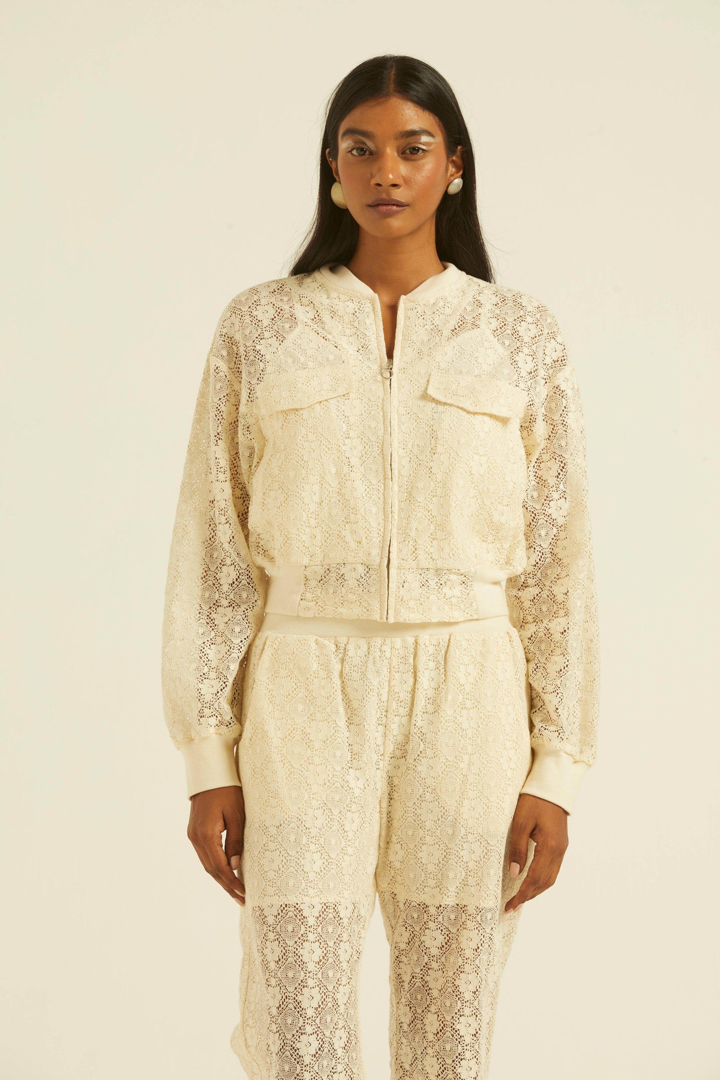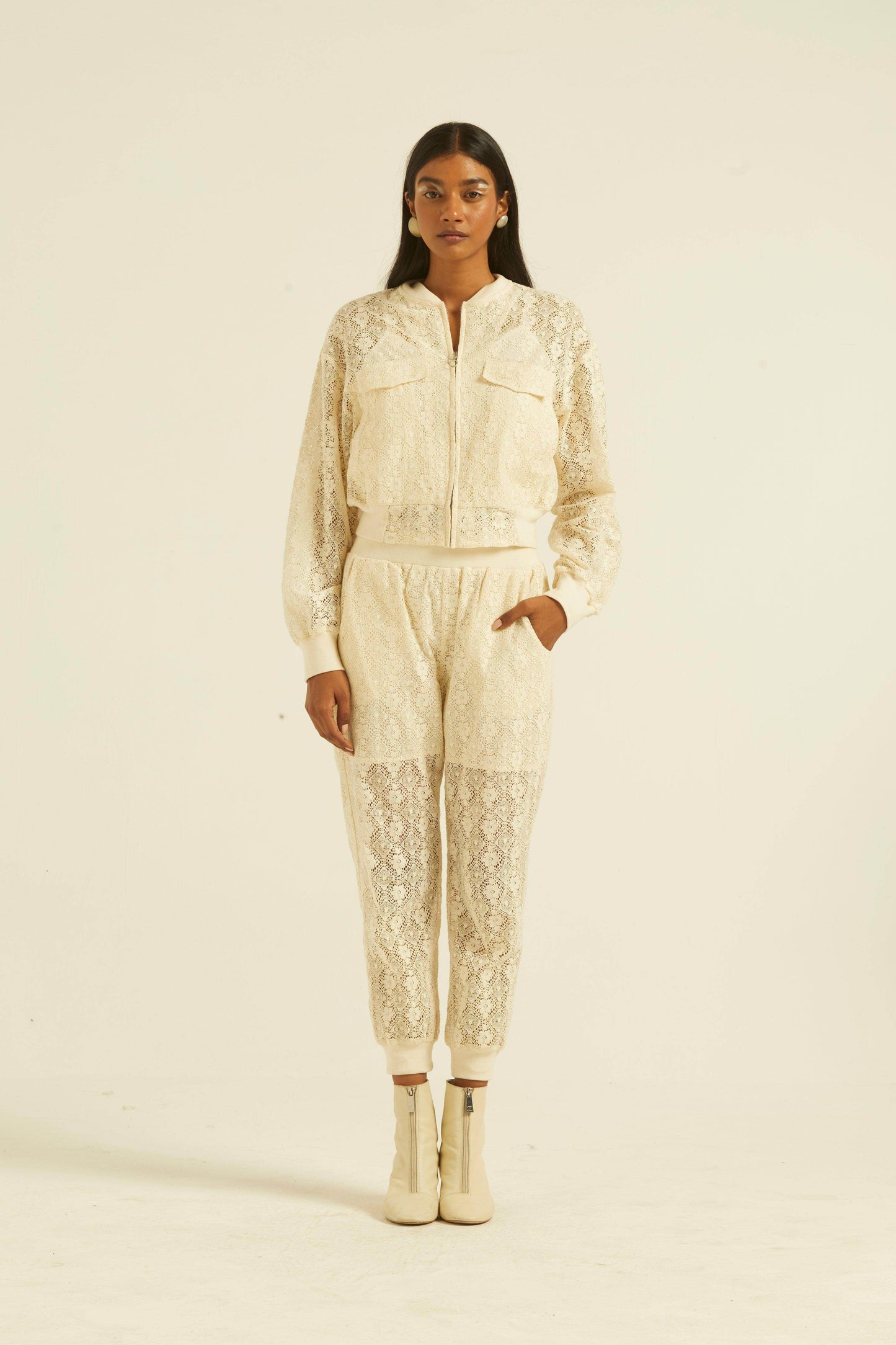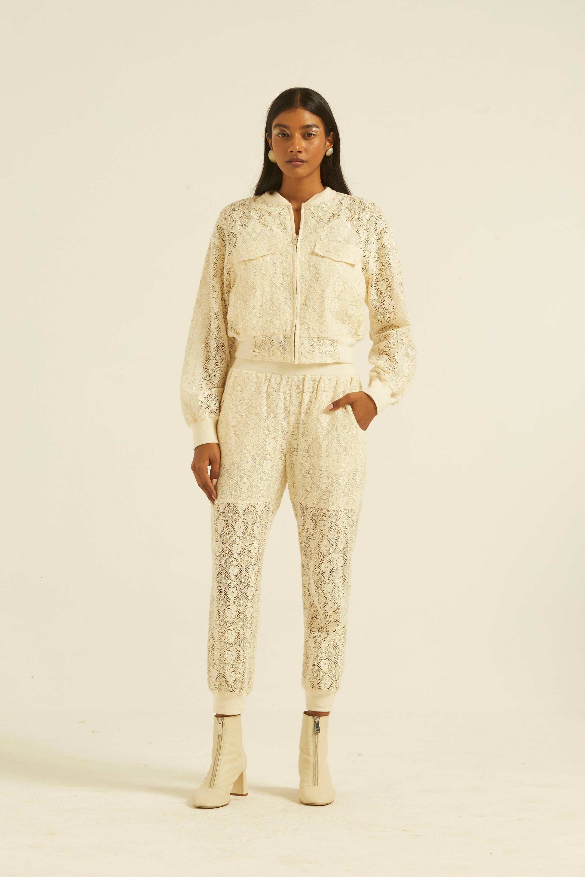 Bomber jacket and jogger set in cotton lace fabric. Decorative flap pocket detail at the jacket front. Organic cotton rib at the neckline, hem and sleeve cuffs. Zip front open, pockets in the side. The jogger is lined till shorts.