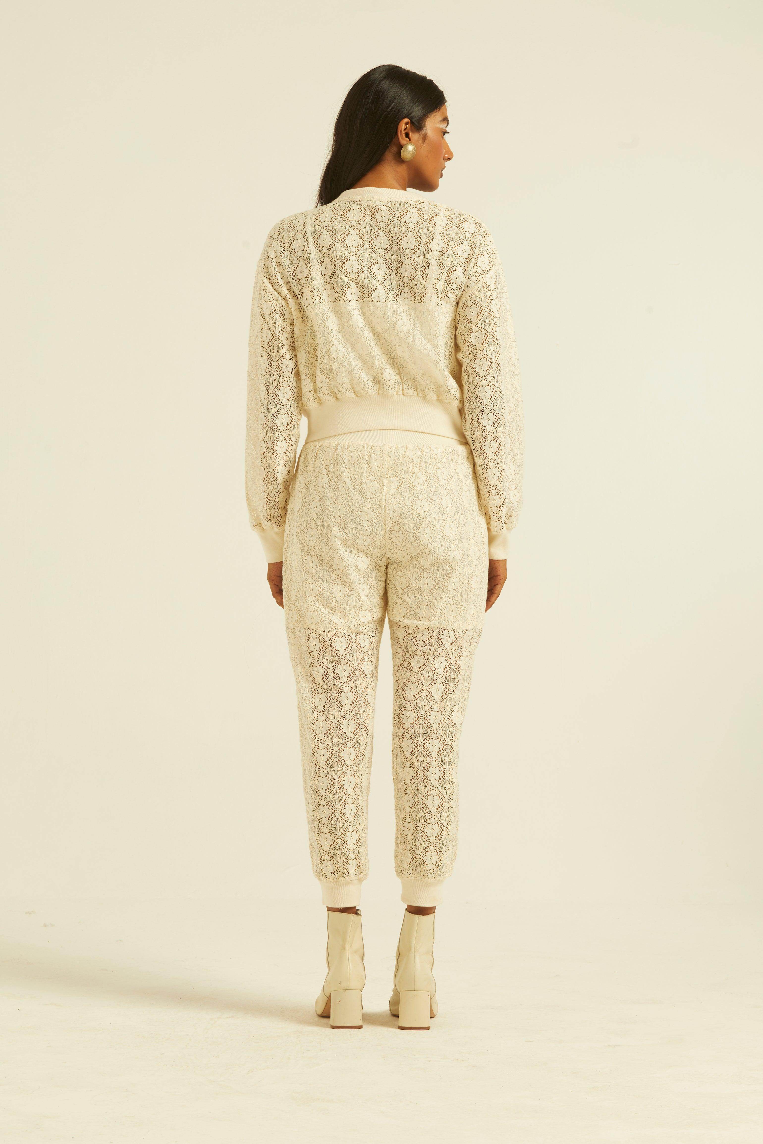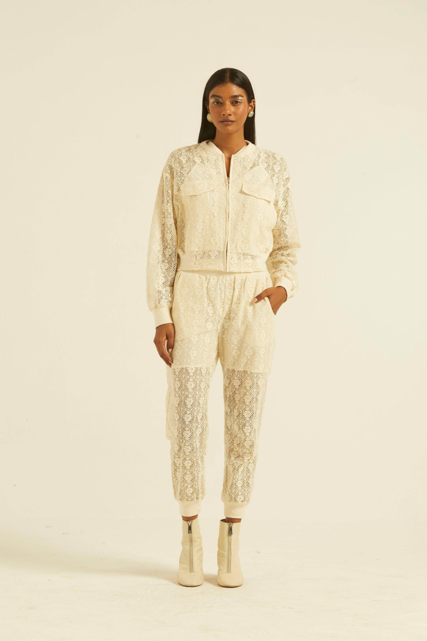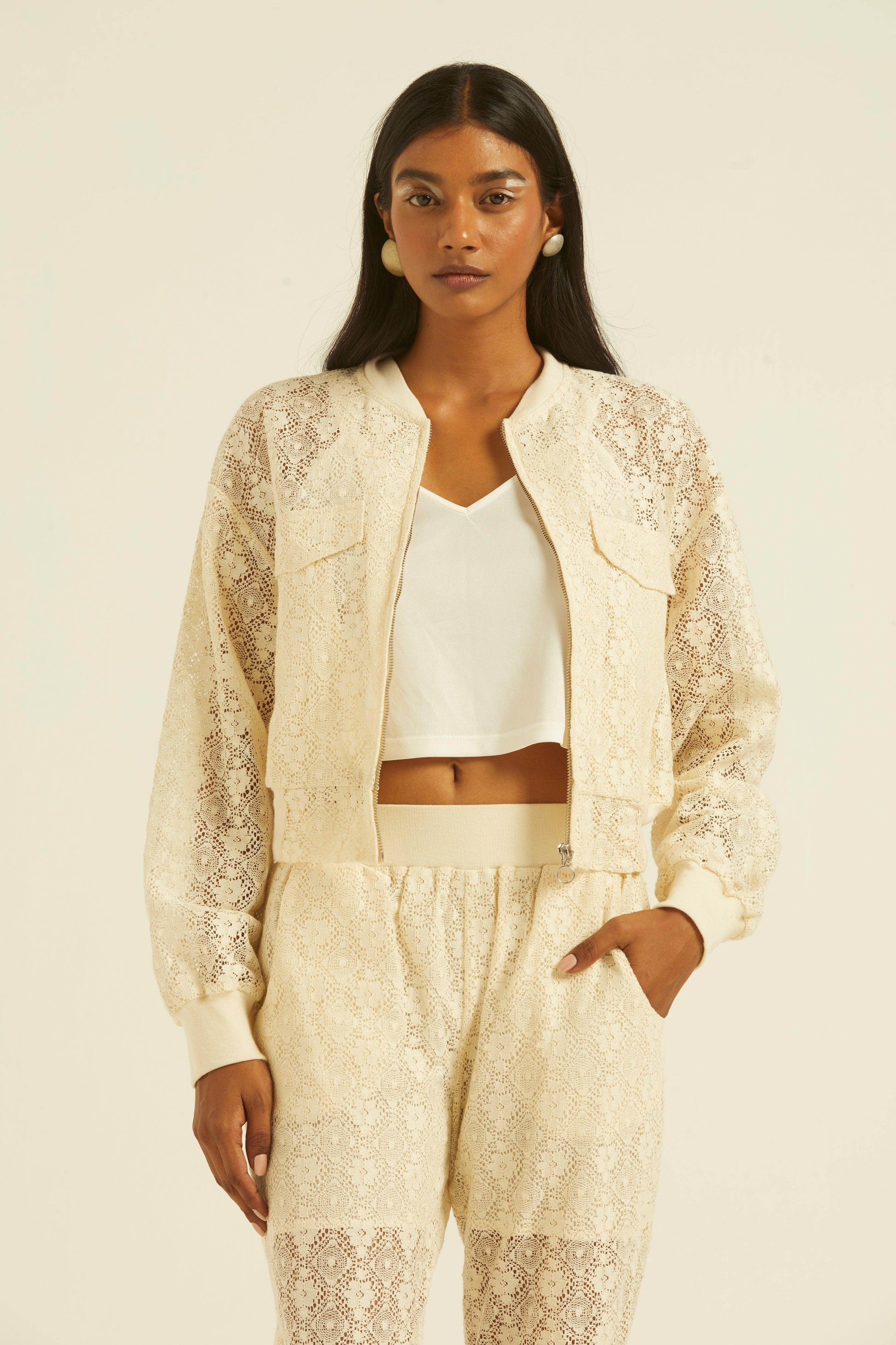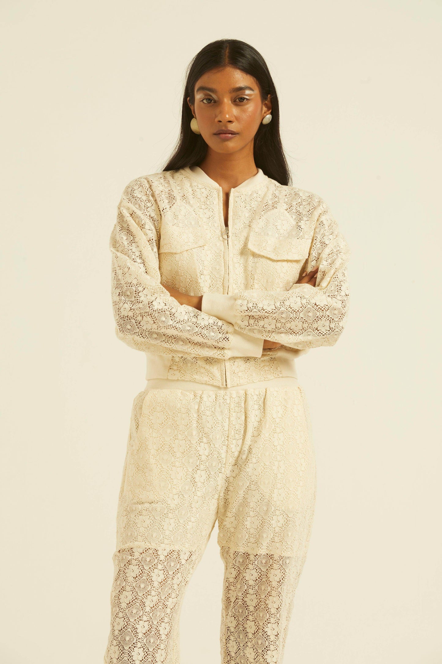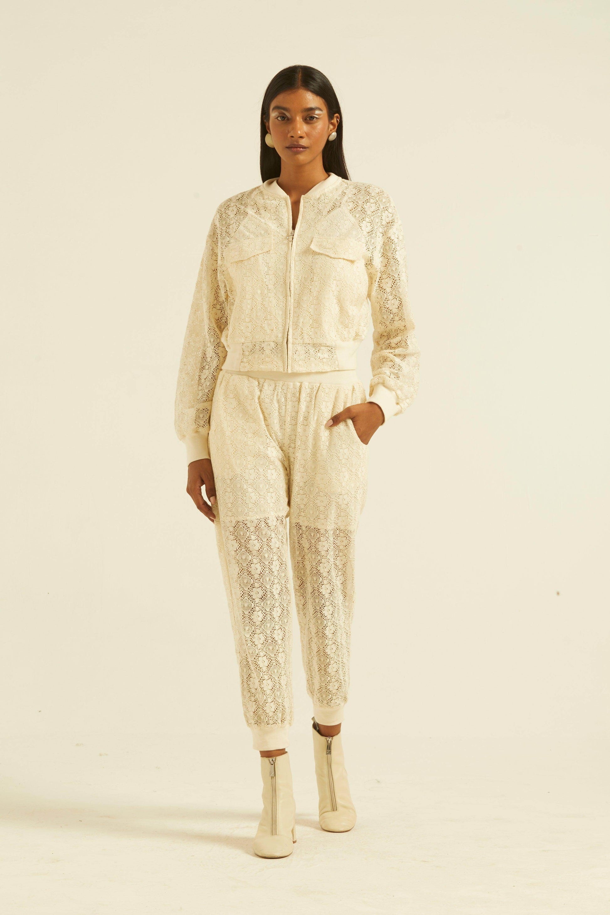 Bomber jacket and jogger set in cotton lace fabric. Decorative flap pocket detail at the jacket front. Organic cotton rib at the neckline, hem and sleeve cuffs. Zip front open, pockets in the side. The jogger is lined till shorts.