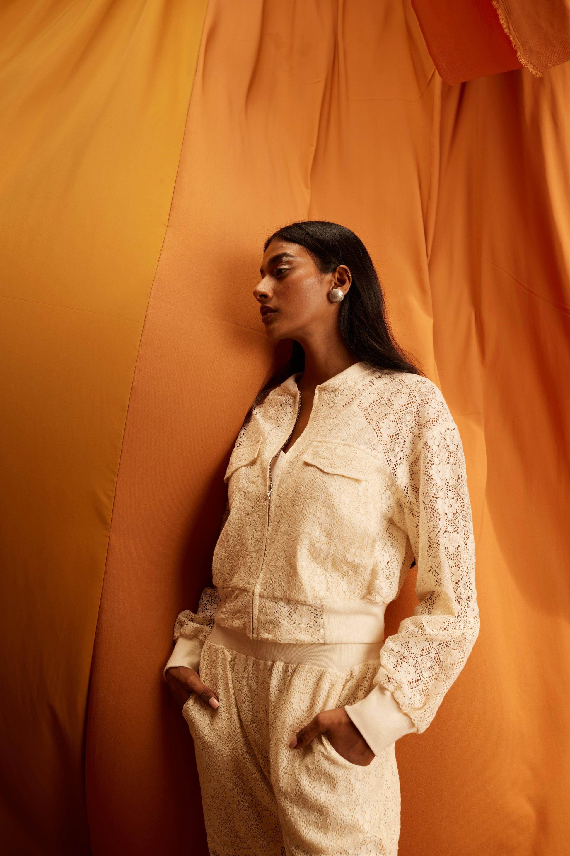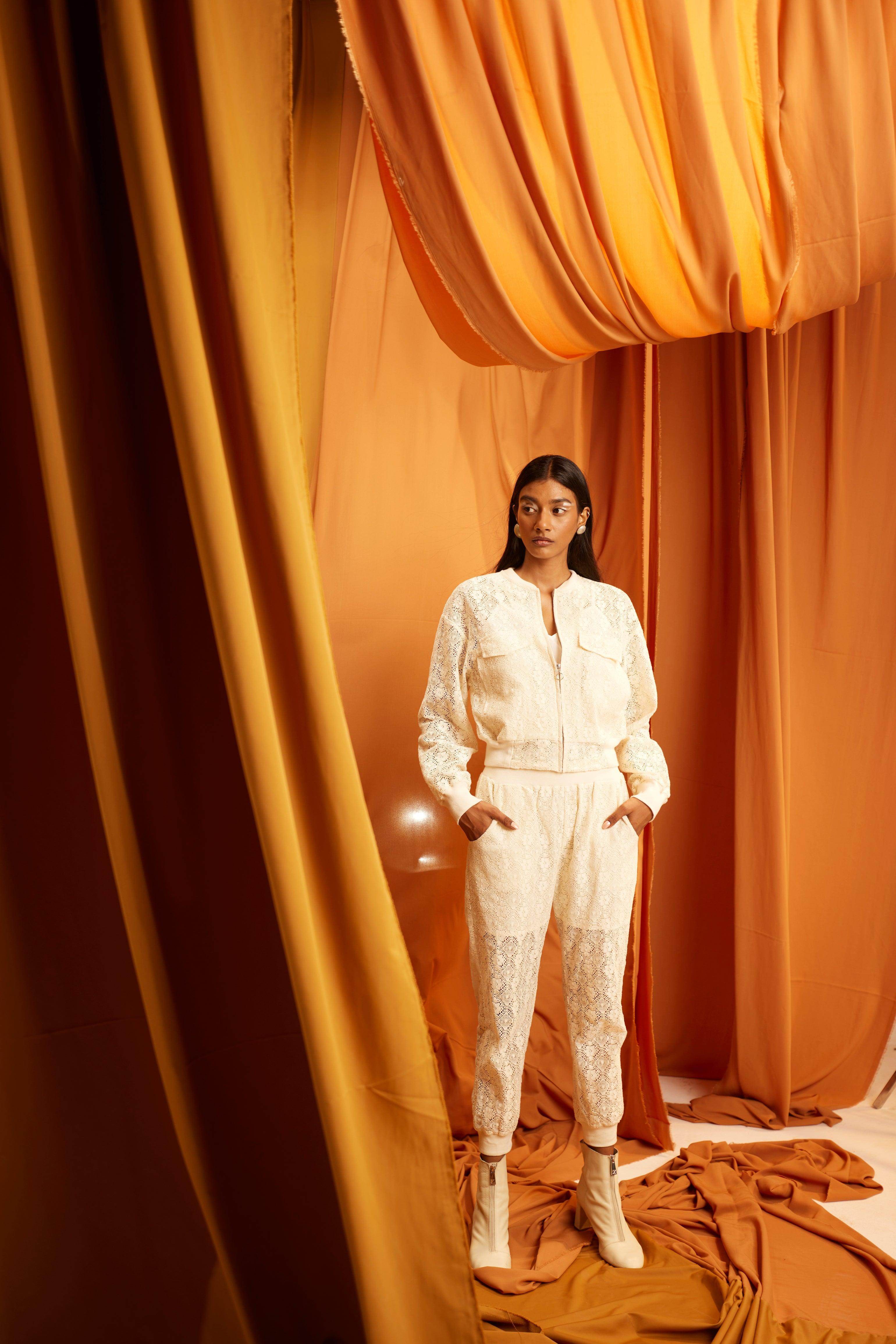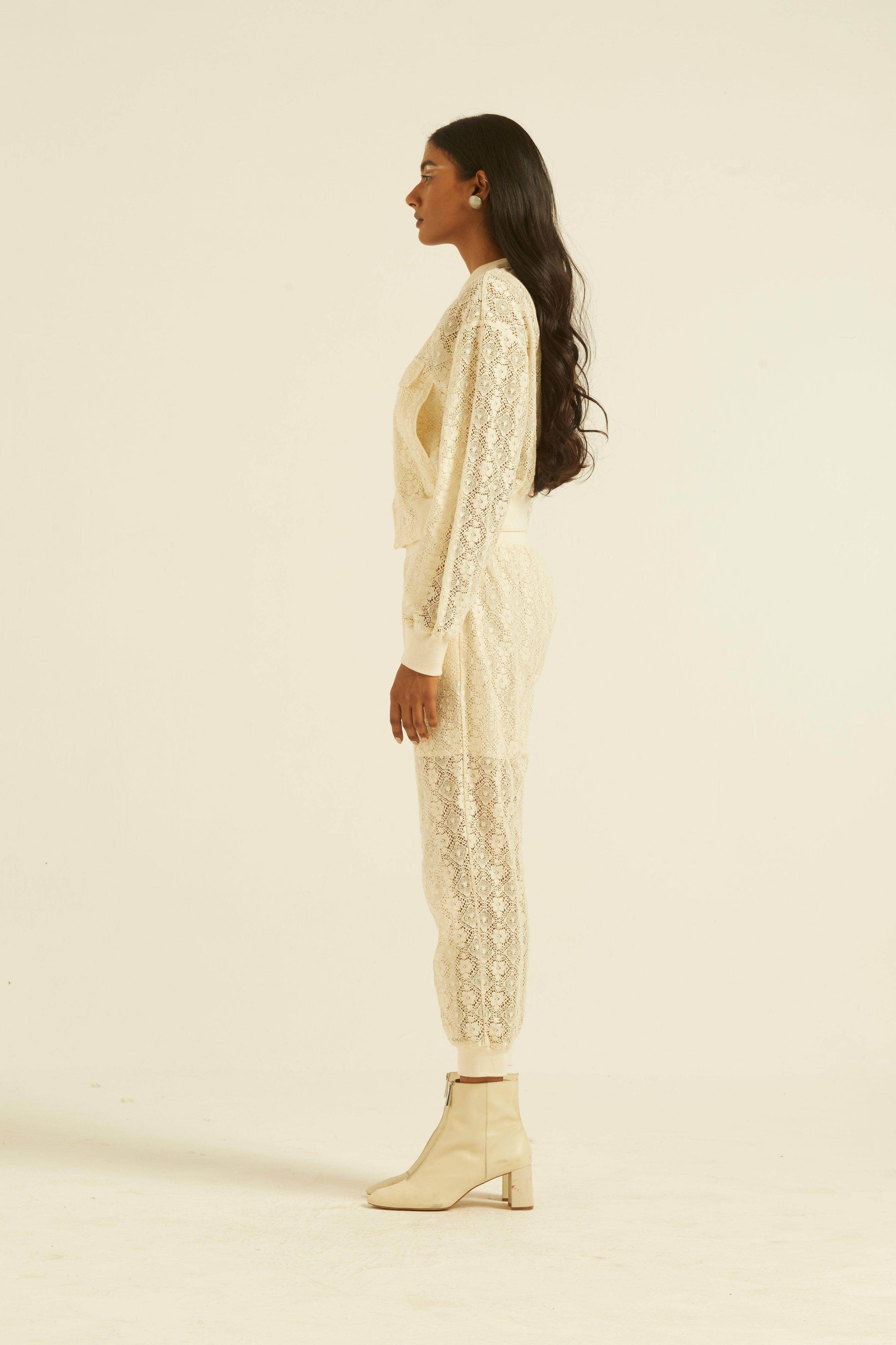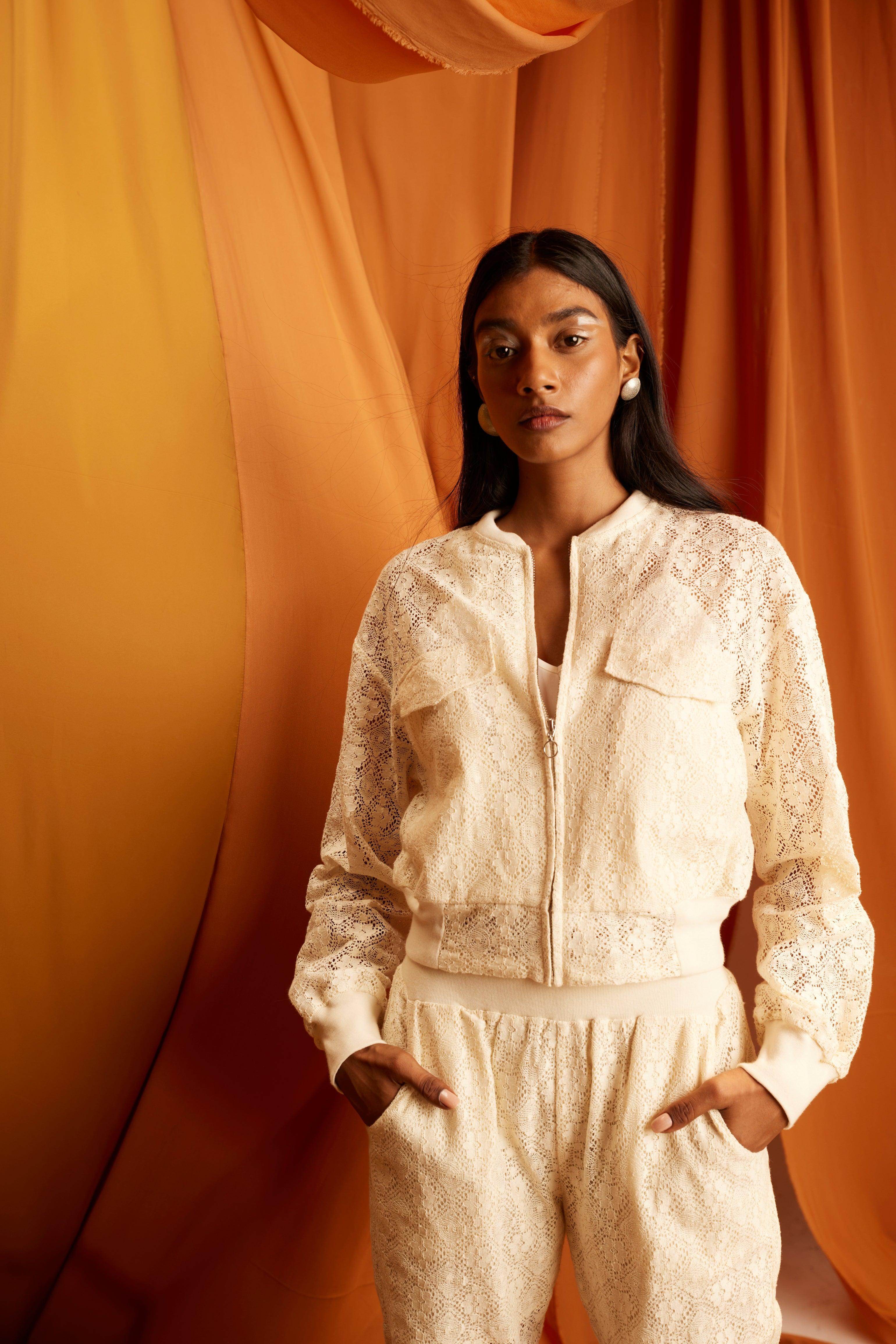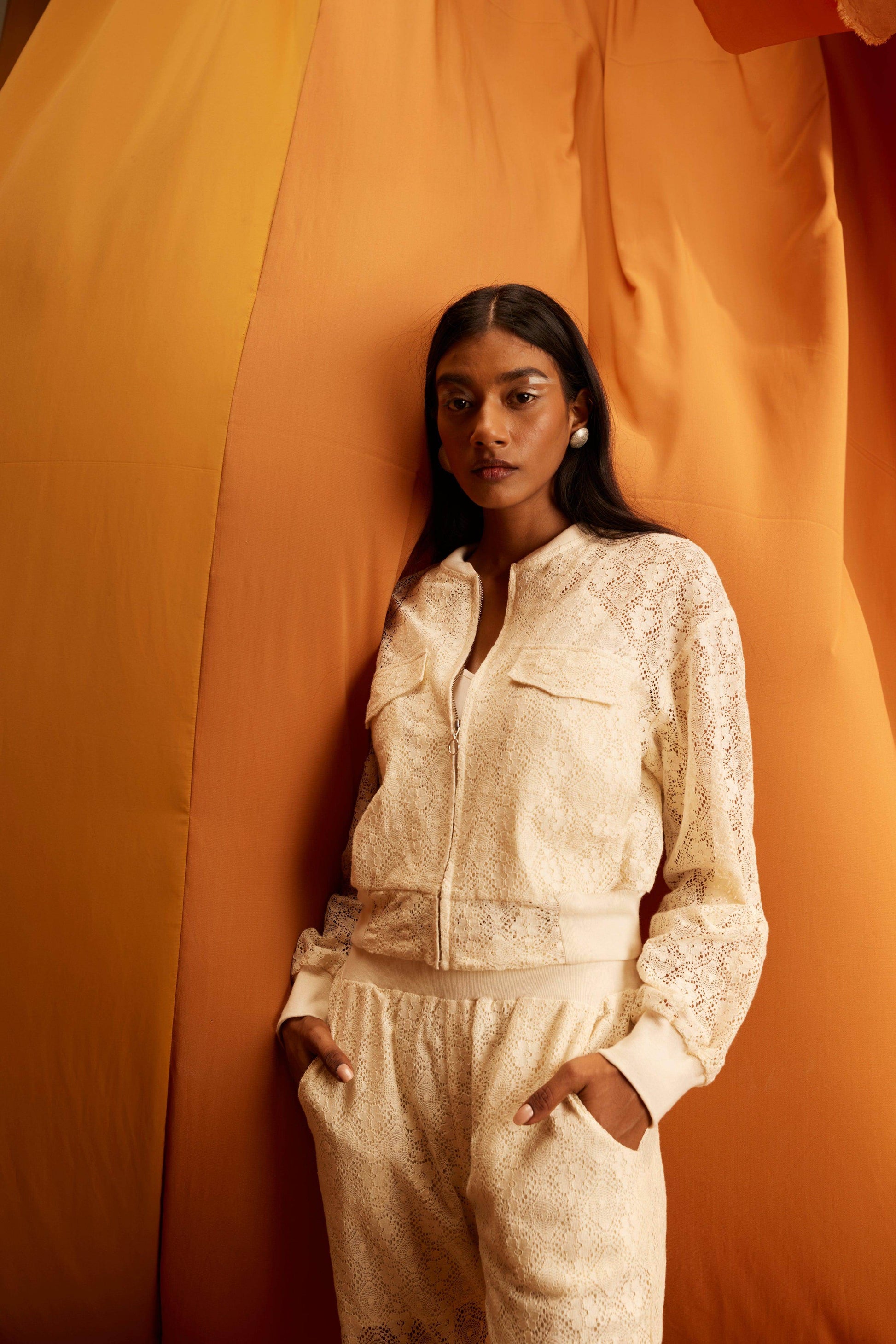 Bomber jacket and jogger set in cotton lace fabric. Decorative flap pocket detail at the jacket front. Organic cotton rib at the neckline, hem and sleeve cuffs. Zip front open, pockets in the side. The jogger is lined till shorts.