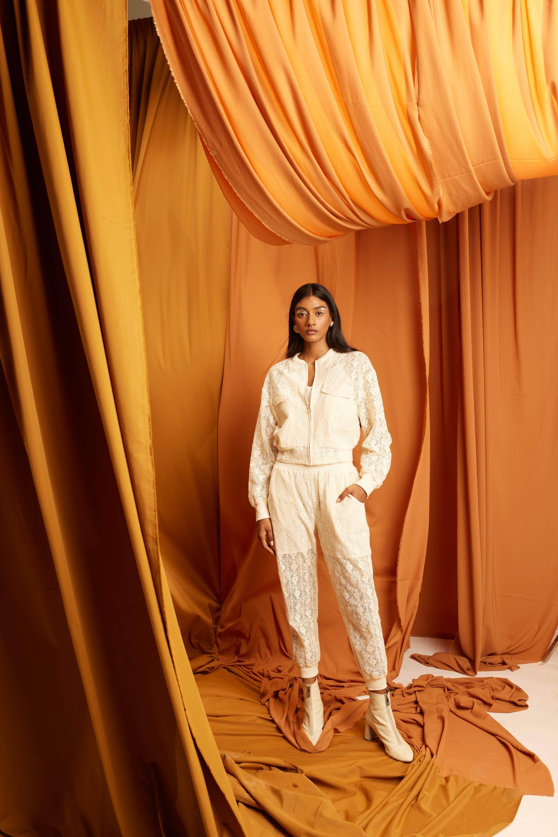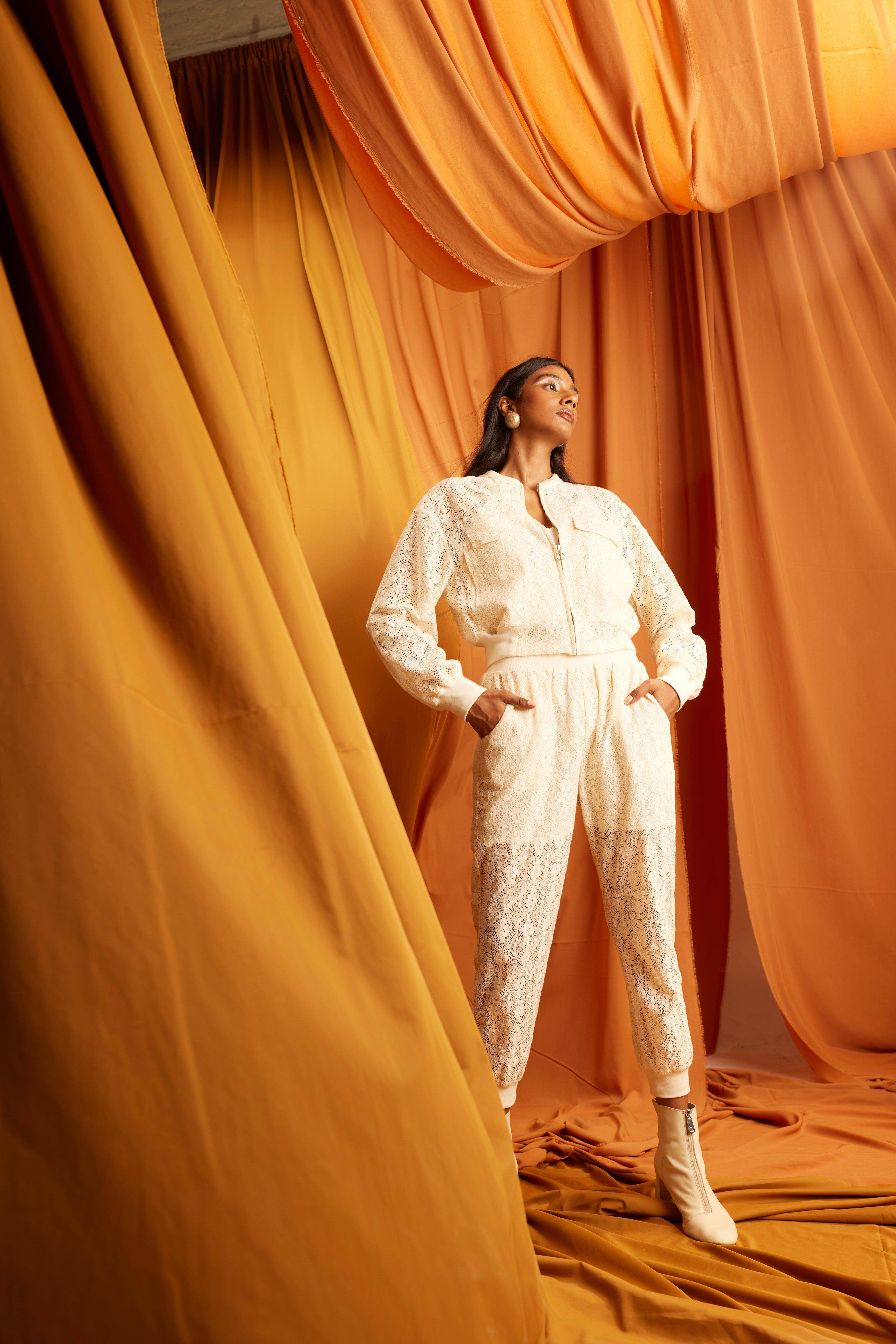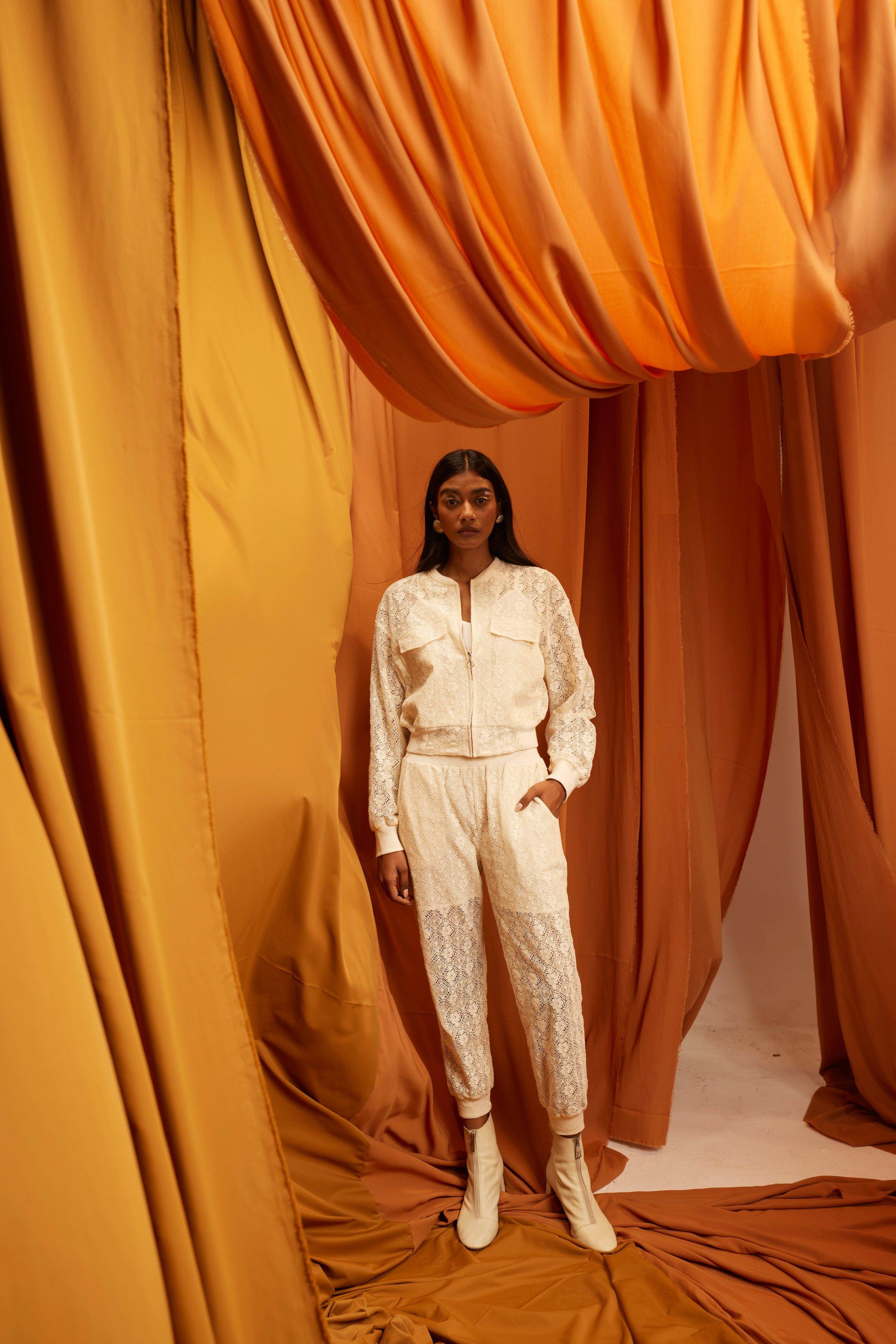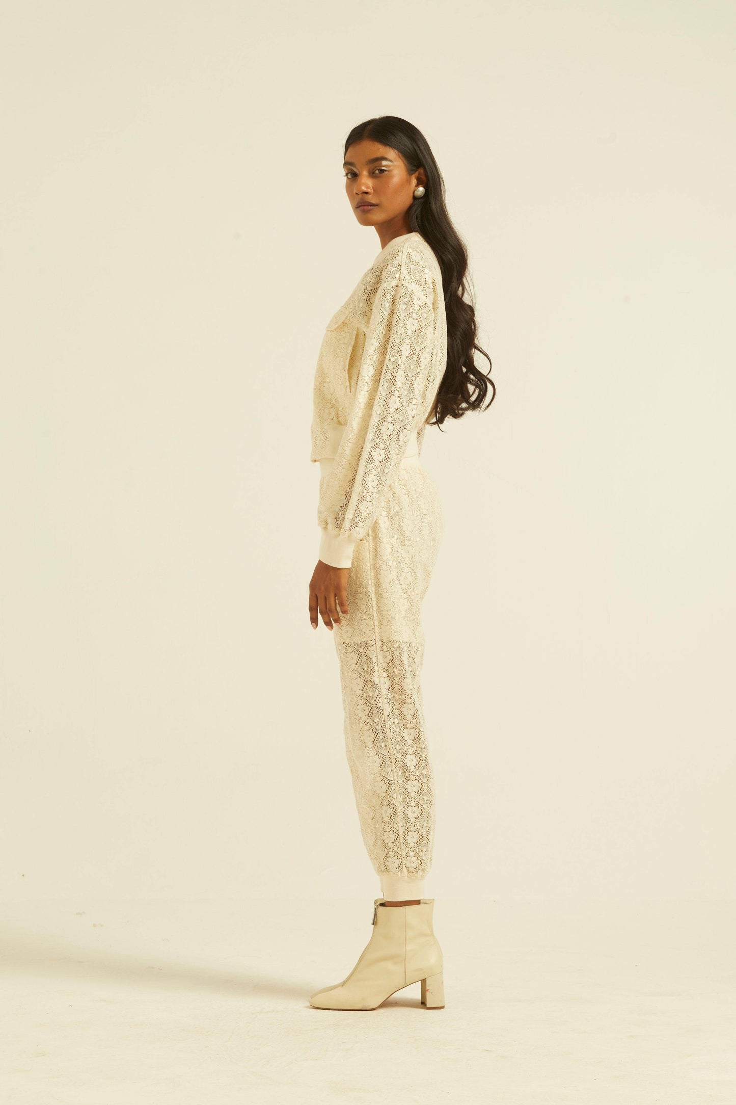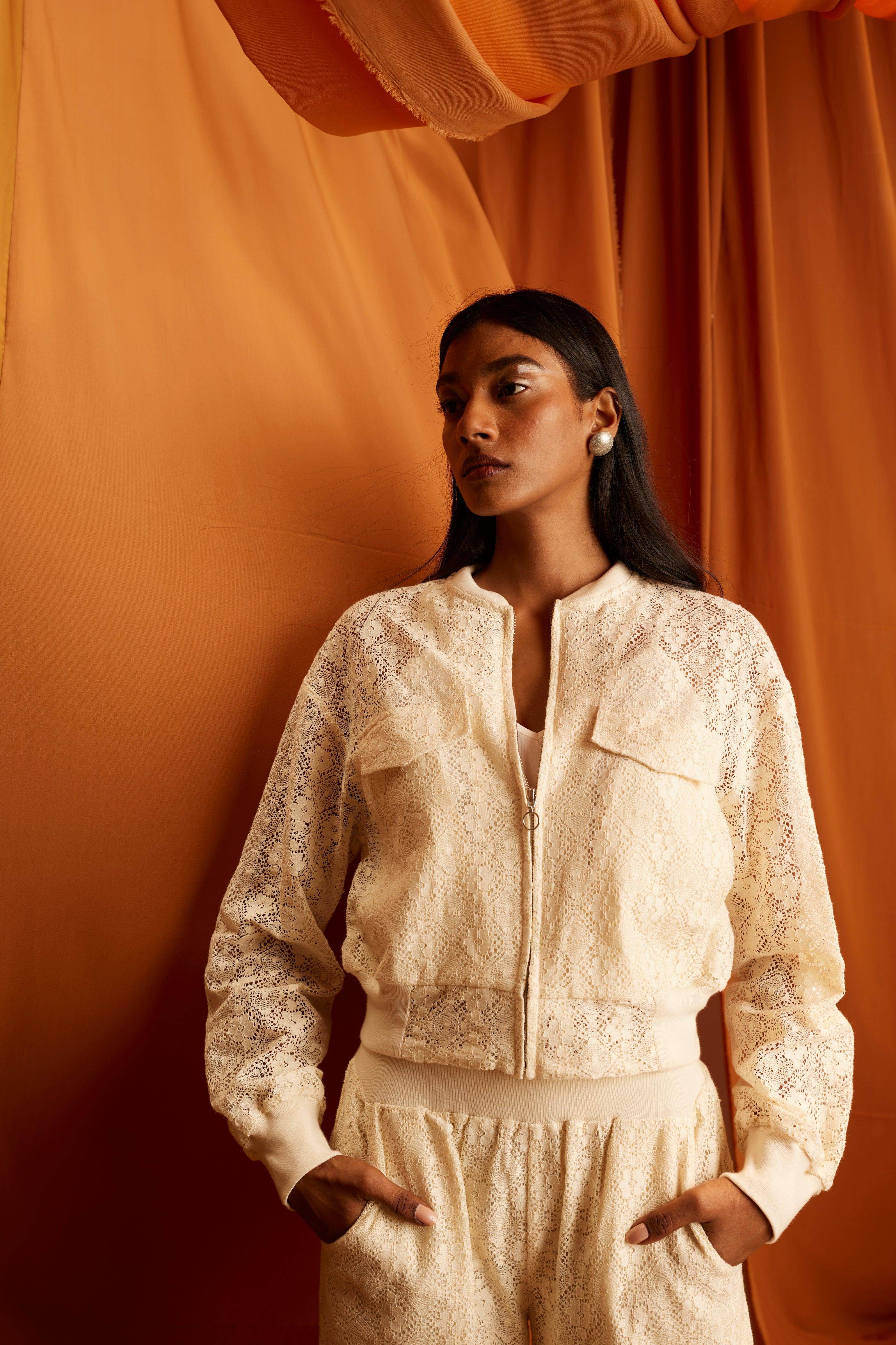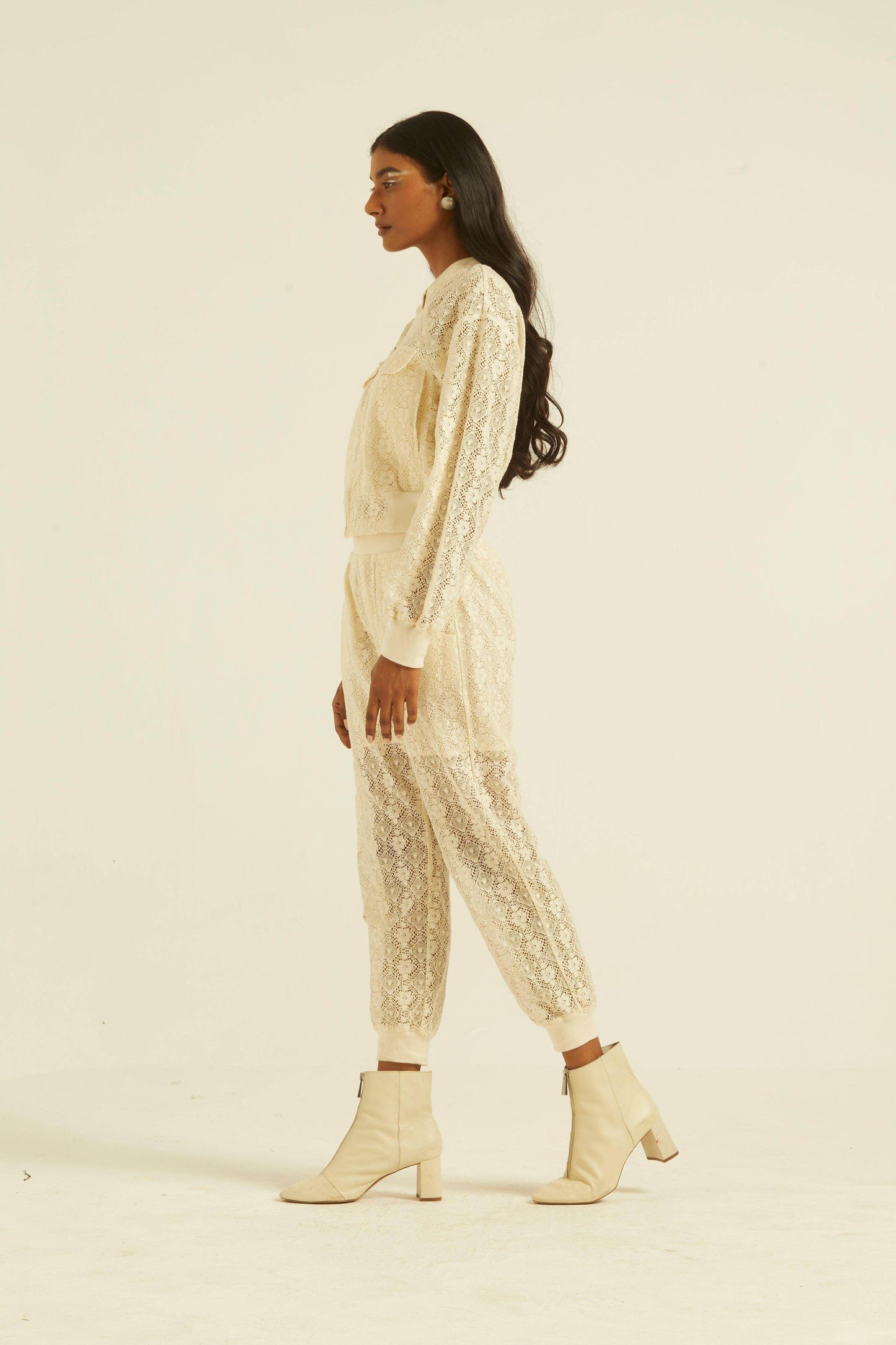 Bomber jacket and jogger set in cotton lace fabric. Decorative flap pocket detail at the jacket front. Organic cotton rib at the neckline, hem and sleeve cuffs. Zip front open, pockets in the side. The jogger is lined till shorts.