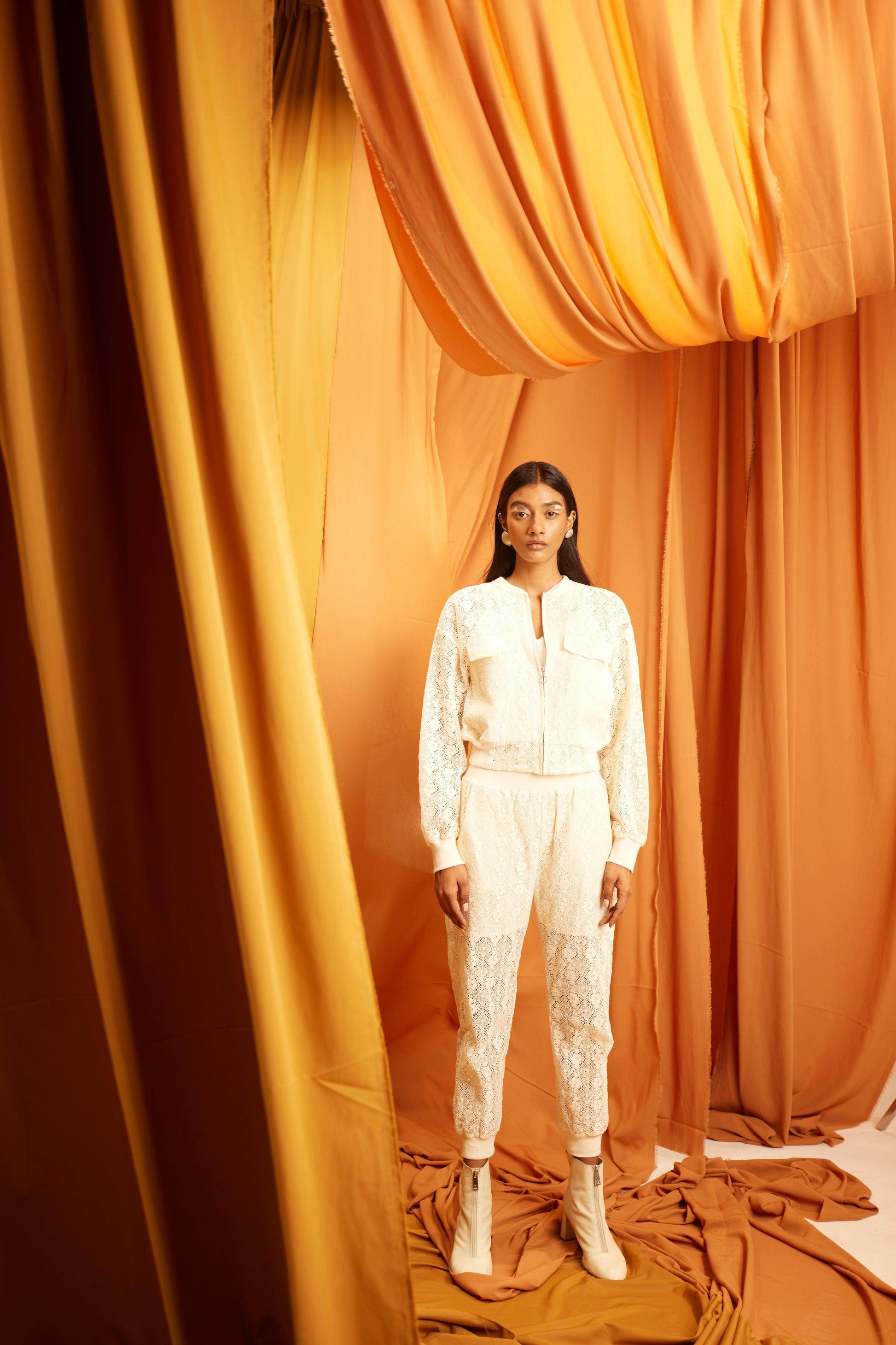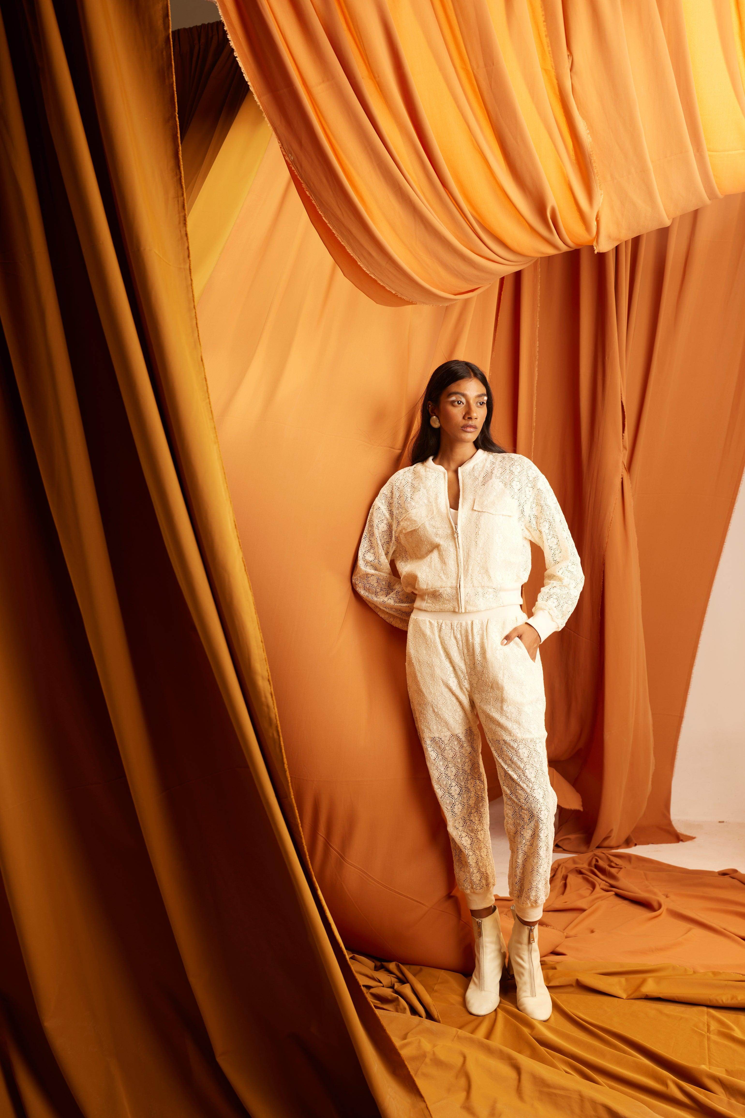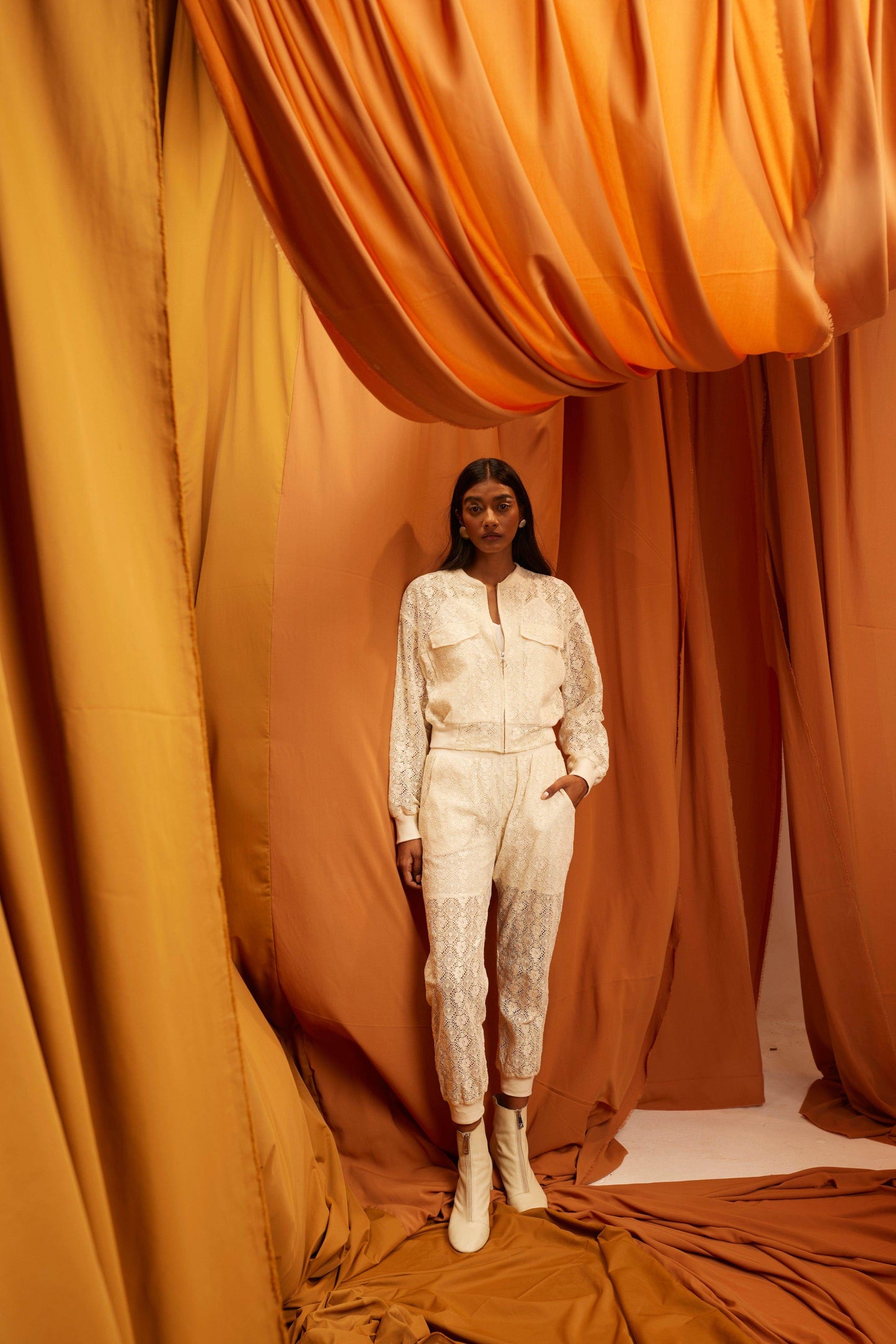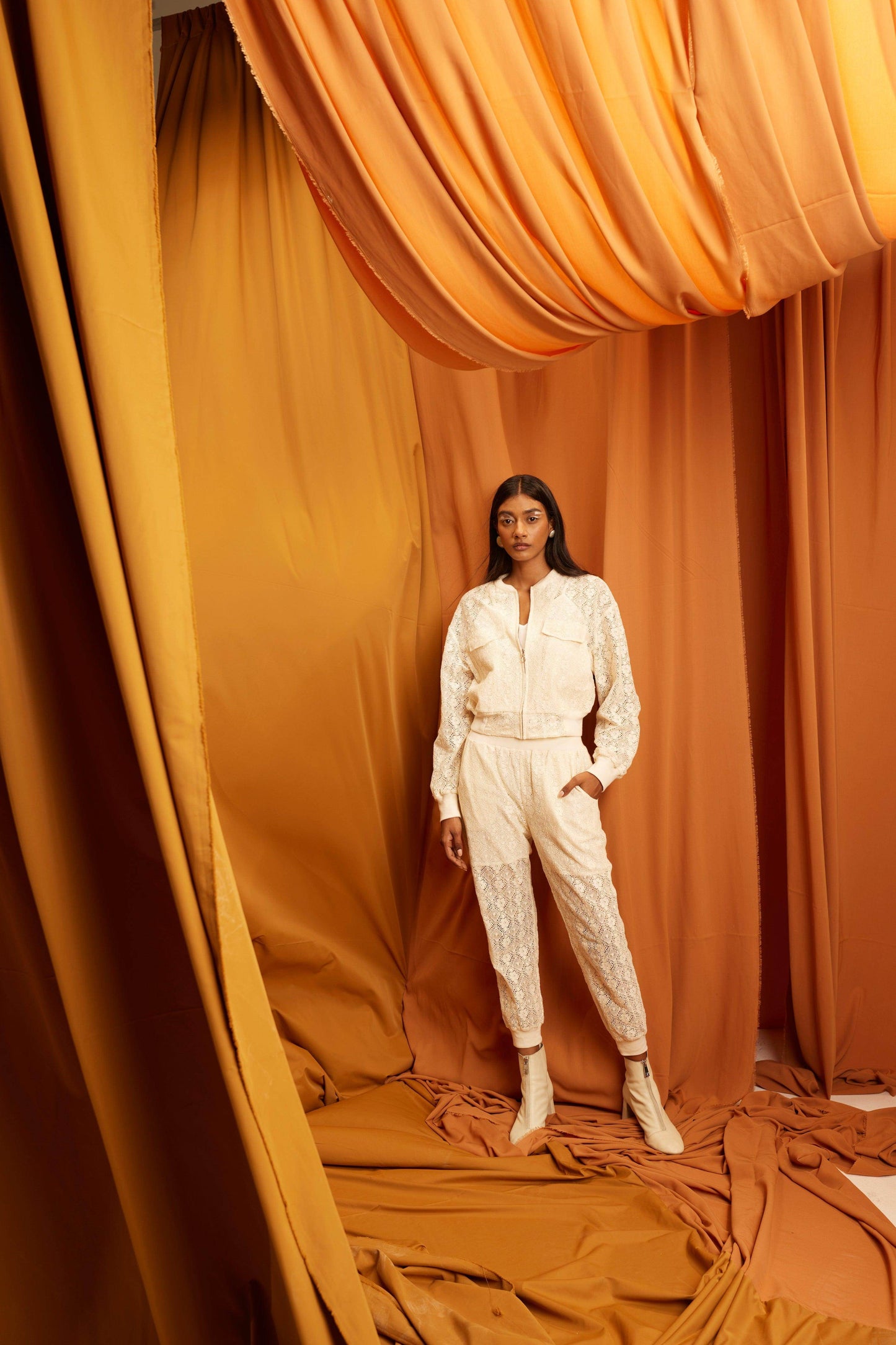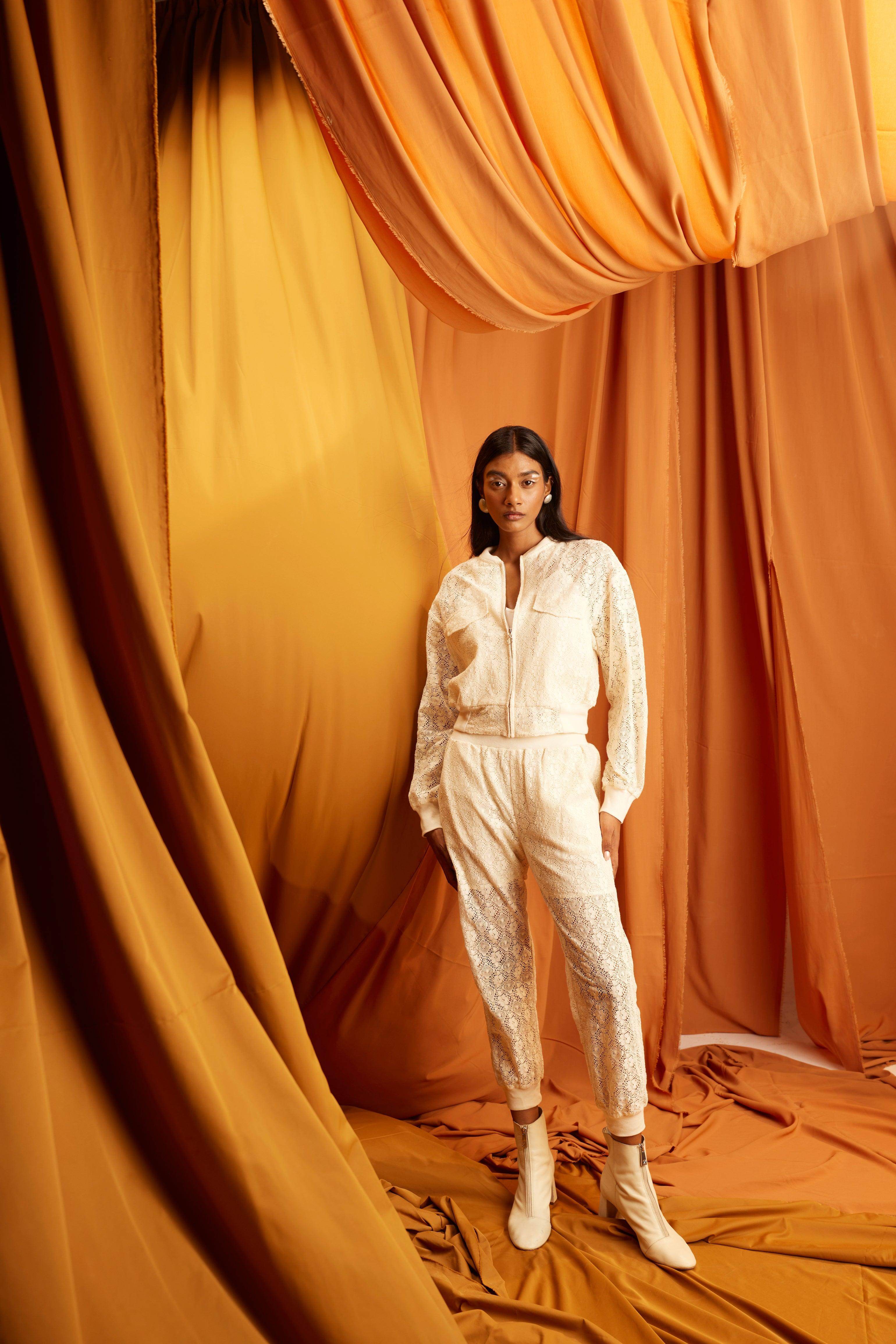 Bomber jacket and jogger set in cotton lace fabric. Decorative flap pocket detail at the jacket front. Organic cotton rib at the neckline, hem and sleeve cuffs. Zip front open, pockets in the side. The jogger is lined till shorts.