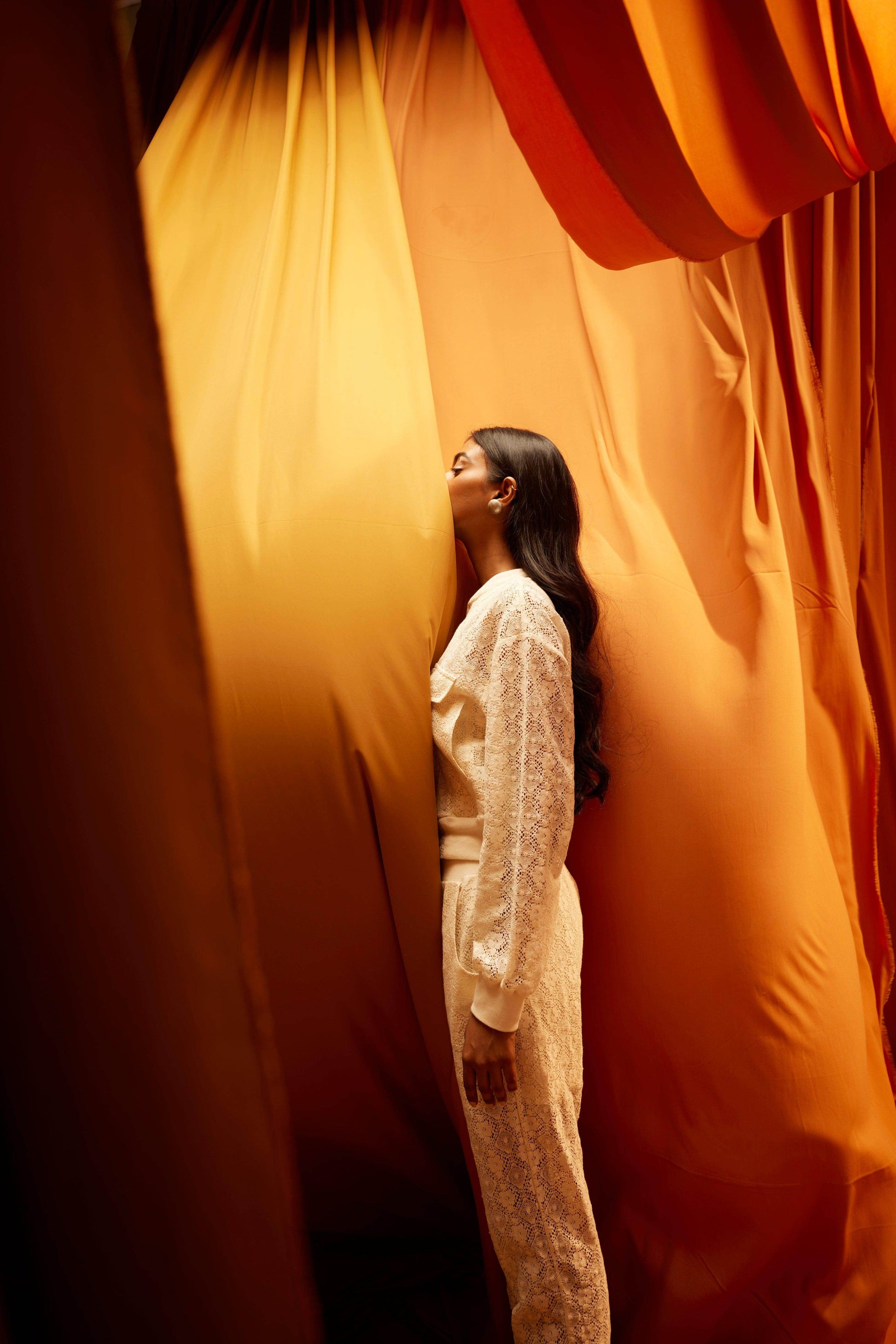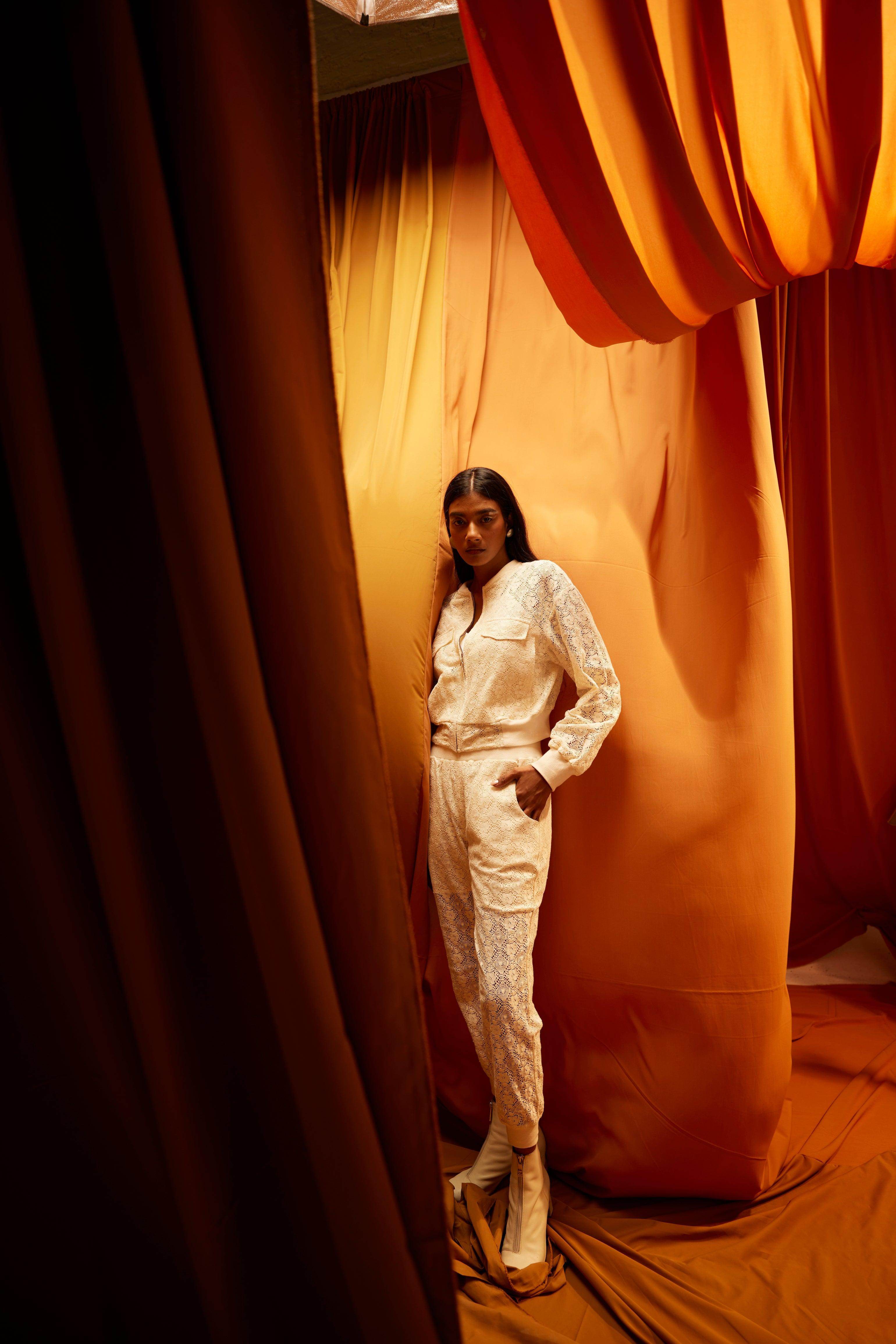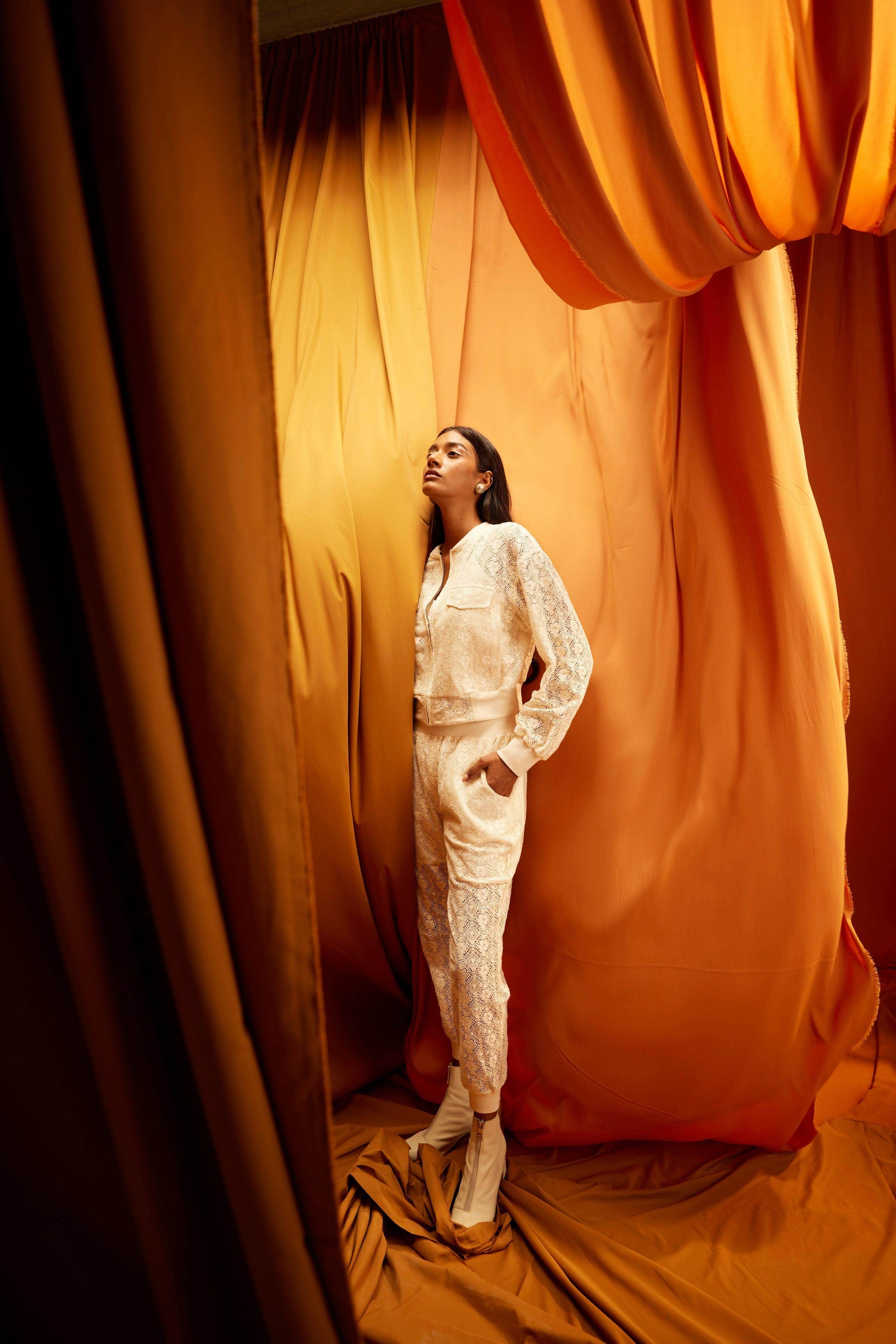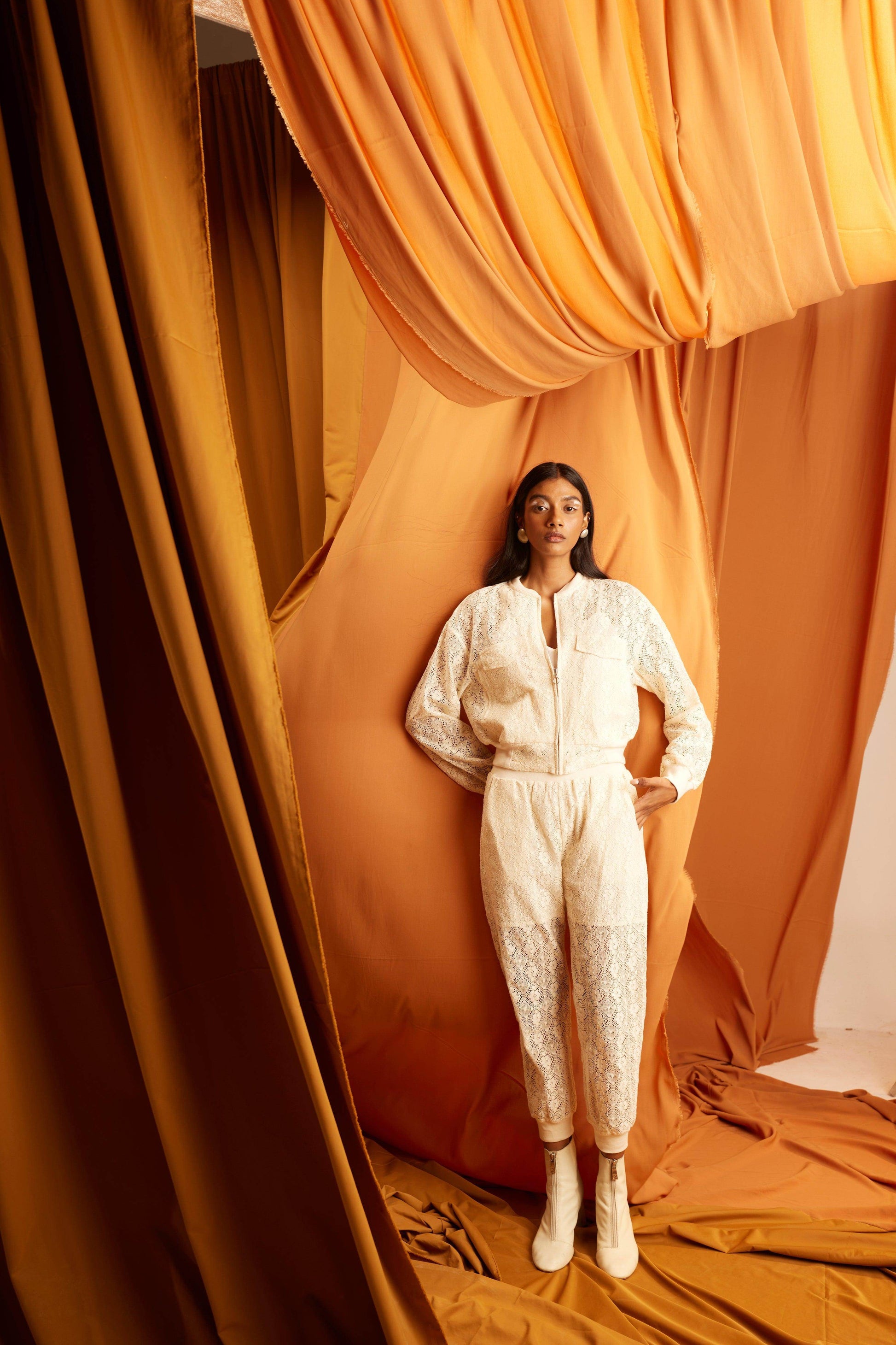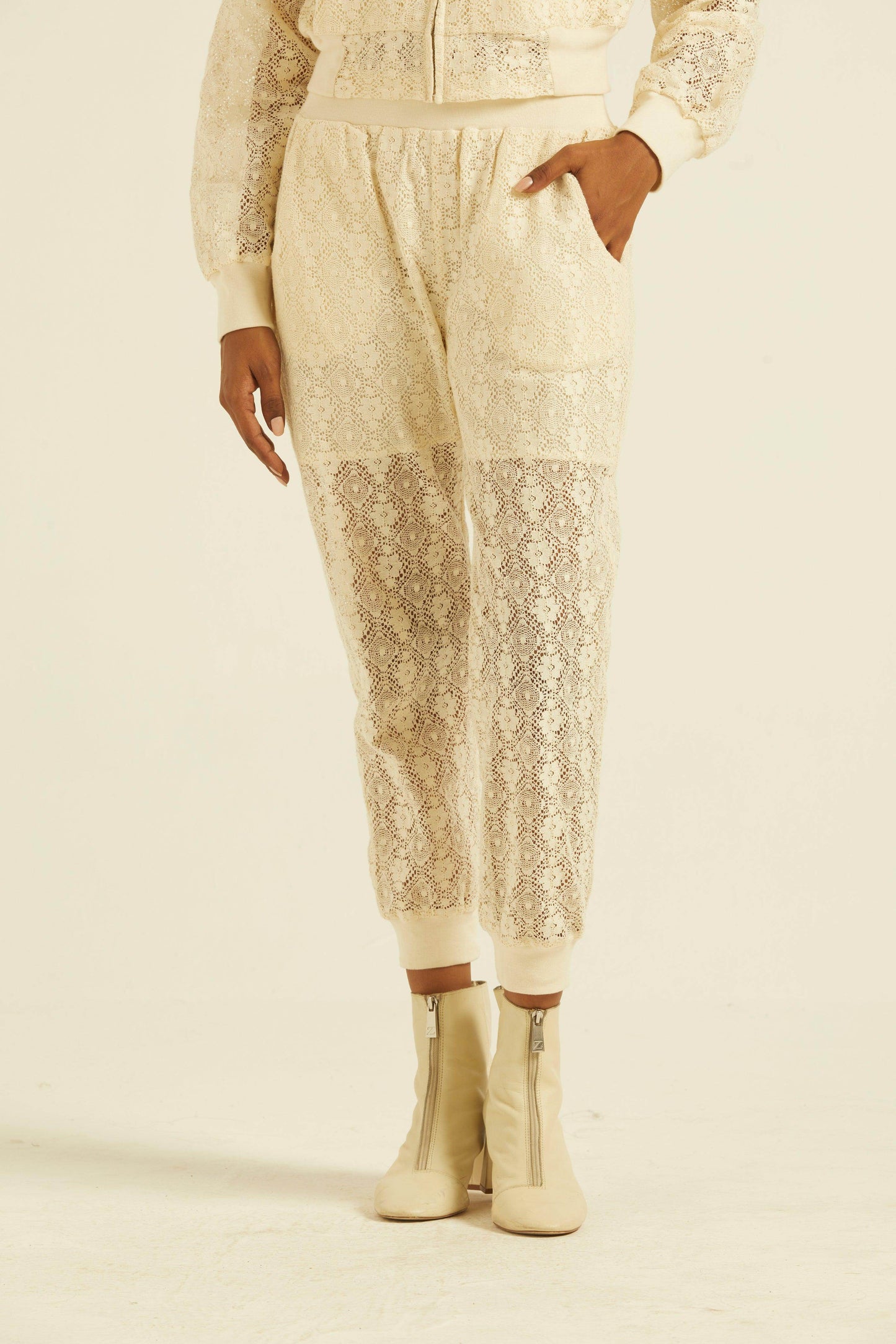 Bomber jacket and jogger set in cotton lace fabric. Decorative flap pocket detail at the jacket front. Organic cotton rib at the neckline, hem and sleeve cuffs. Zip front open, pockets in the side. The jogger is lined till shorts.