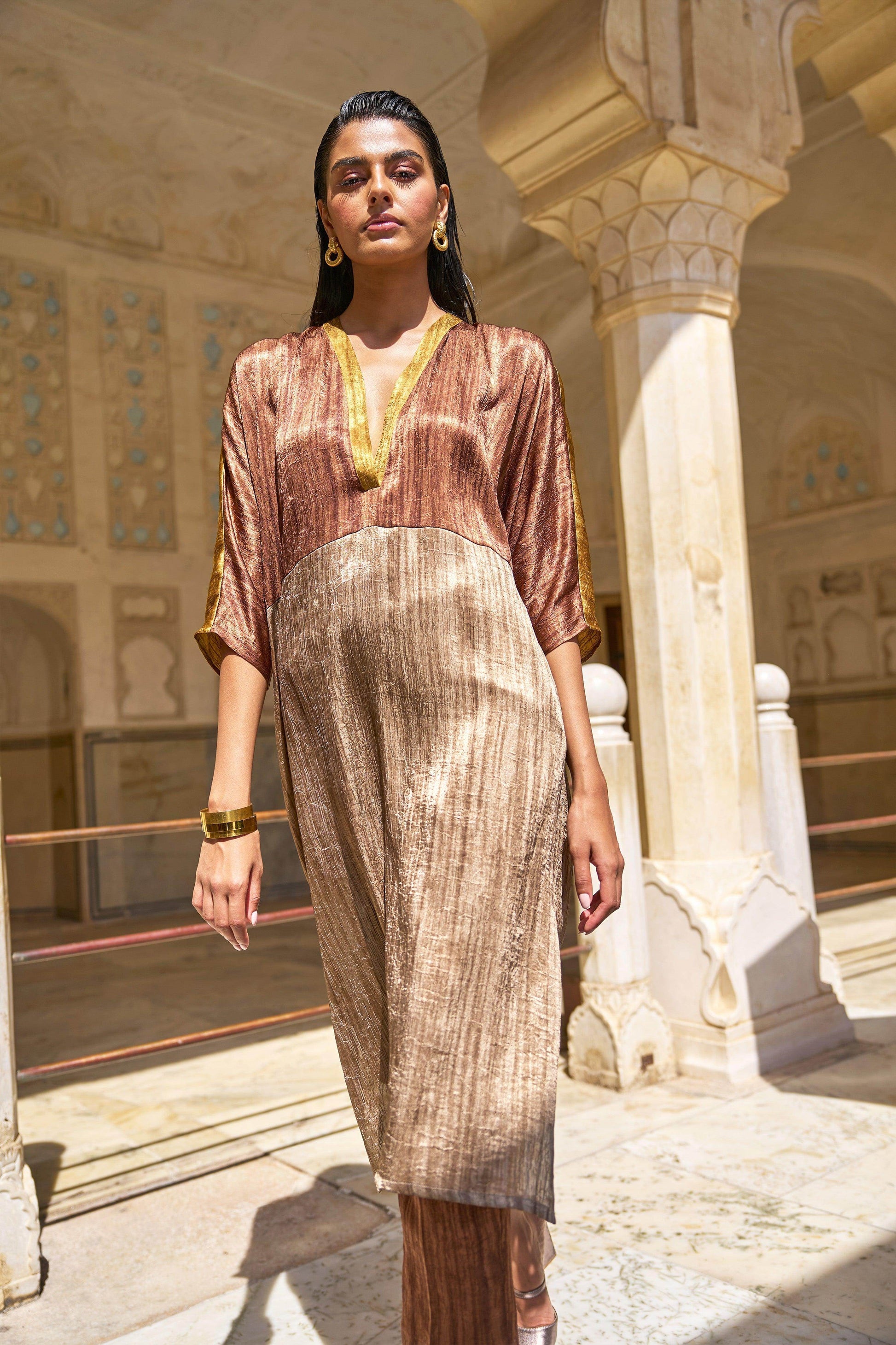V-neck tunic top in crinkled and textured lamé fabrics in earth tones. Colour blocked in shades of caramel, mustard and coffee. Popover top in a relaxed fit. Half sleeves, side slits.