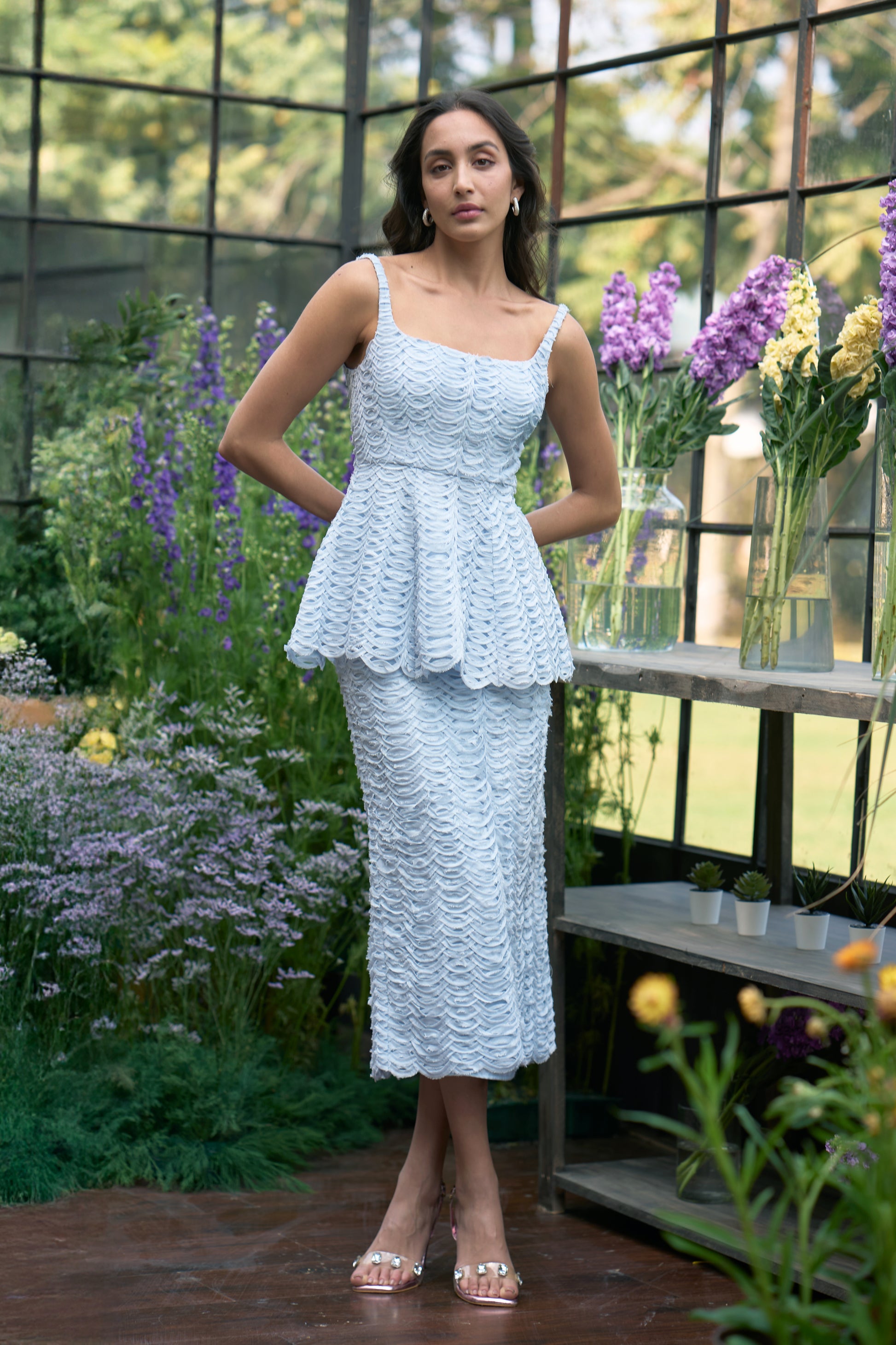 Ribbon embroidered peplum top in ice blue with curved scalloped strips layered in horizontal cascading rows. Soft tonal ribbon appliqué creates a sculpted, textured surface on georgette base. Slender straps with a softly structured fit-and-flare shape through the waist. Concealed zip and hook/eye closure at the centre back. Fully lined. Paired with matching midi skirt. Straight silhouette with a back slit for ease. Internally elasticated waistband with concealed zip and hook/eye closure at the back. Fully lined.
