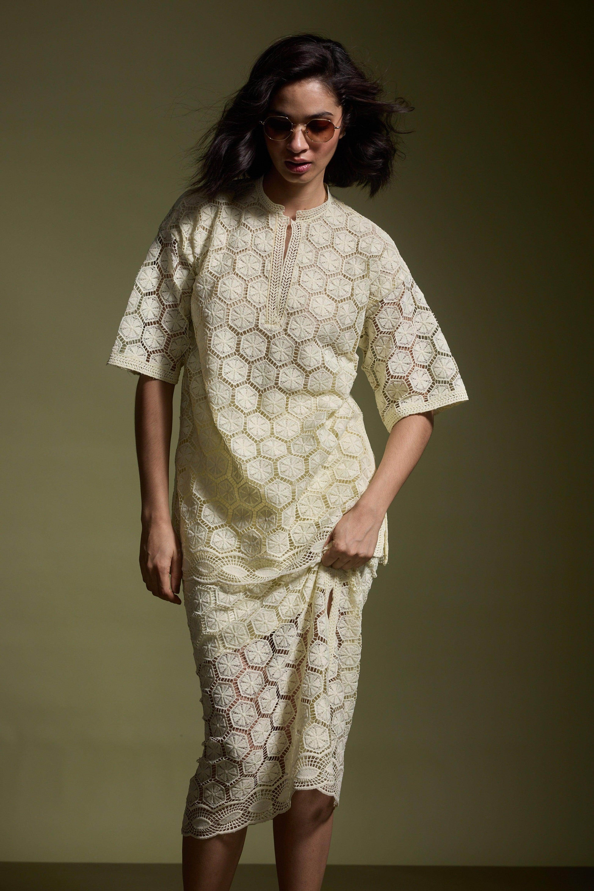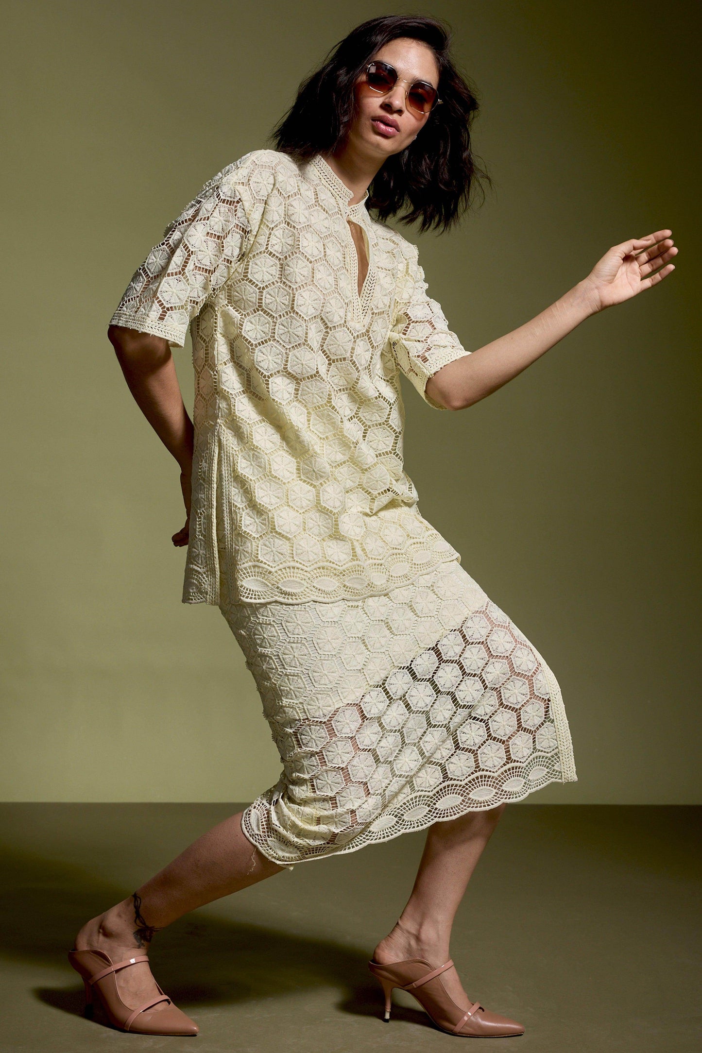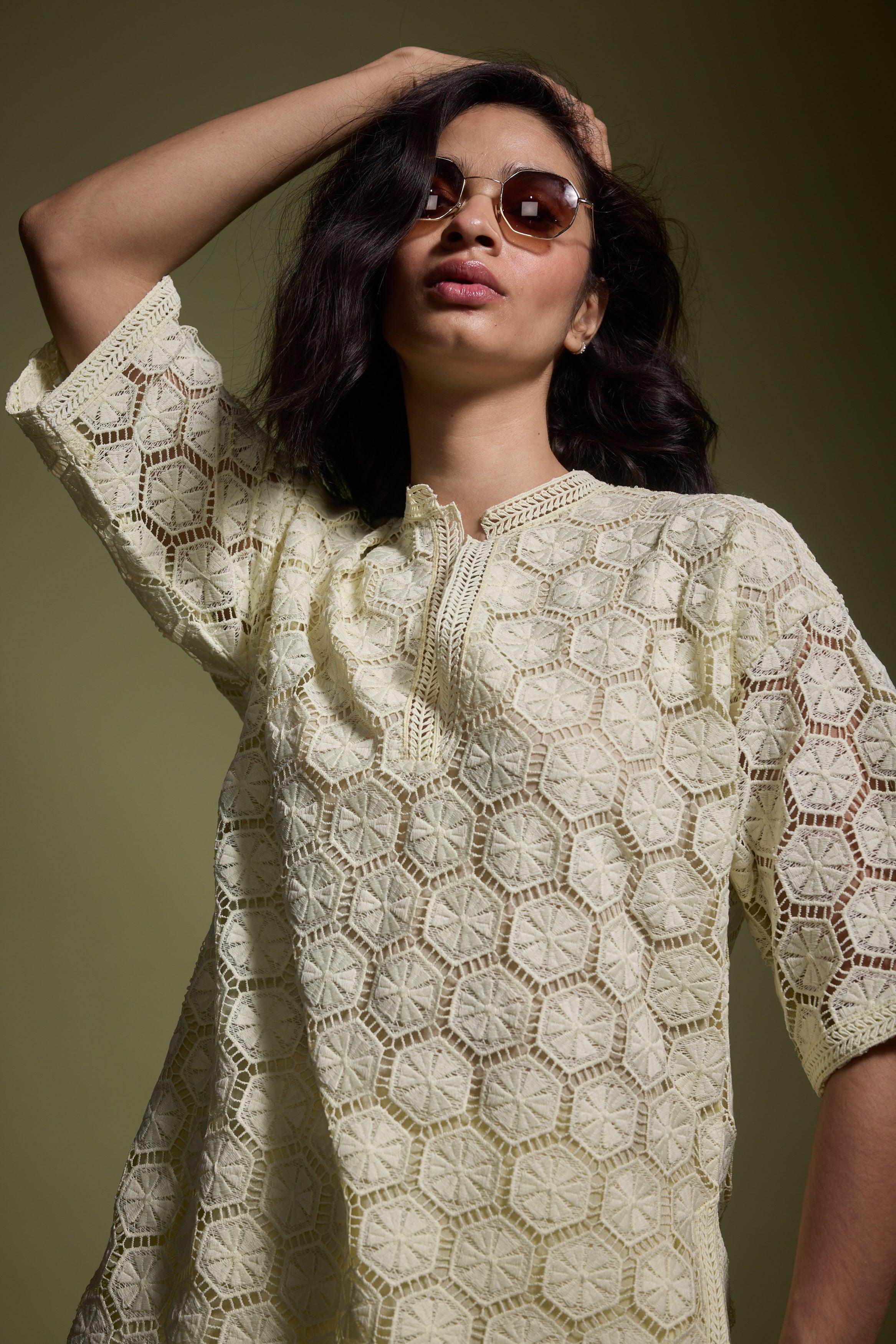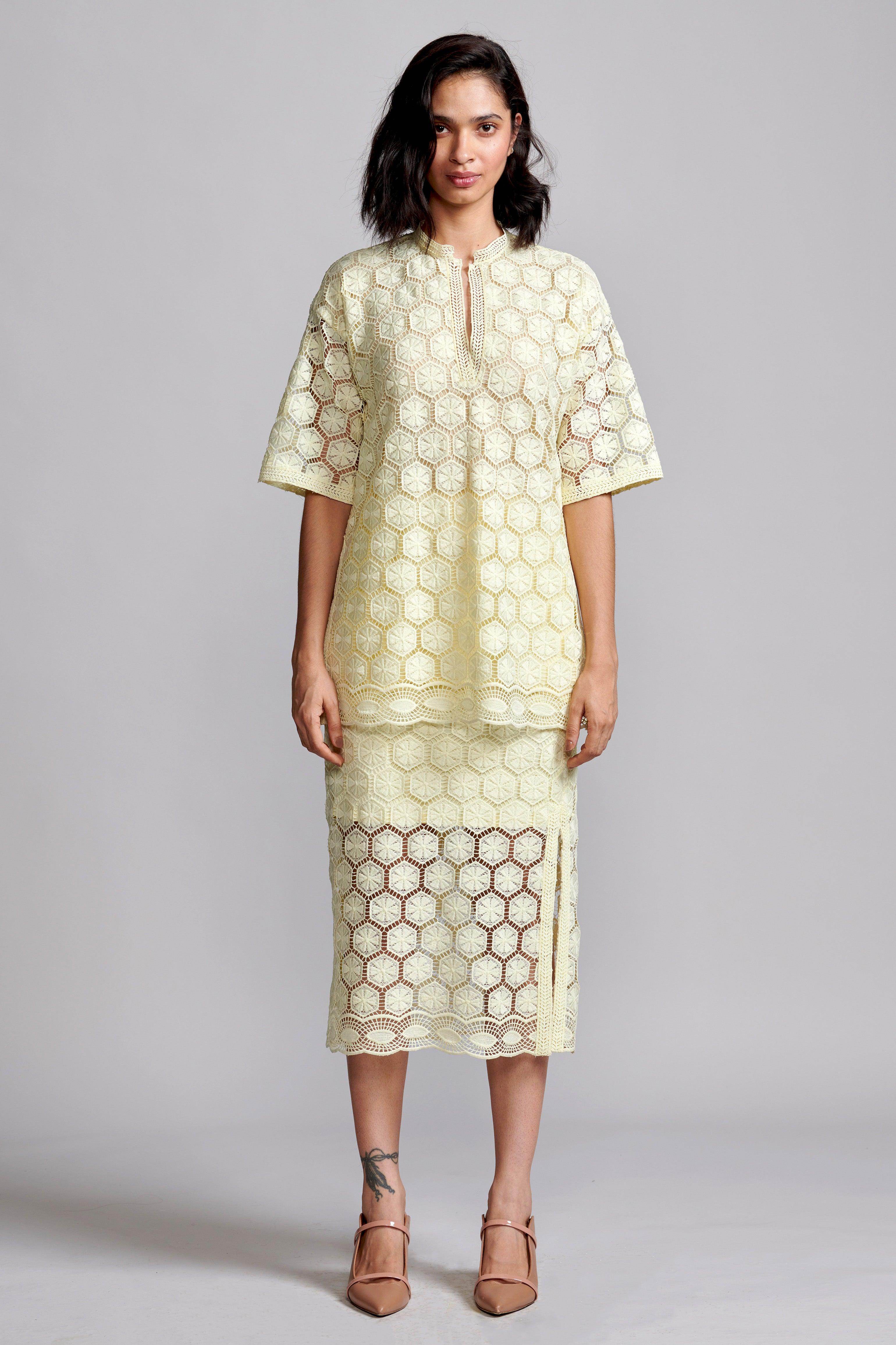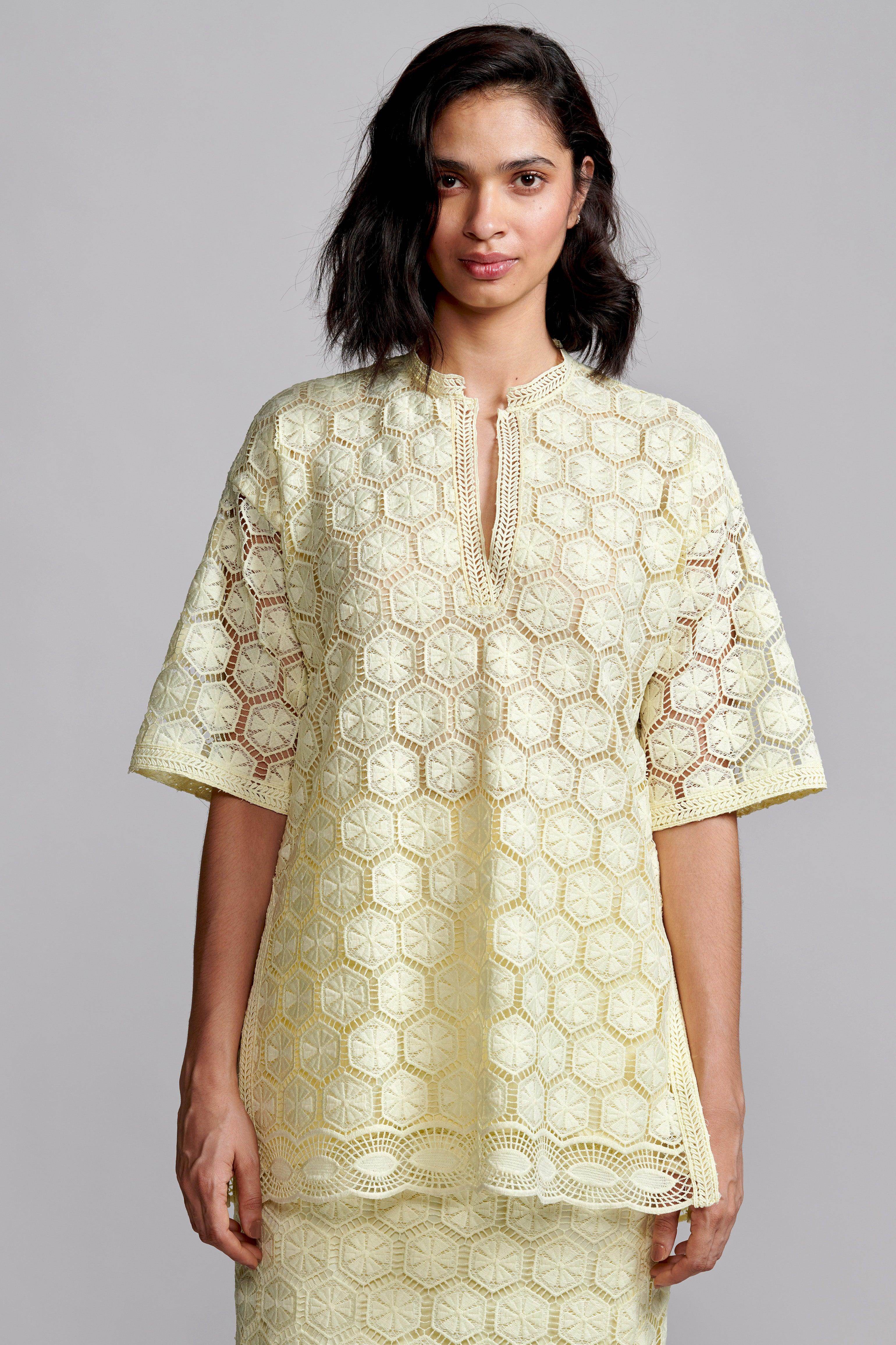 Lemon yellow geometric cutout lace popover top. Relaxed fit with soft lace insert at the V-neckline. Bodice lining, unlined half sleeves, and a band collar. Border lace insert at the hem. Side seam slits with lace detailing.