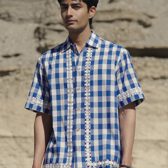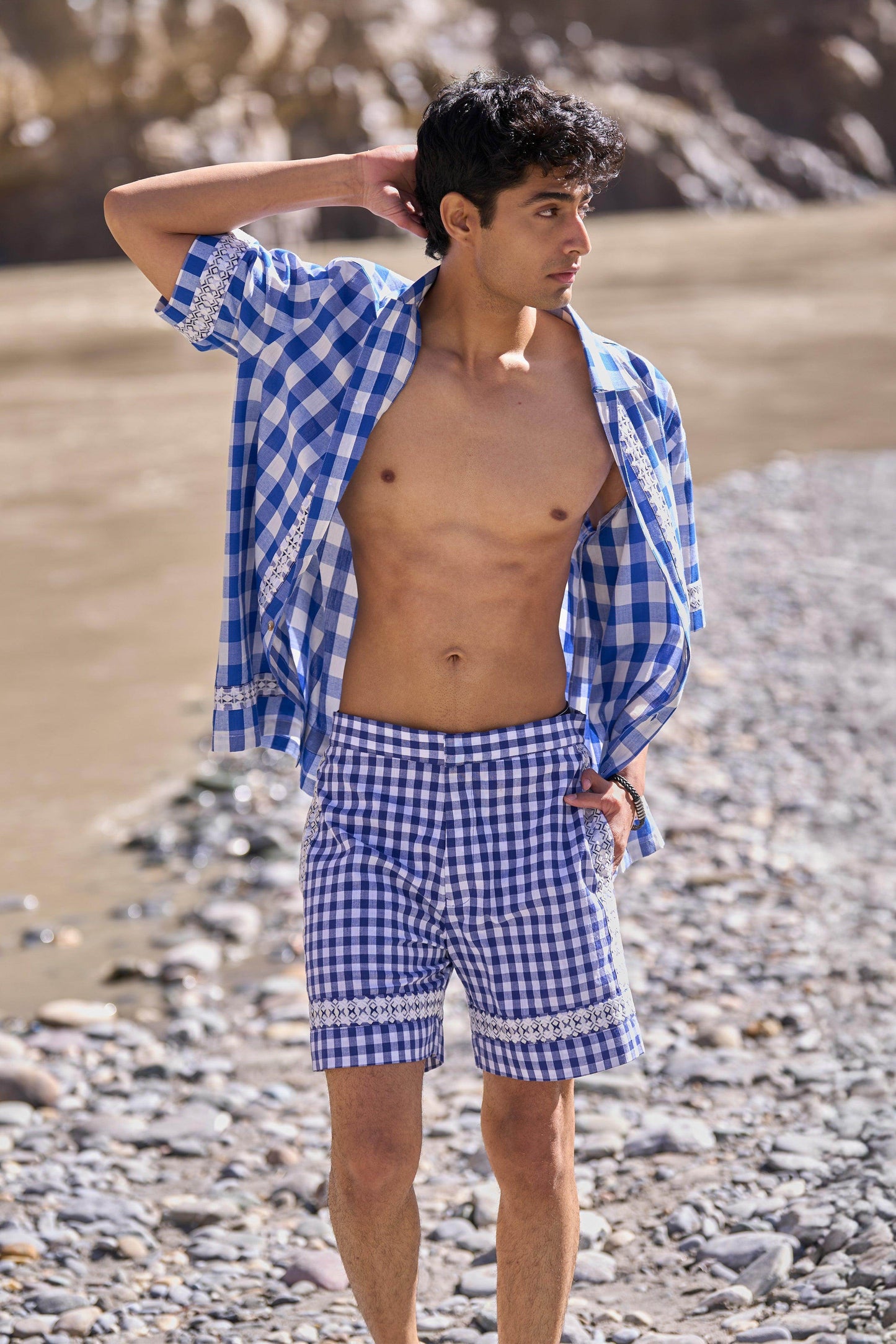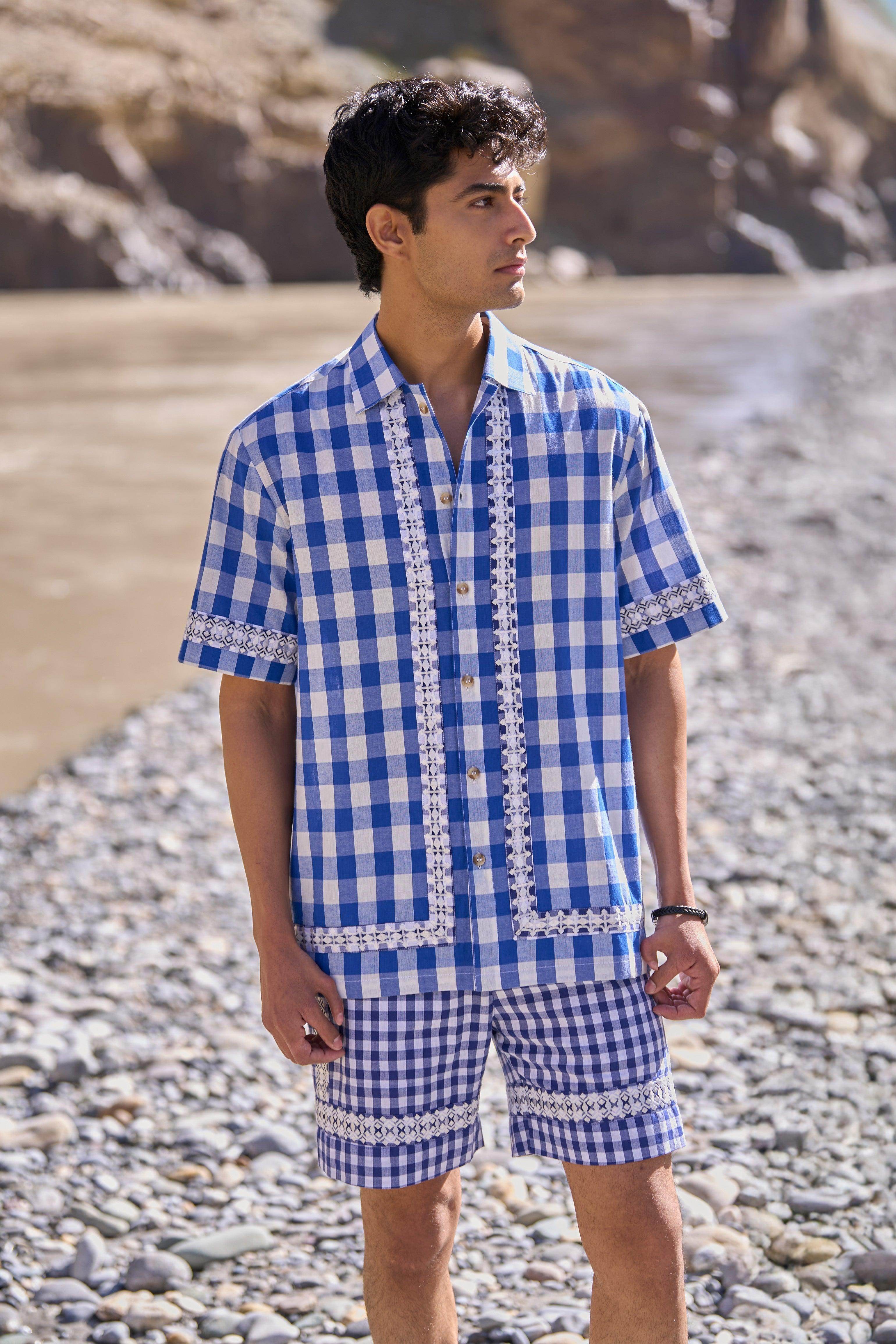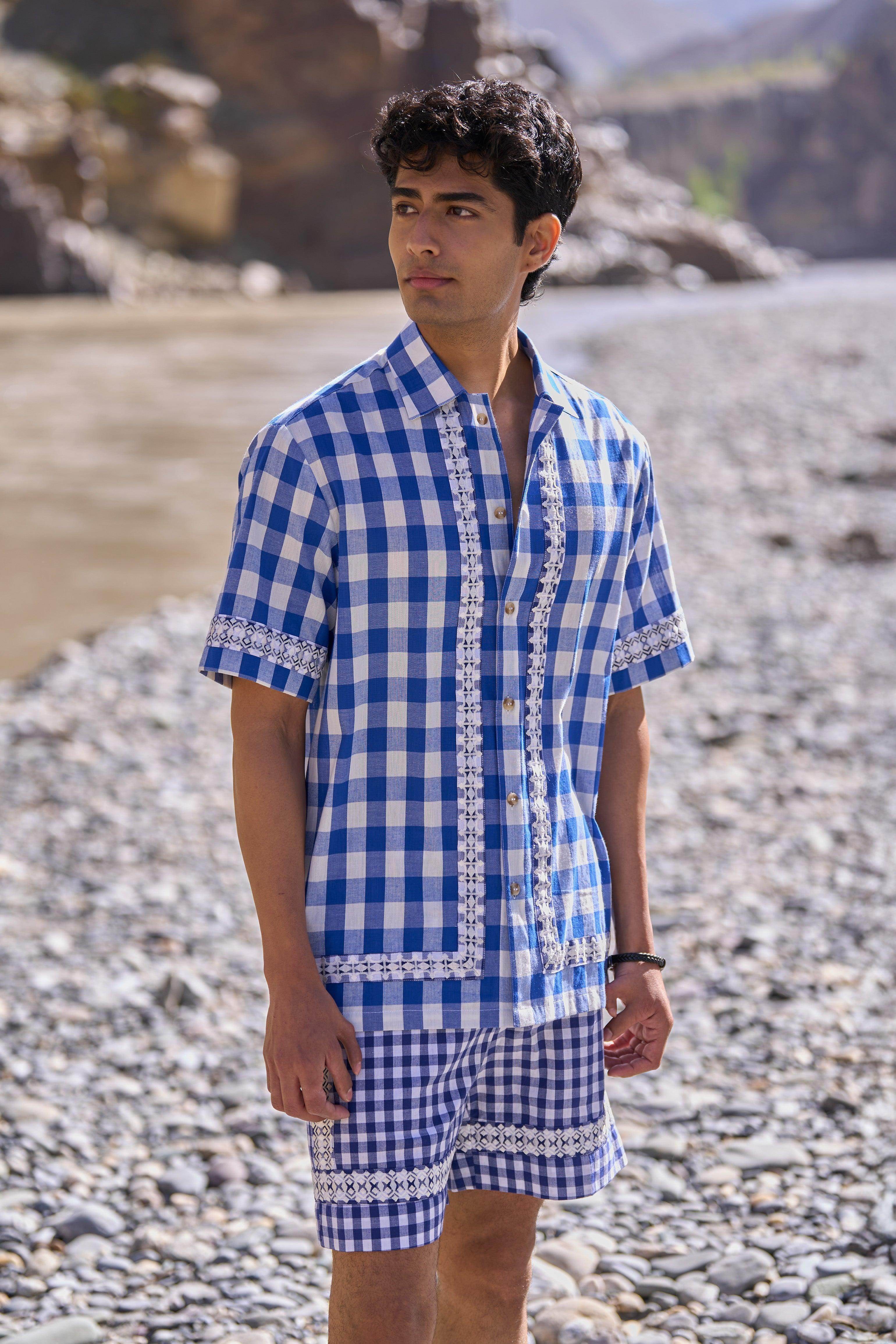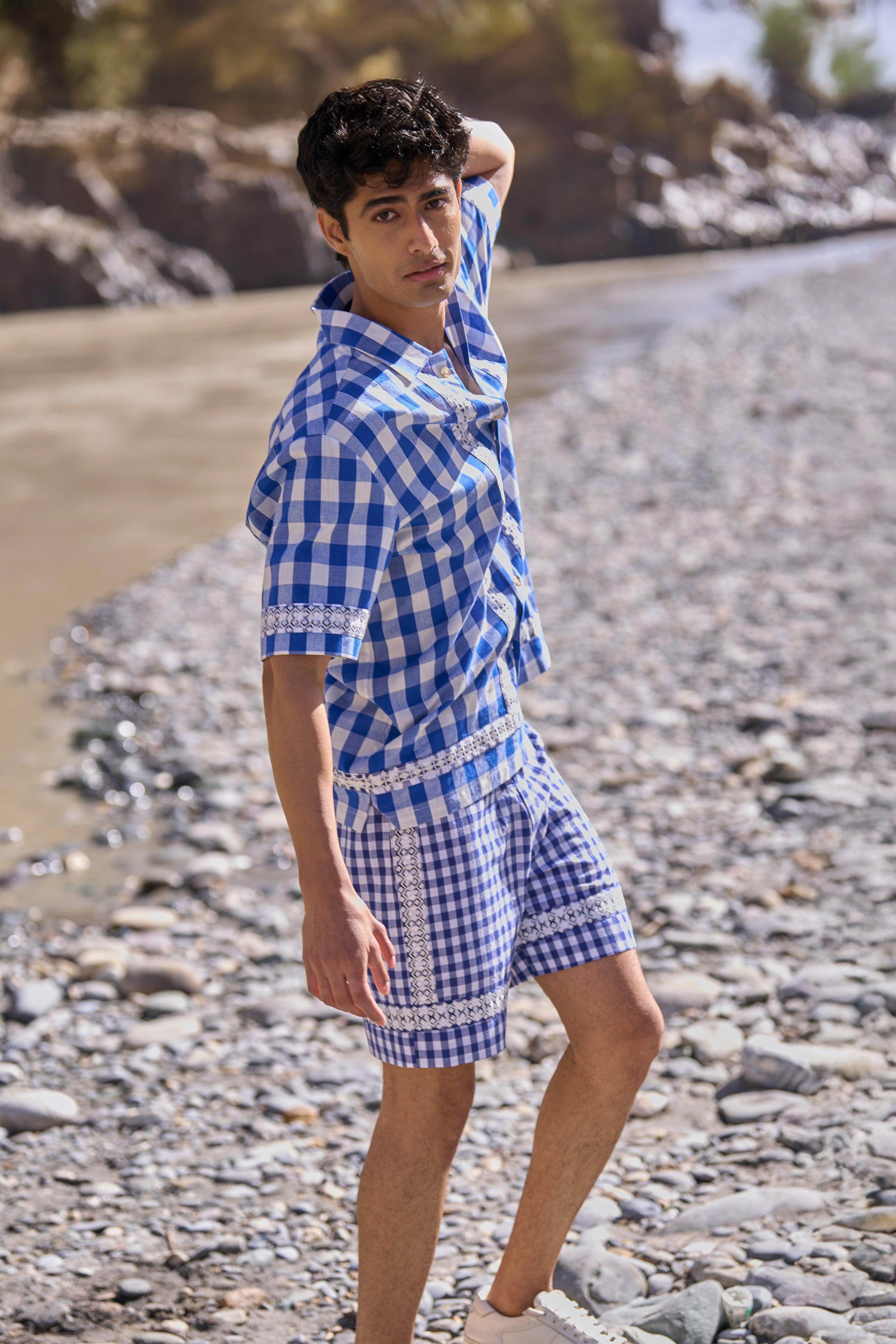 Madras check shorts with contrast tonal lighter checks with white embroidery placed near the bottom hem. Semi-elasticated waistband with hook/eye and zip closure. Pockets in the sides.
