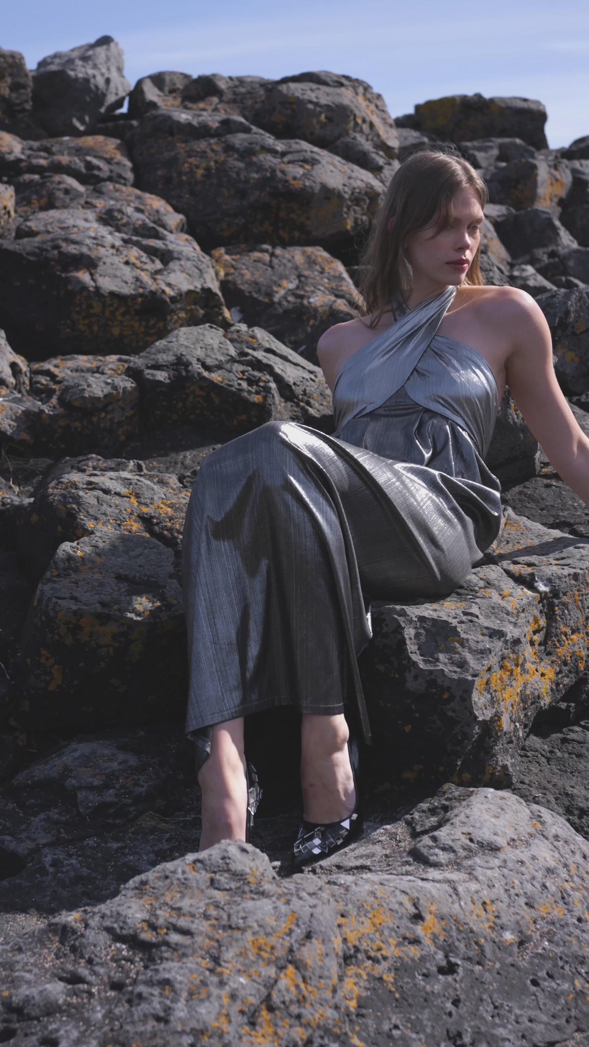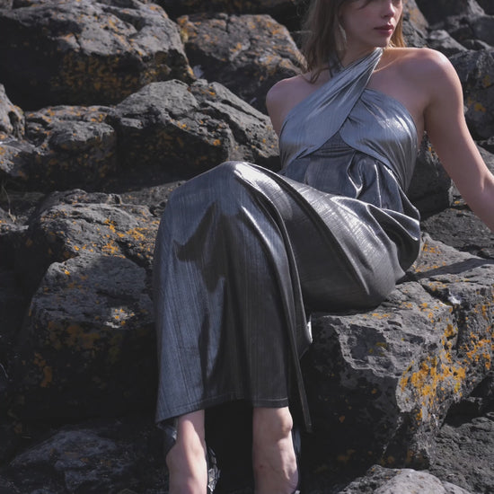 Textured silver and dark pewter blocked draped gown in foil printed fabric. Halter neck with overlap detail at the front. Dramatic tie-up detail at the lower back. Architectural pleat drape detail at the under-bust to add movement and shape. Comes with removable pad pockets. Zip closure at the back. The garment is fully lined.