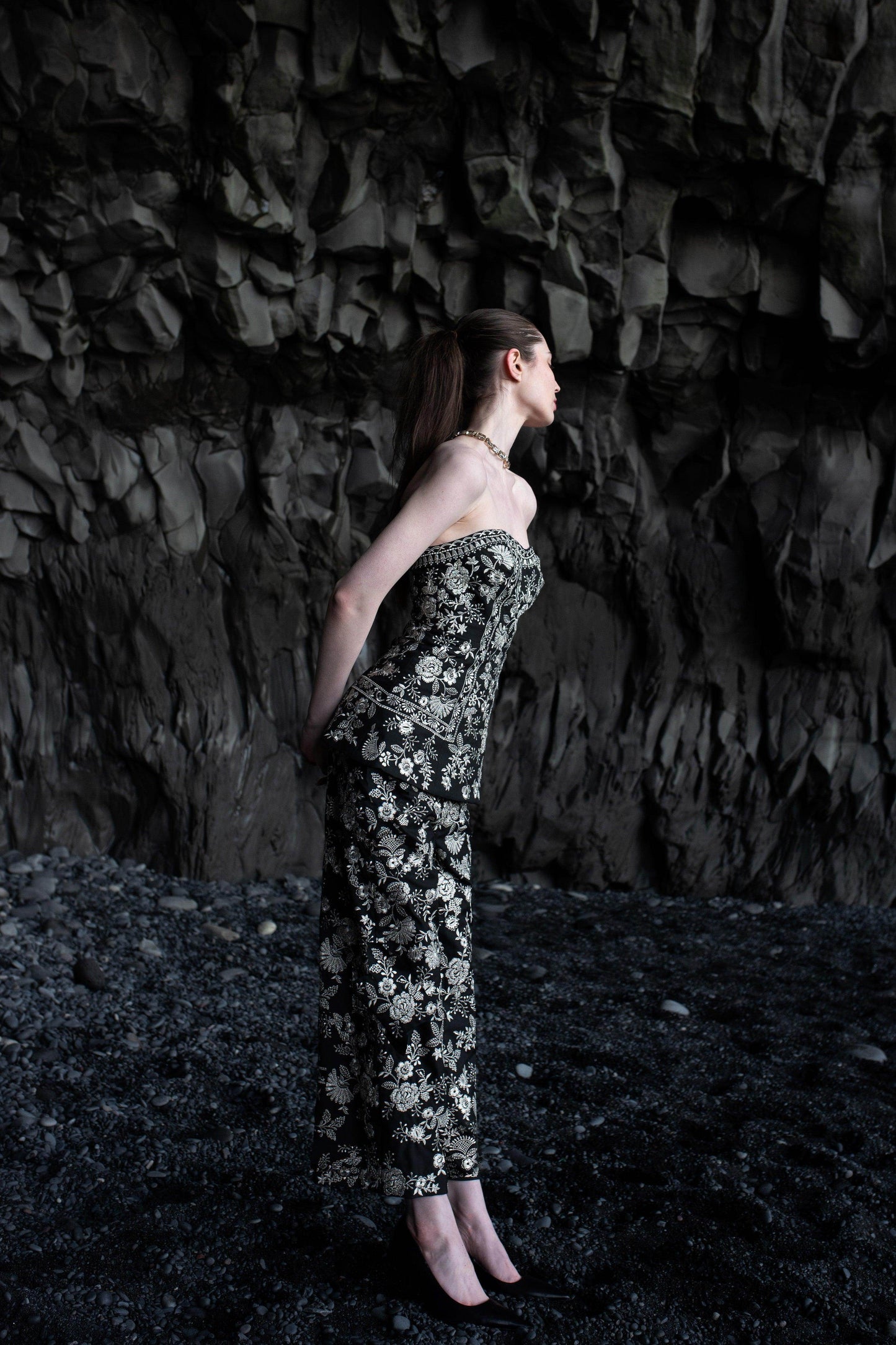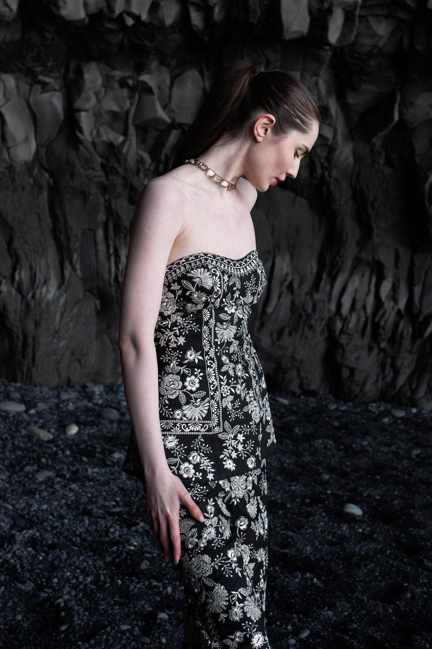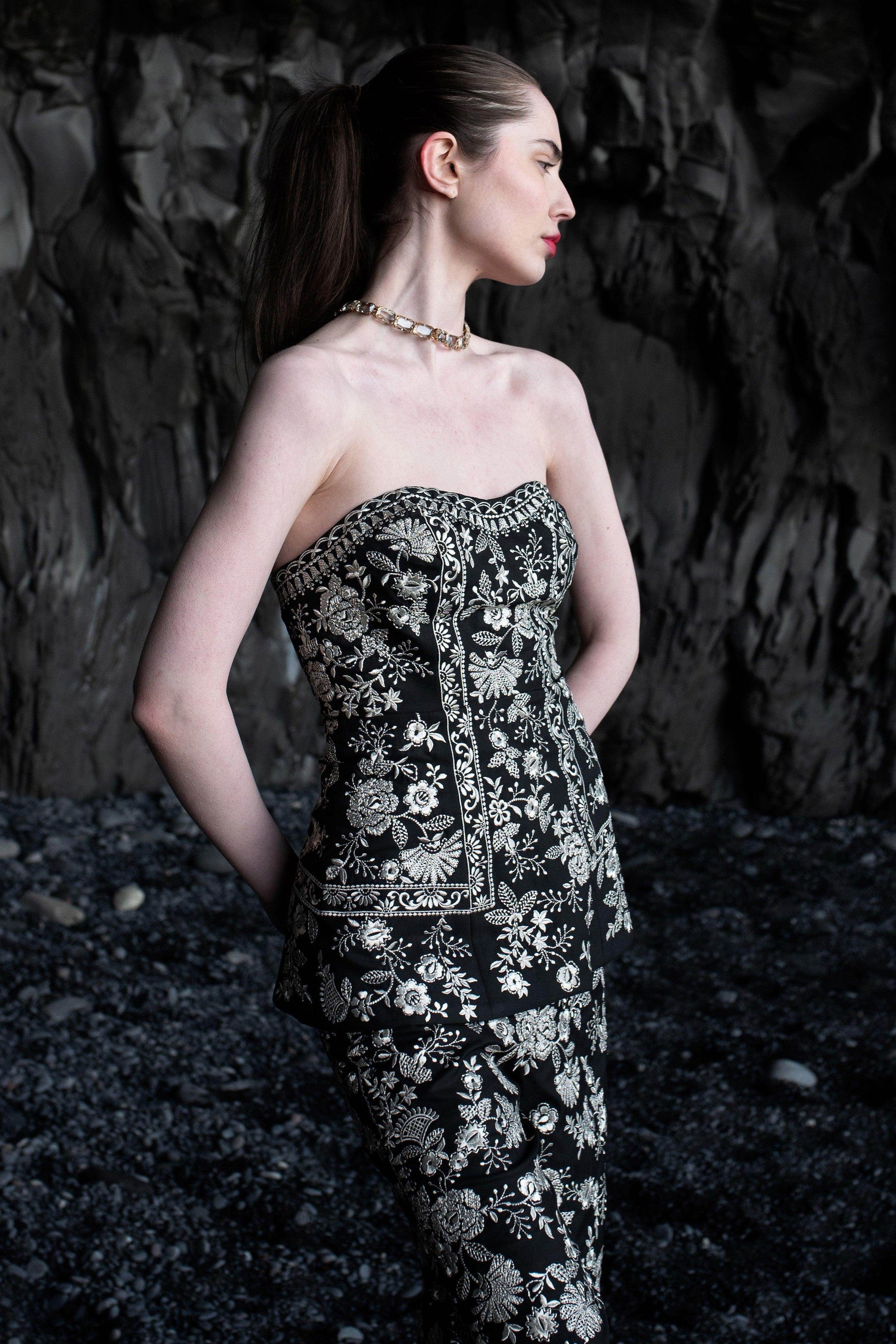 Black pant suit with placed allover floral embroidery in a contrast silver metallic thread. Study in embroidery techniques, the garment has a mix of cross stitch, rice stitch and satin stitch. Corset inspired peplum style off-shoulder top with a sweetheart neckline comes with detachable straps. Placed borders within the allover floral embroidery on the front and back help accentuate the body. Removable pad pockets in the front, full zip closure at the back. Paired with matching wide-legged pants that have strategically placed border embroidery within the allover floral design. The pant is semi-elasticated and has pockets on the side. Hook-eye and zip closure at the front. Both garments are fully lined. Made of all weather suiting material.