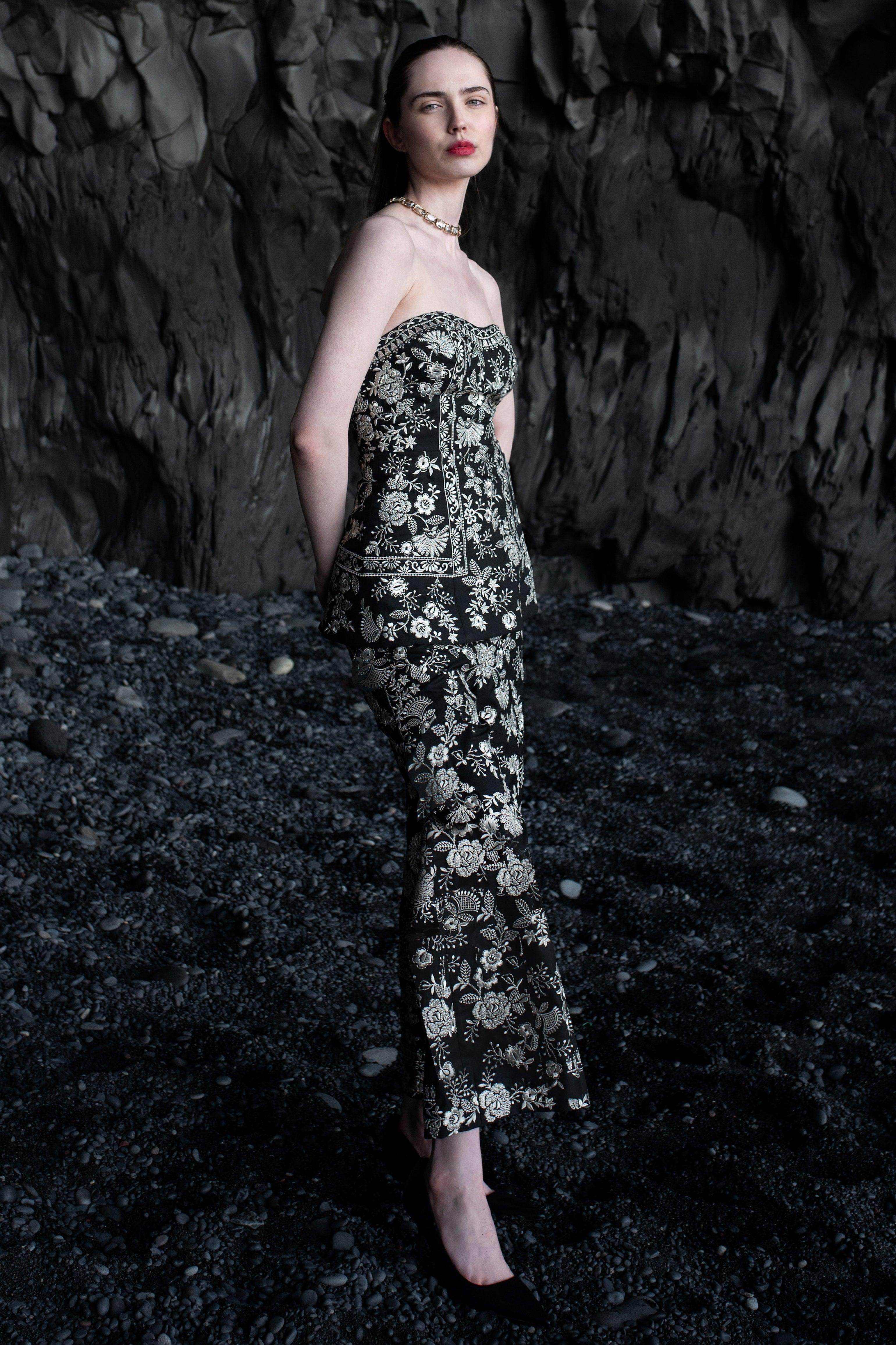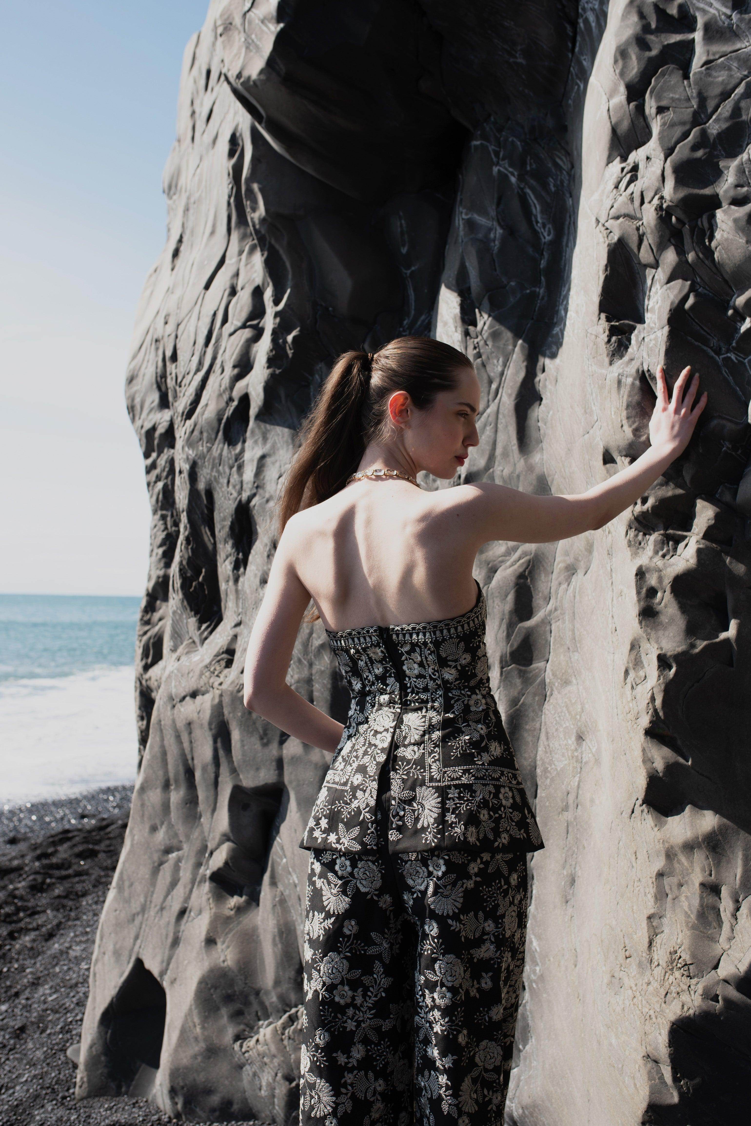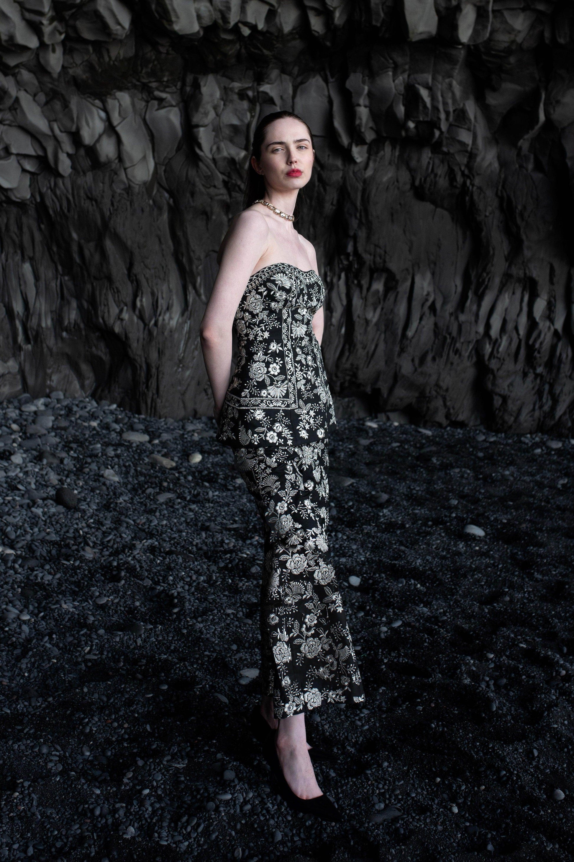 Black pant suit with placed allover floral embroidery in a contrast silver metallic thread. Study in embroidery techniques, the garment has a mix of cross stitch, rice stitch and satin stitch. Corset inspired peplum style off-shoulder top with a sweetheart neckline comes with detachable straps. Placed borders within the allover floral embroidery on the front and back help accentuate the body. Removable pad pockets in the front, full zip closure at the back. Paired with matching wide-legged pants that have strategically placed border embroidery within the allover floral design. The pant is semi-elasticated and has pockets on the side. Hook-eye and zip closure at the front. Both garments are fully lined. Made of all weather suiting material.