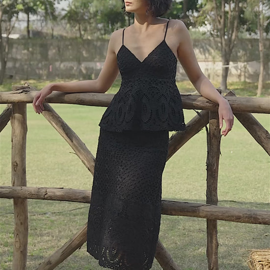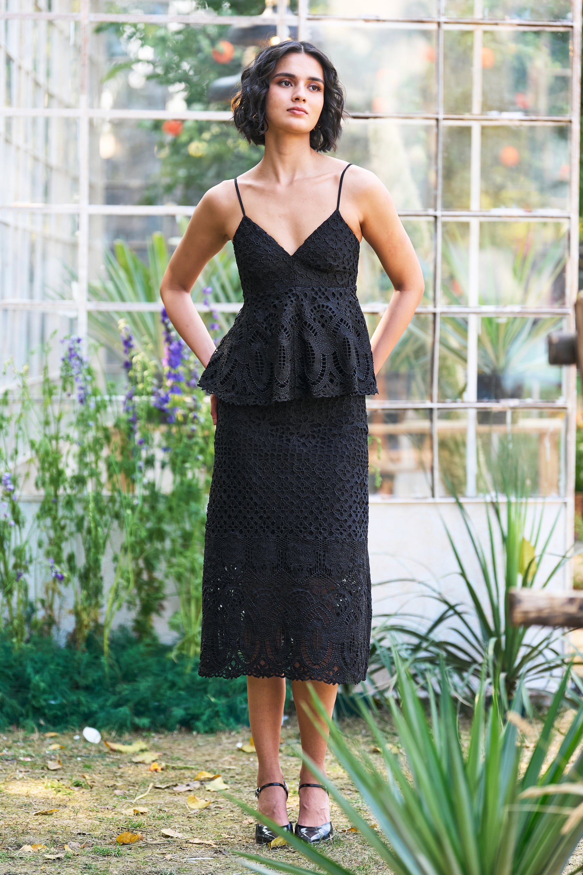 Midi-length skirt in metallic black lace with cutwork embroidery and a subtle shimmer. Gentle A-line silhouette with a scalloped hem. Internally elasticated waistband. Concealed zip and hook/eye closure at the side. Semi-lined till the knee.