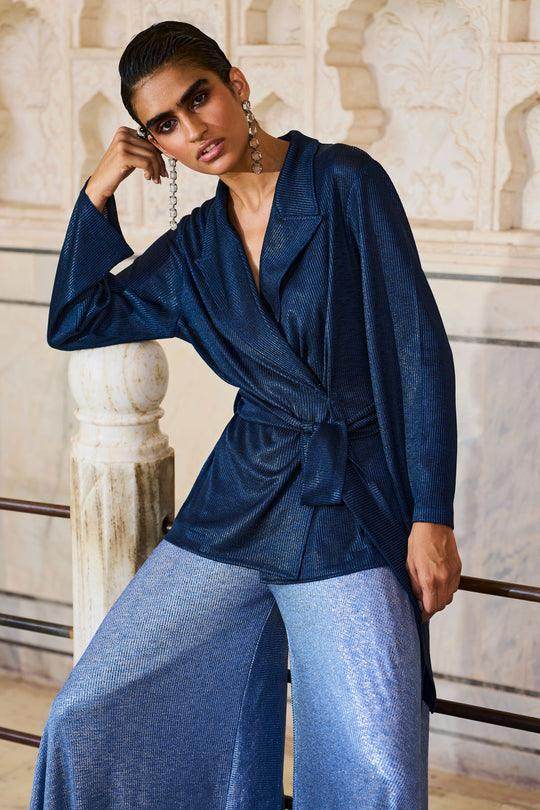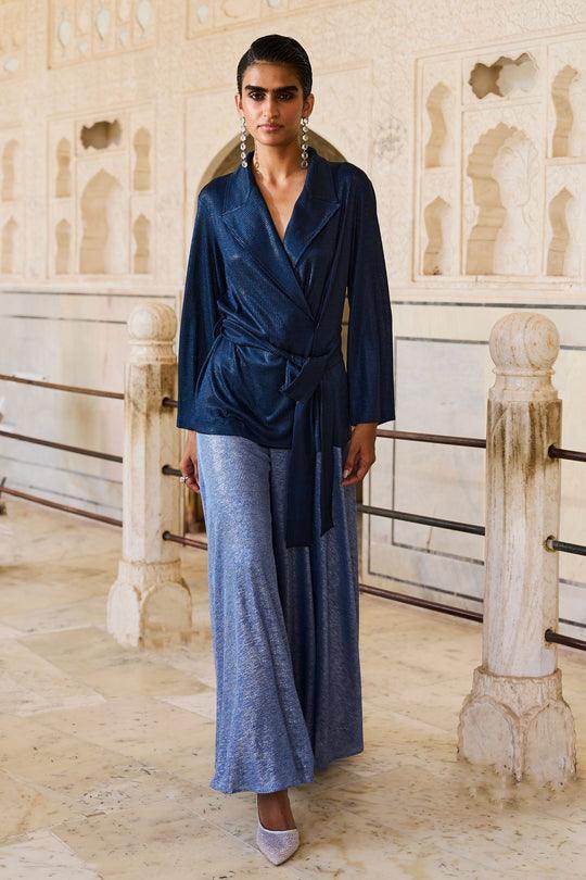 Tailored wrap style shirt in a shimmering, drapey navy metallic textural knit fabric. Blazer inspired notch collar, full sleeves, and an adjustable self-fabric tie belt detail. Paired with an exaggerated wide-legged drapey pant in a lighter blue shimmering, metallic textured knit fabric. Semi-elasticated at the waist. Hook/eye and zip closure in the front with pockets in the sides. Garment is fully lined.
