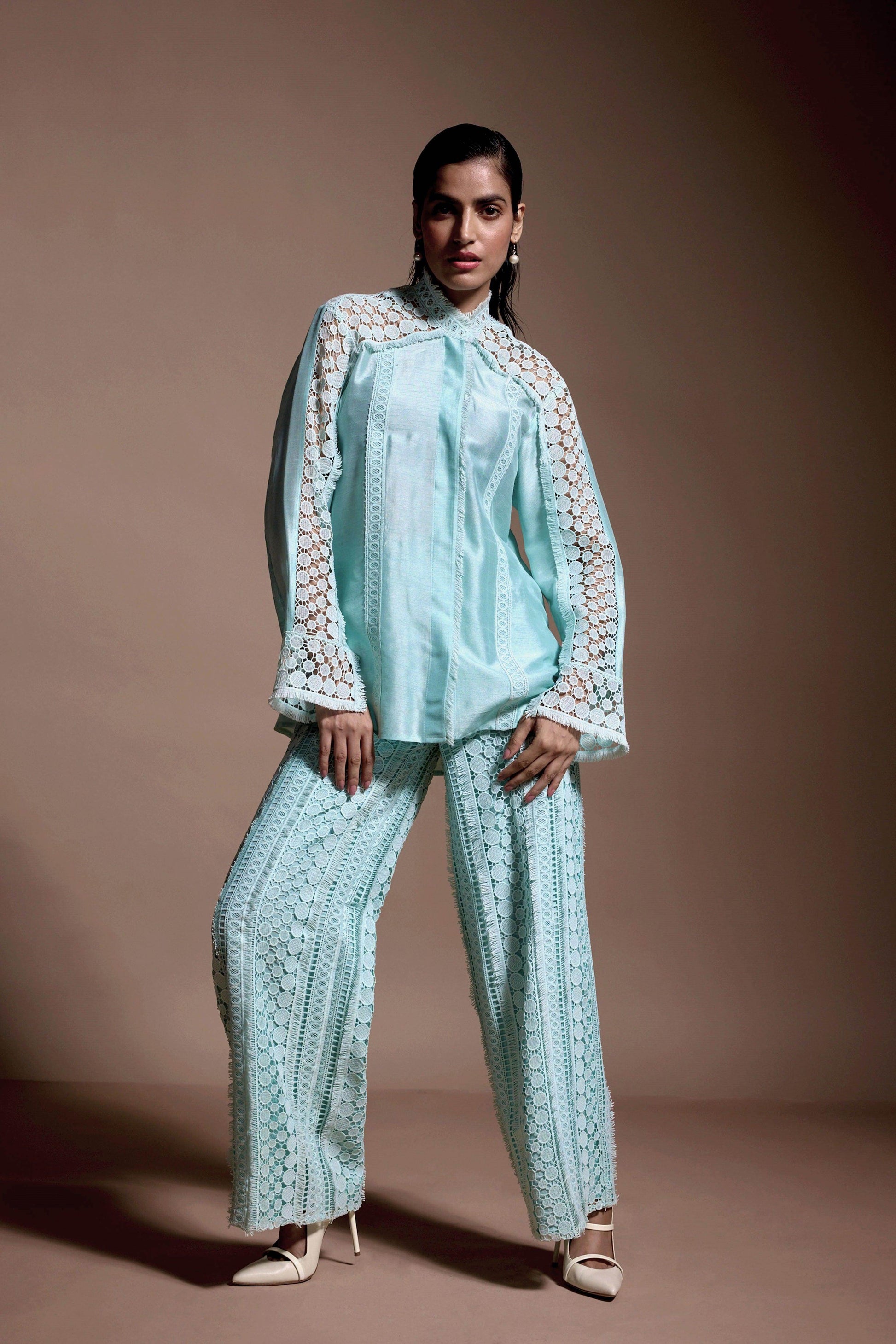 Textured shirt with tonal geometric lace and soft fringe detailing. Features a lace band collar and concealed placket with geometric lace appliqué down the front. Detailed with lace inserts on the back of the sleeves and a lace panel yoke with an inverted box pleat at the back. The cuffs have lace and soft fringe edges, finished with loop button closures.