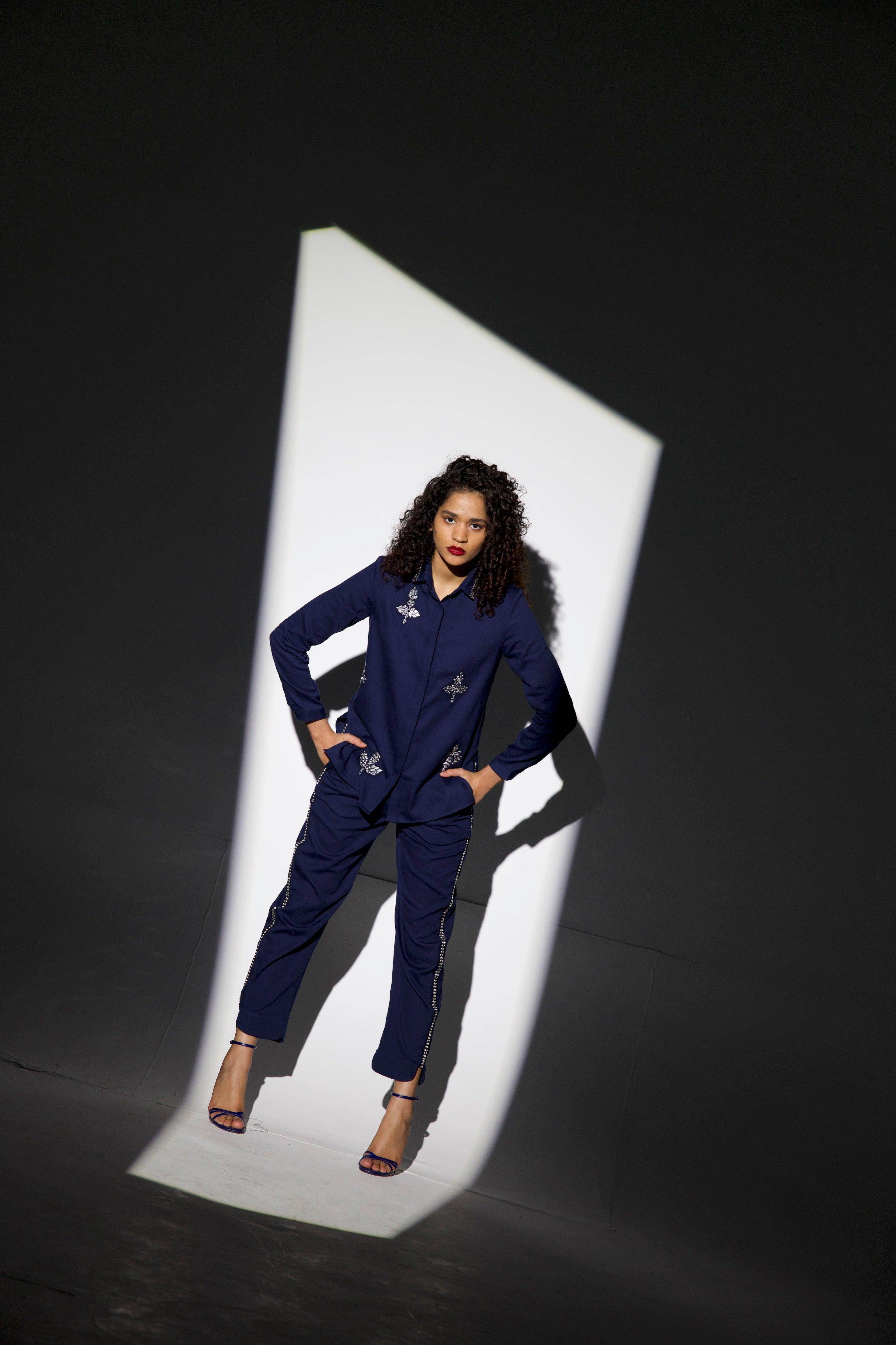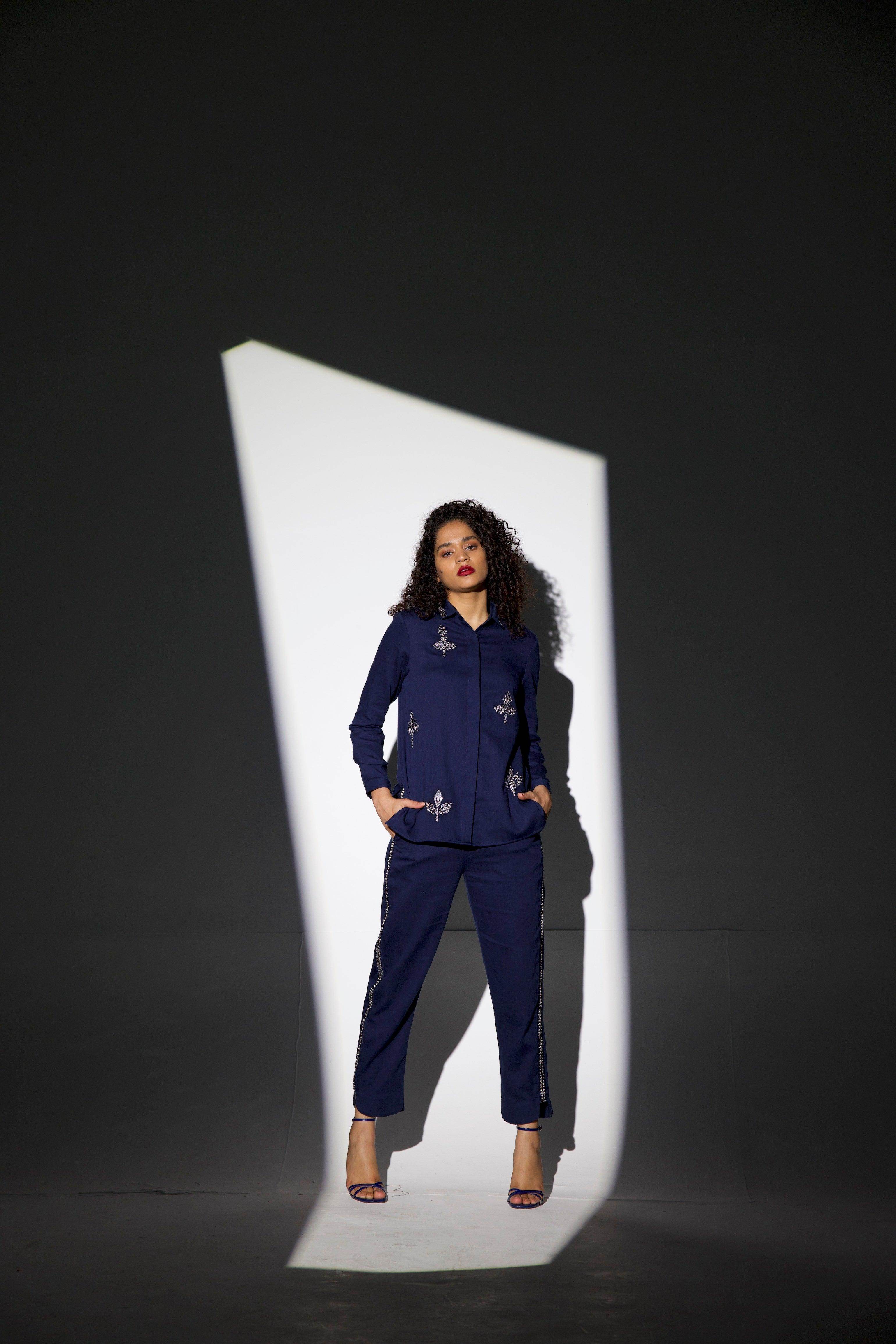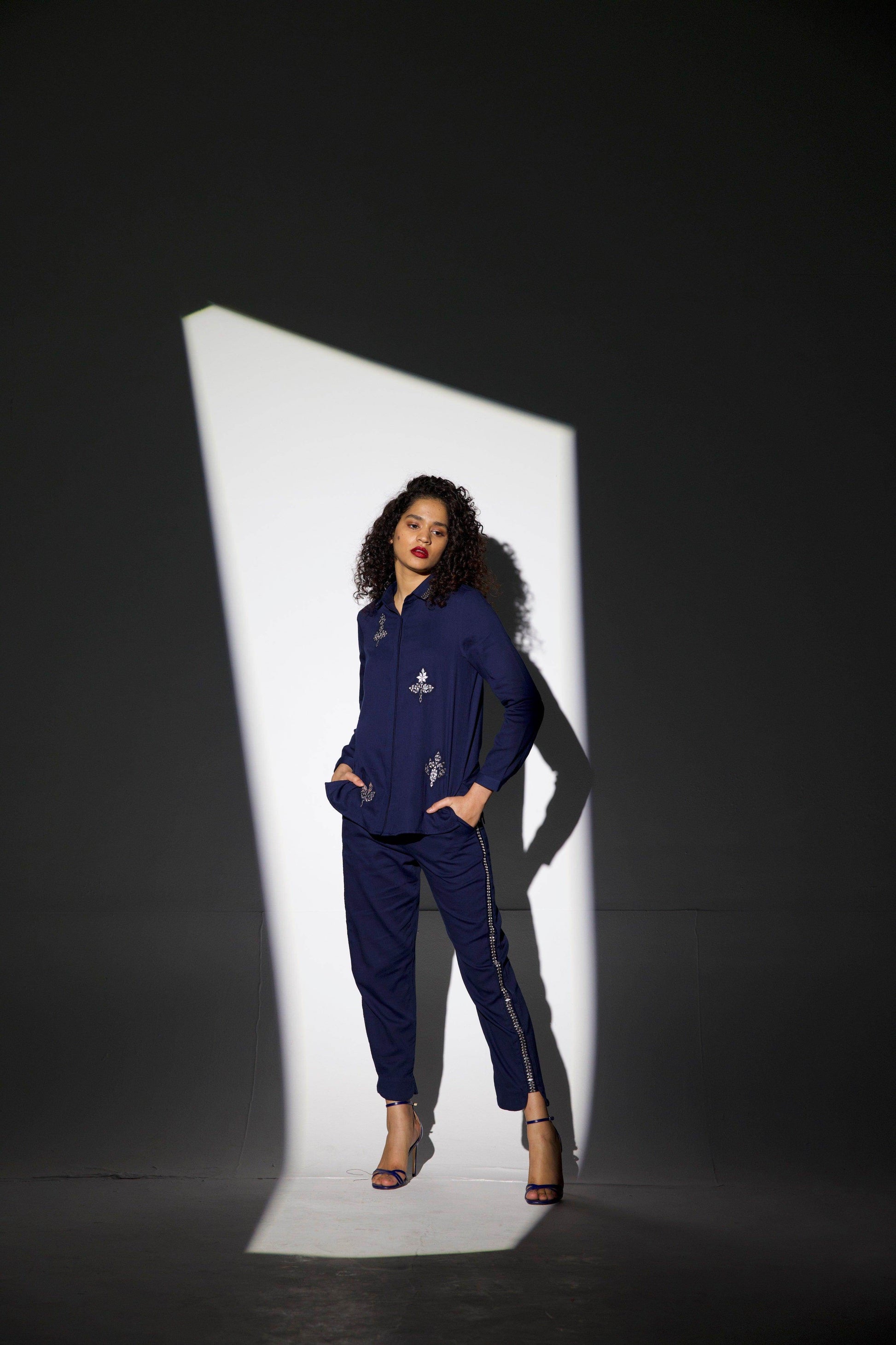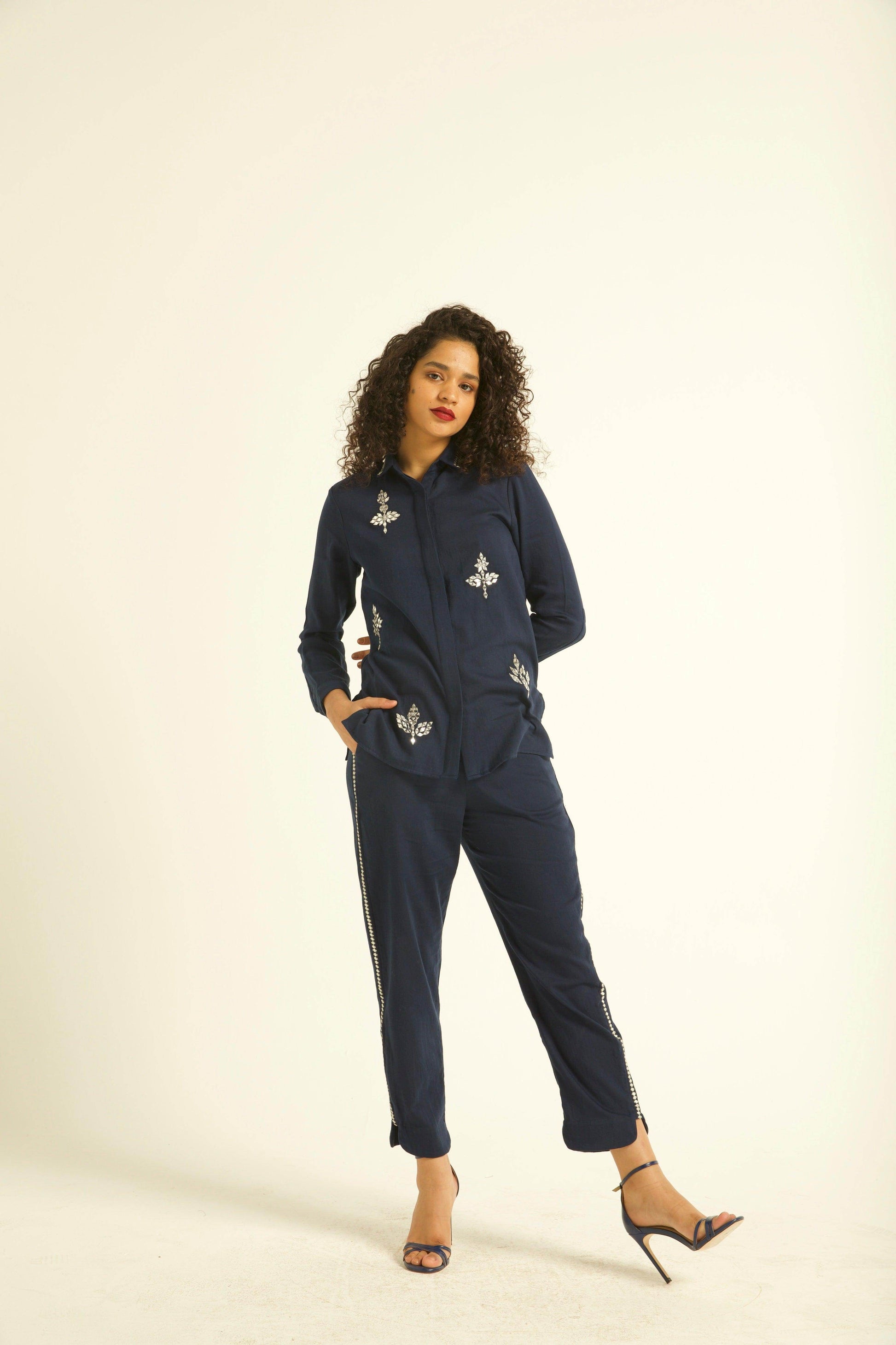 Mirror embroidered shirt with embroidery on the collar, front and motif on the back. Organic viscose. Button-down. Regular fit shirt.
