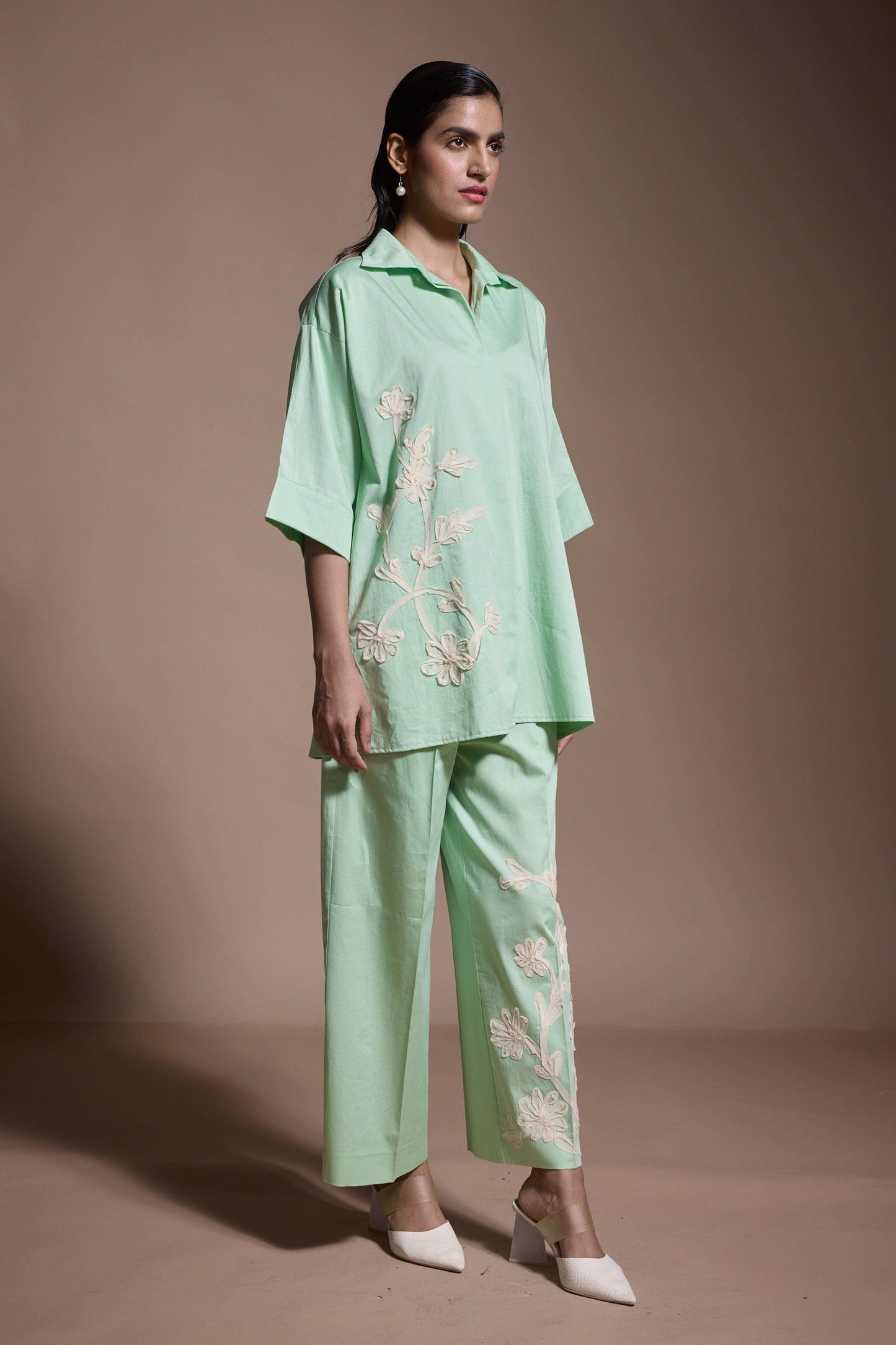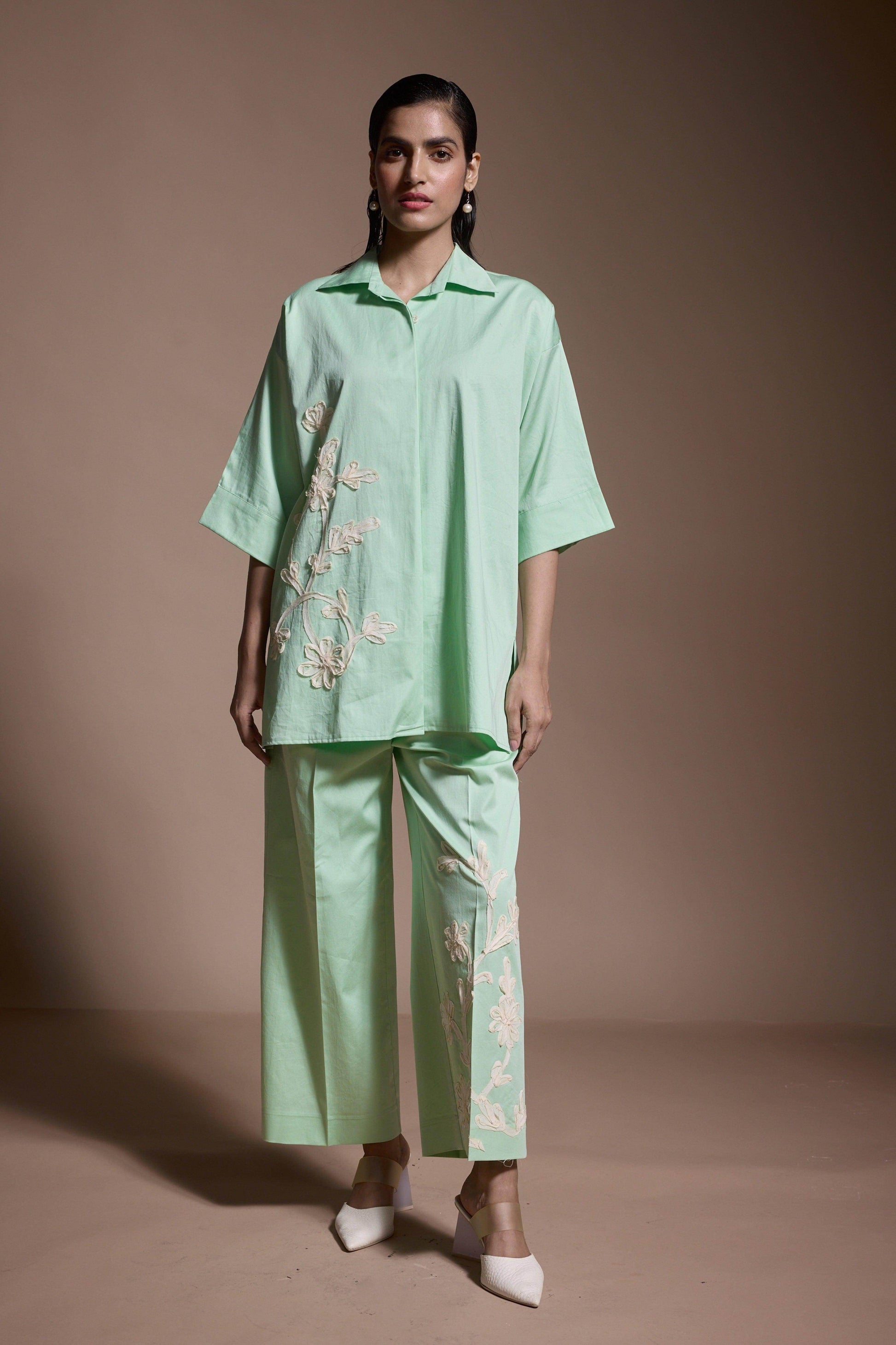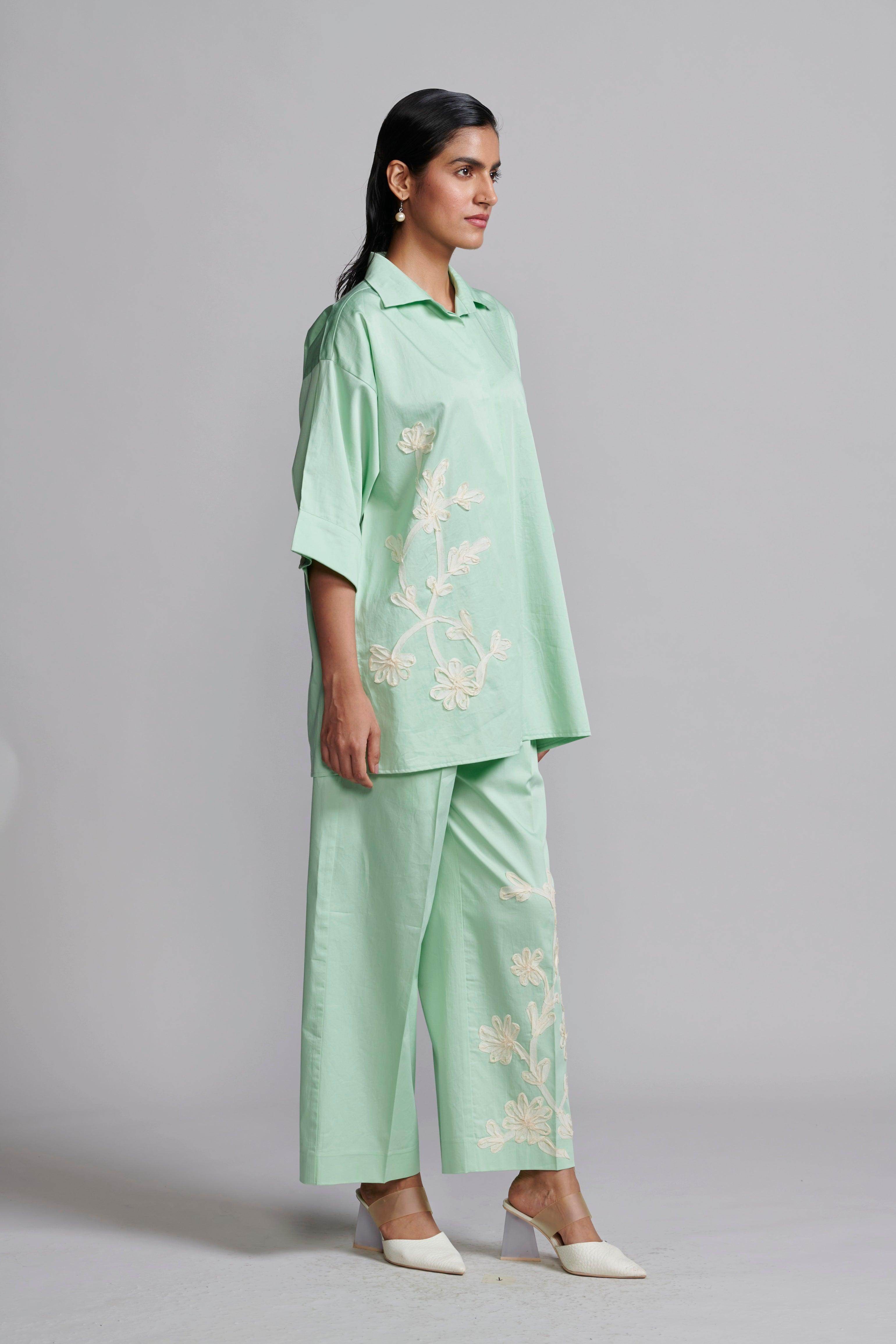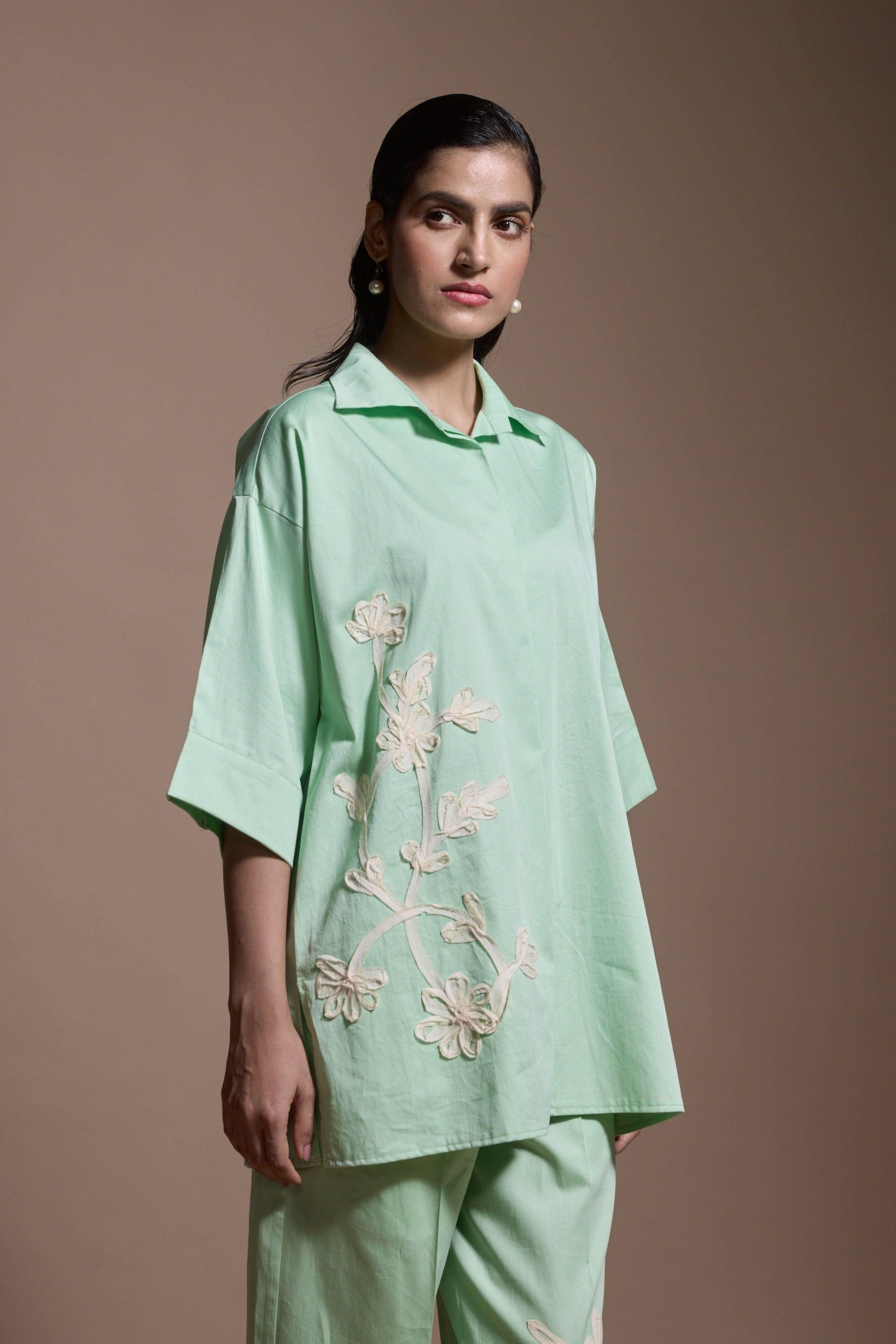 Mint green shirt with natural ribbon embroidery. Relaxed fit with boxy half sleeves, double button closure, concealed placket, and side slits. Classic shirt collar.