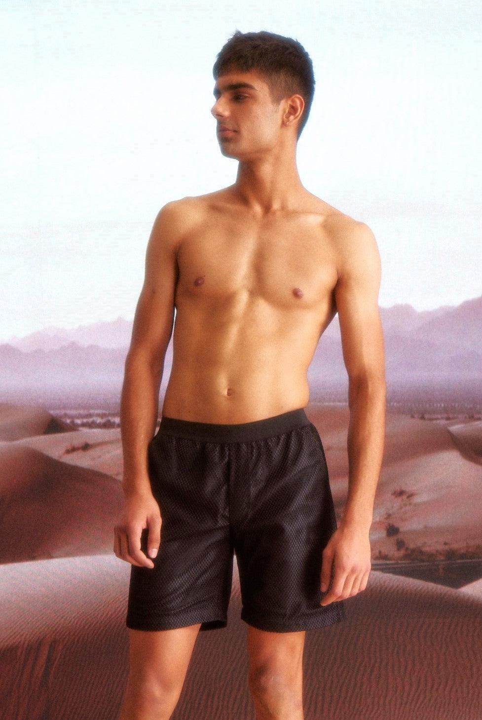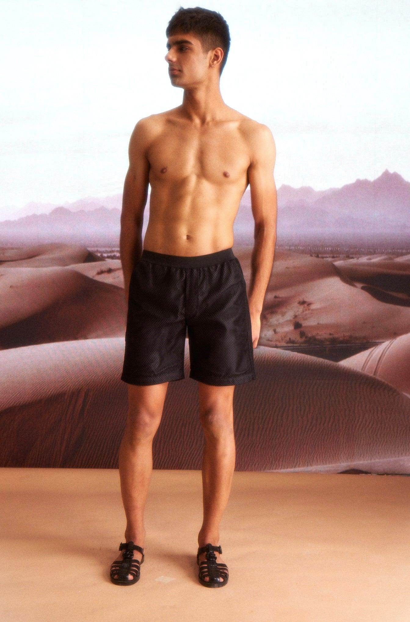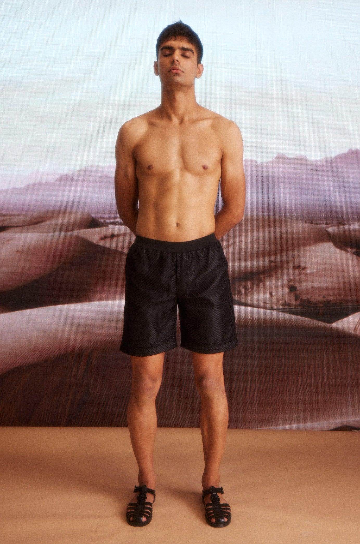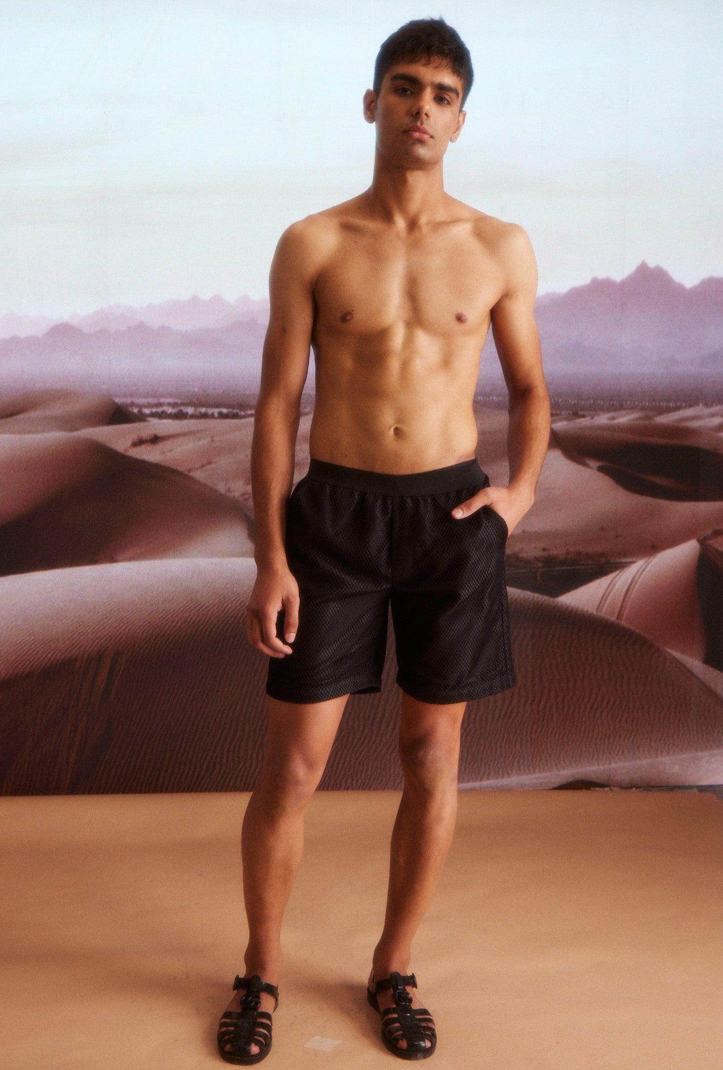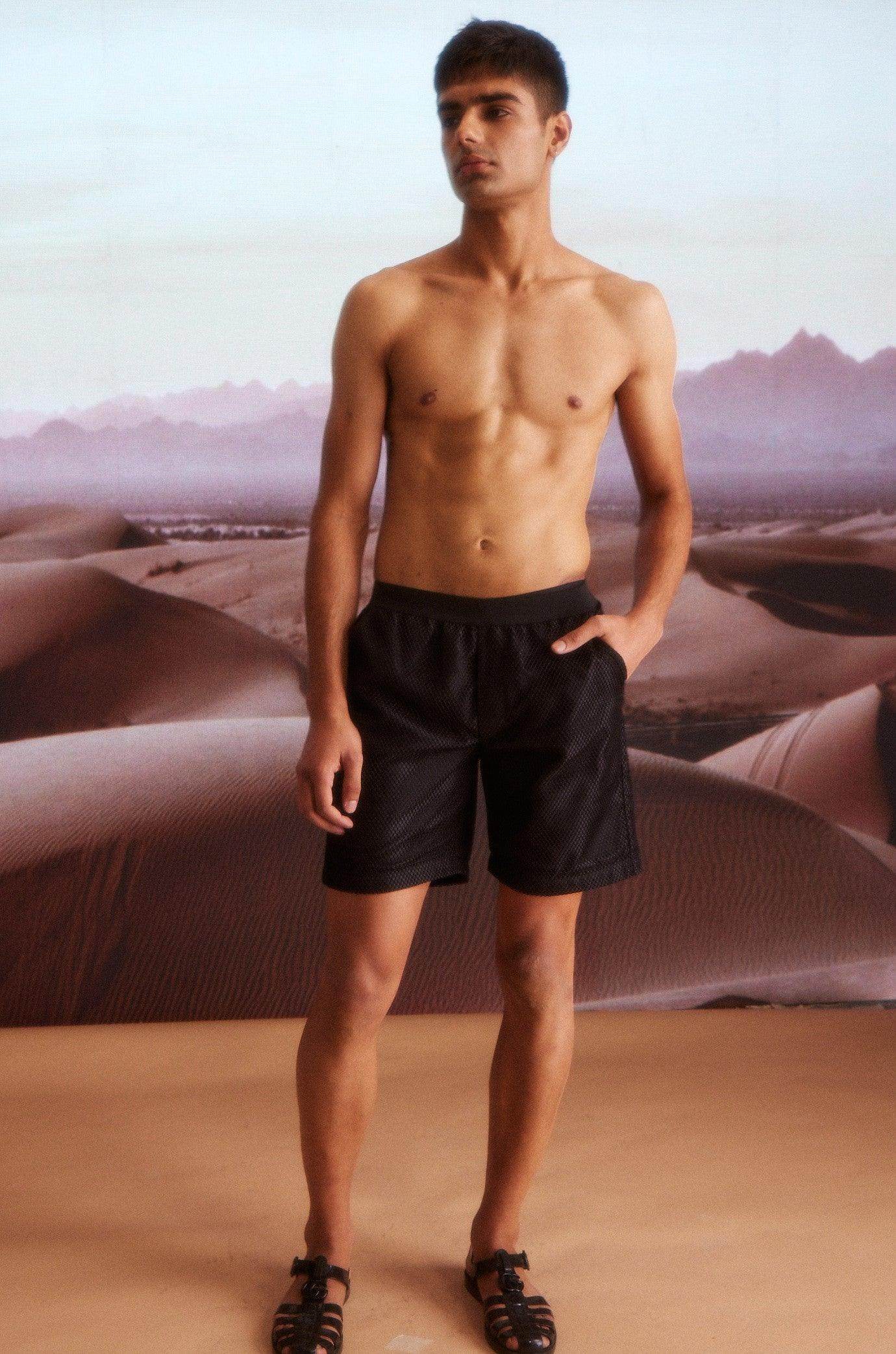 Black on black tonal textured swim shorts. Made of sustainably recycled polyester mesh and recycled polyester lining. Exposed tonal elastic at the waist. Pockets on the side, zip fly.