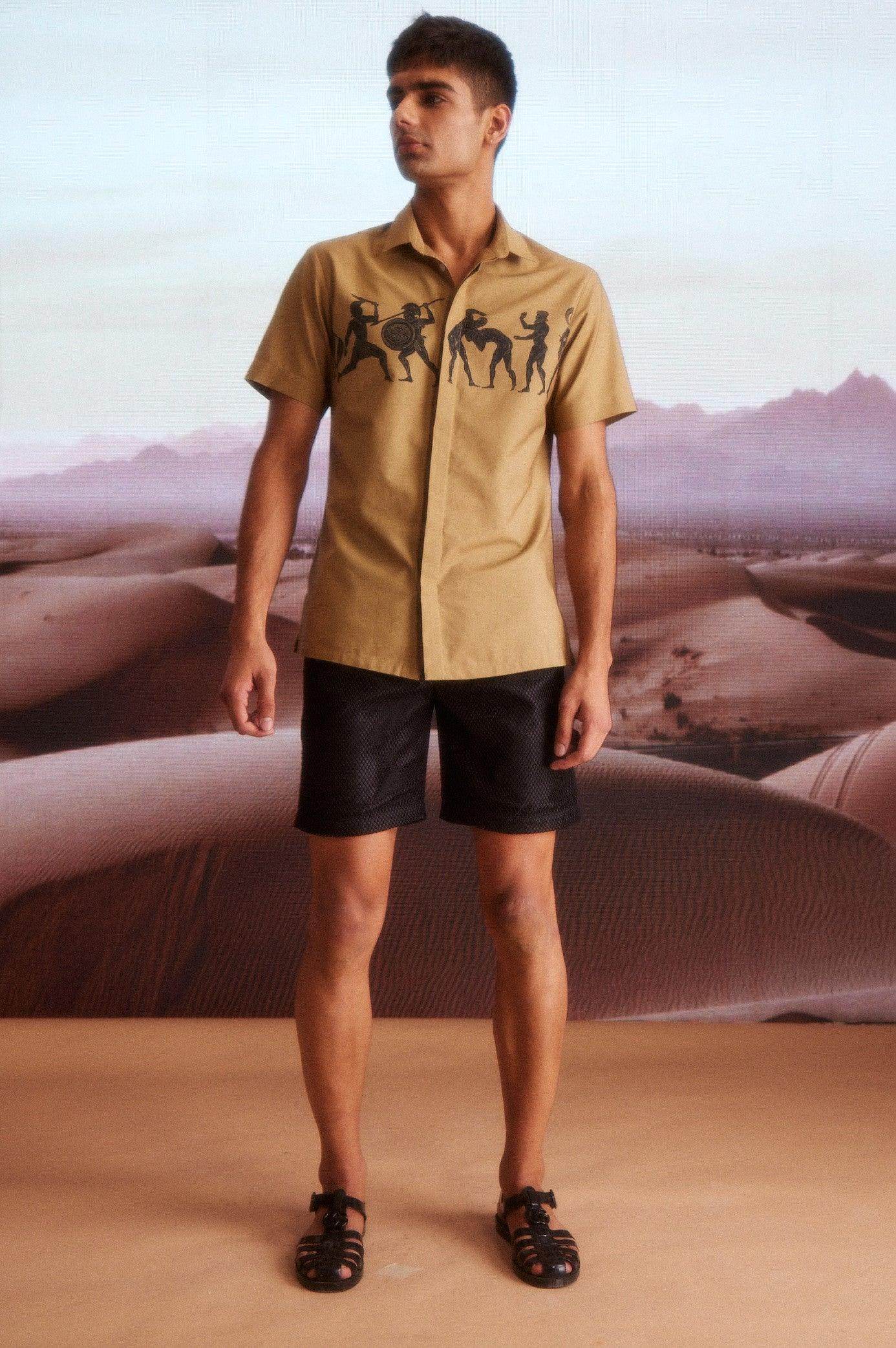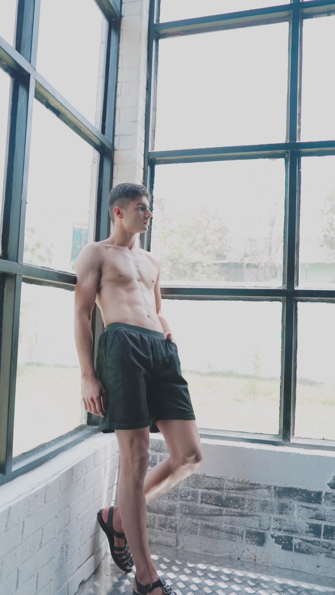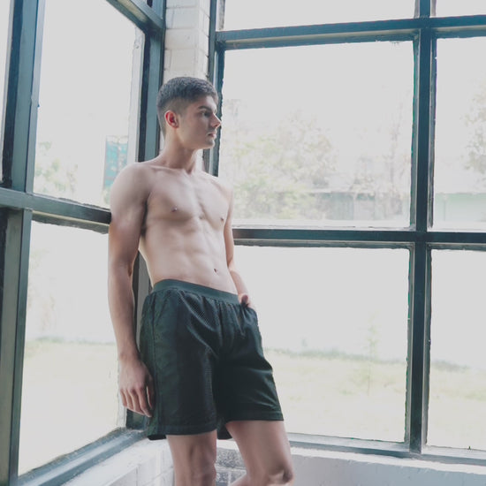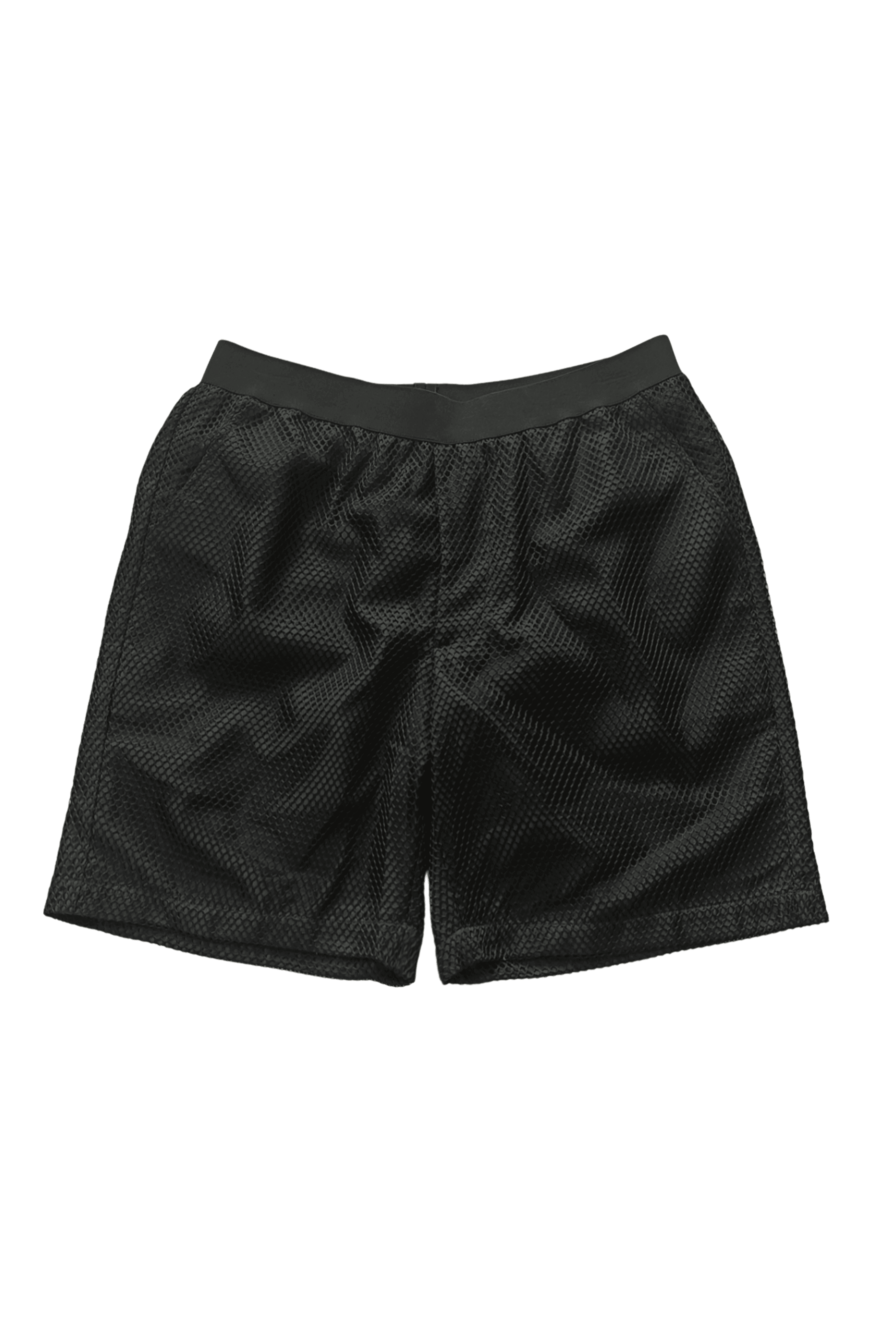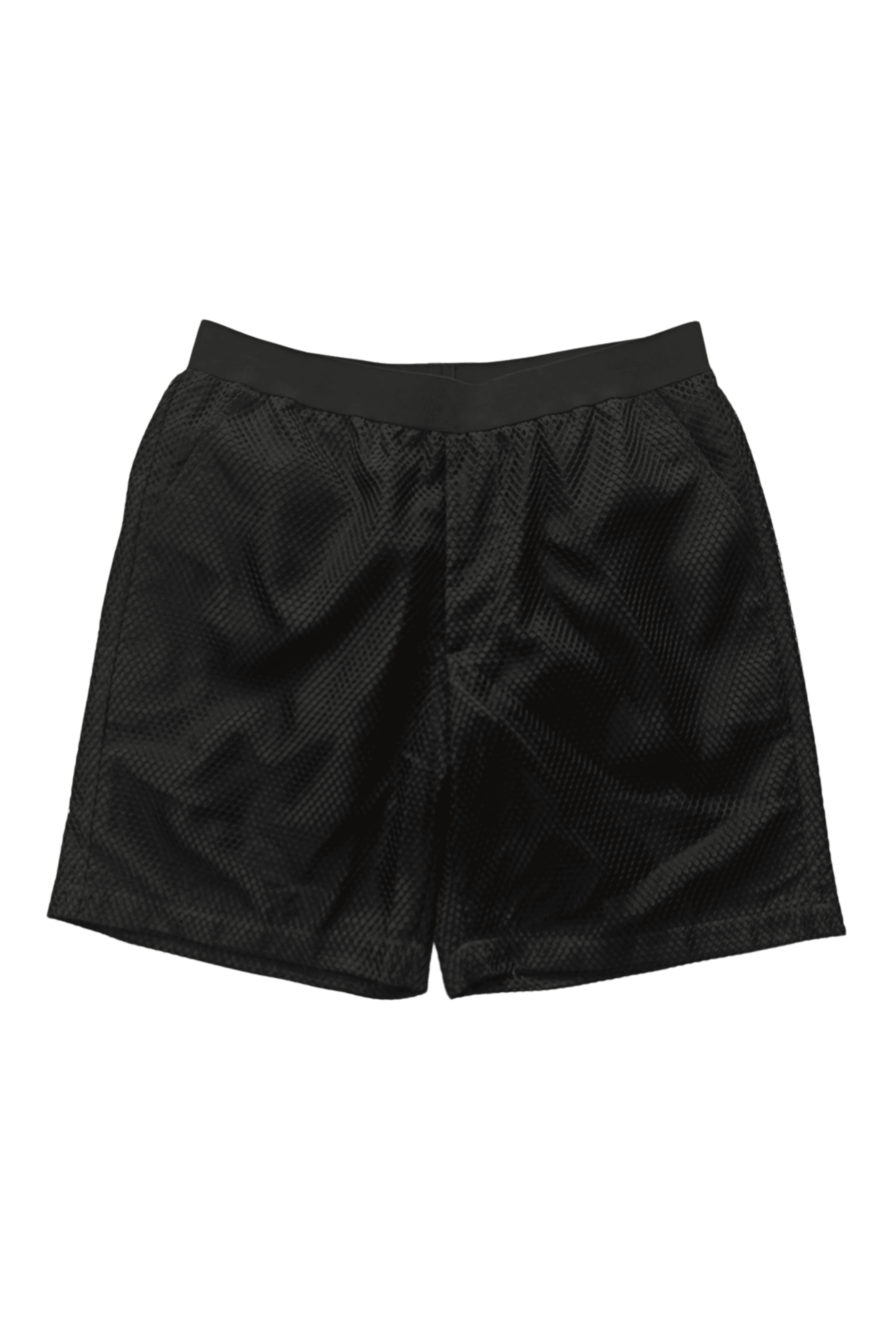 Black on black tonal textured swim shorts. Made of sustainably recycled polyester mesh and recycled polyester lining. Exposed tonal elastic at the waist. Pockets on the side, zip fly.