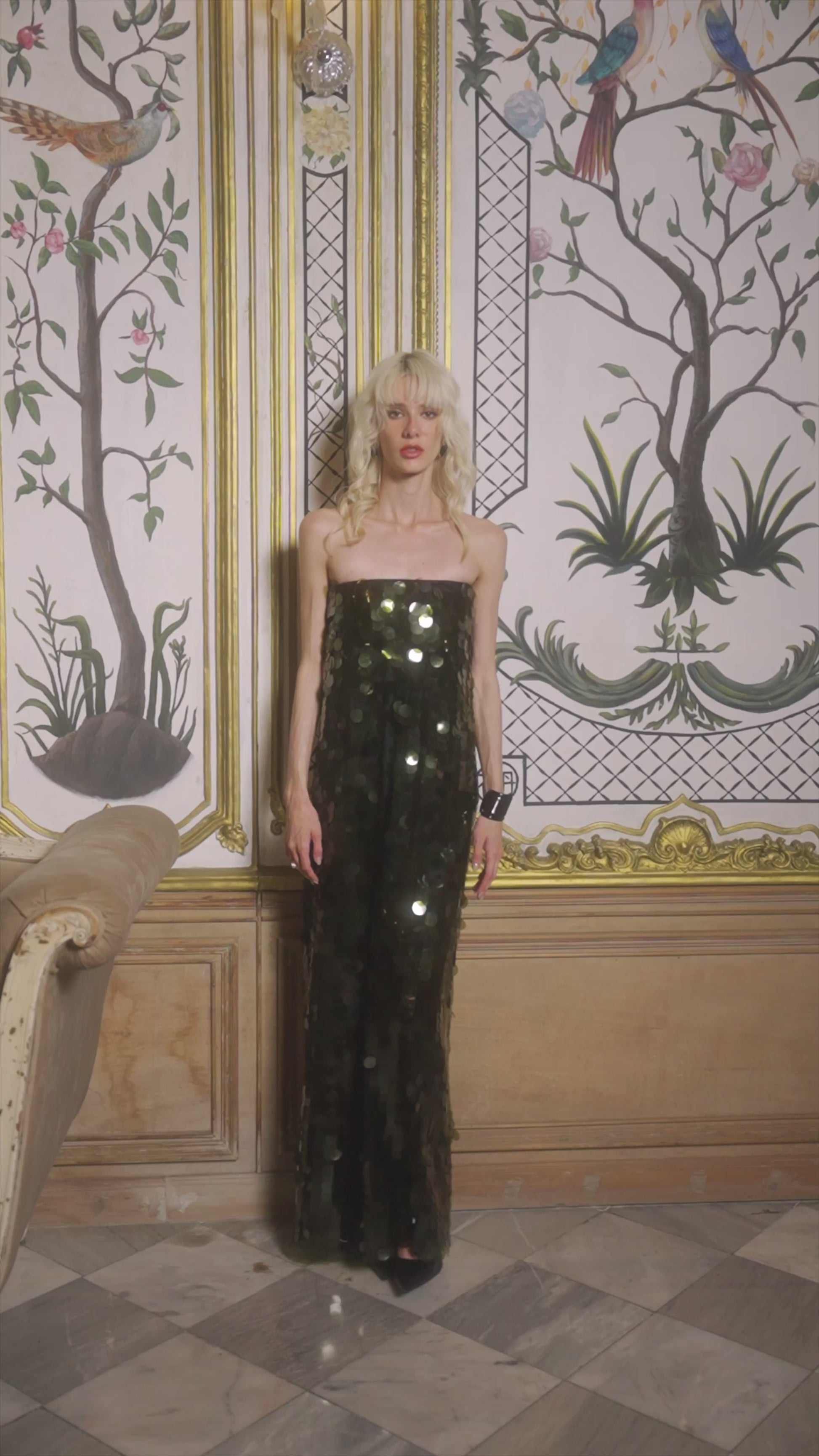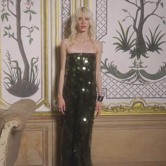 Olive-green paillette off-shoulder maxi dress with a gentle flare towards the hem. Keyhole with button closure at the back. Slit in the side. Comes with adjustable, detachable straps. Garment is fully lined.