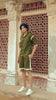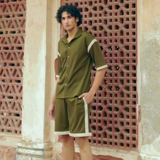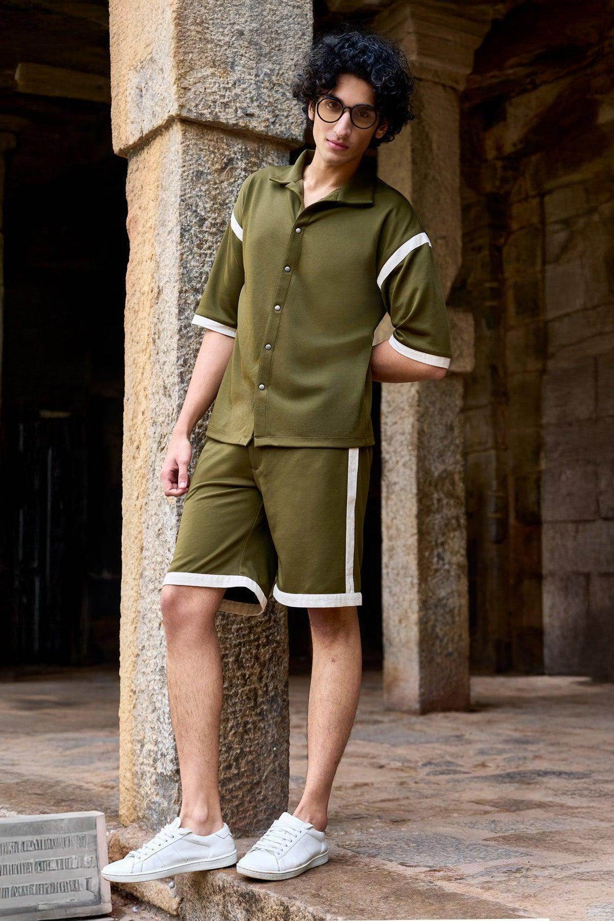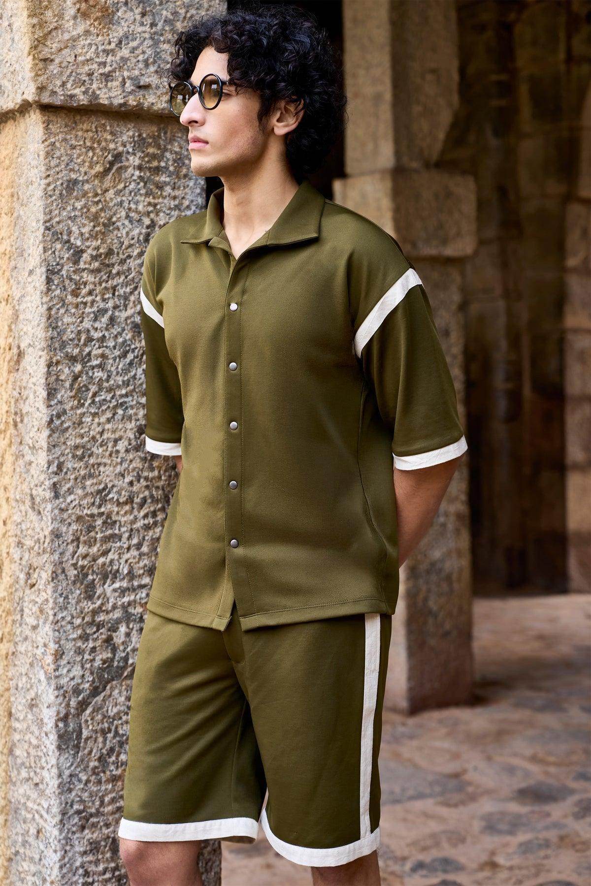 Knitted half sleeve shirt in olive green with natural linen stripe panels sewn on the drop shoulder and sleeve cuff. Metal snap button down front. Relaxed fit. Paired with matching knit shorts with natural linen stripe panels sewn on the sides and bottom hem. Pockets in the sides and back. Elasticated at the waist with a snap button and zip closure.