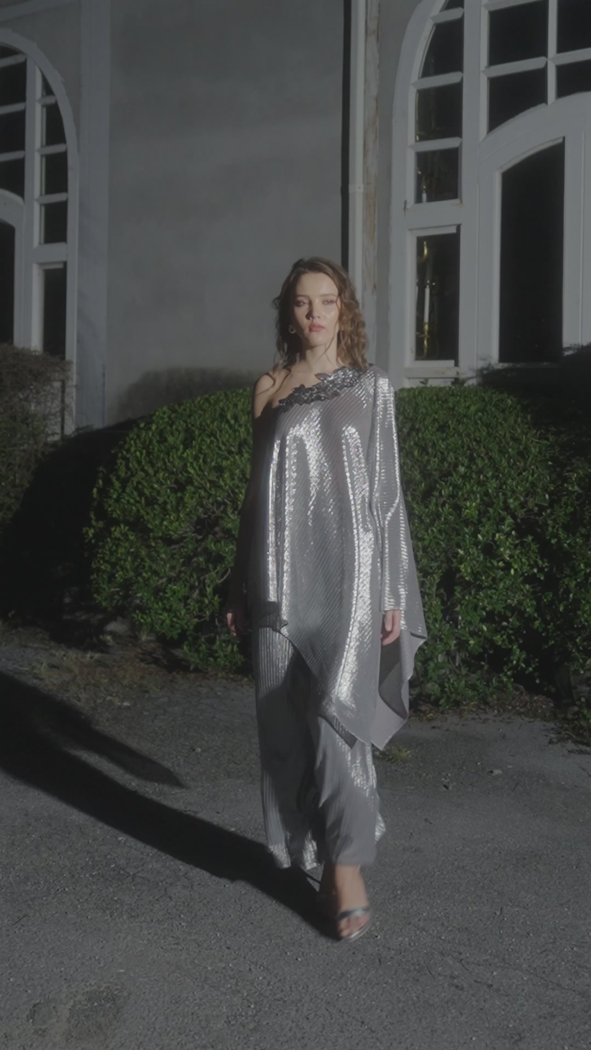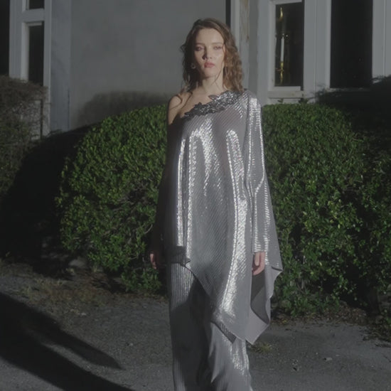 Metallic patterned one shoulder knit top with a soft shimmer and a fluid drape. Floral lace appliqué frames the round neckline. Cape-style draped sleeve and an asymmetric hemline that falls fluidly with movement. Paired with matching pant with a soft shimmer and fluid drape. Relaxed fit with a fully elasticated waist. Garment is fully lined.