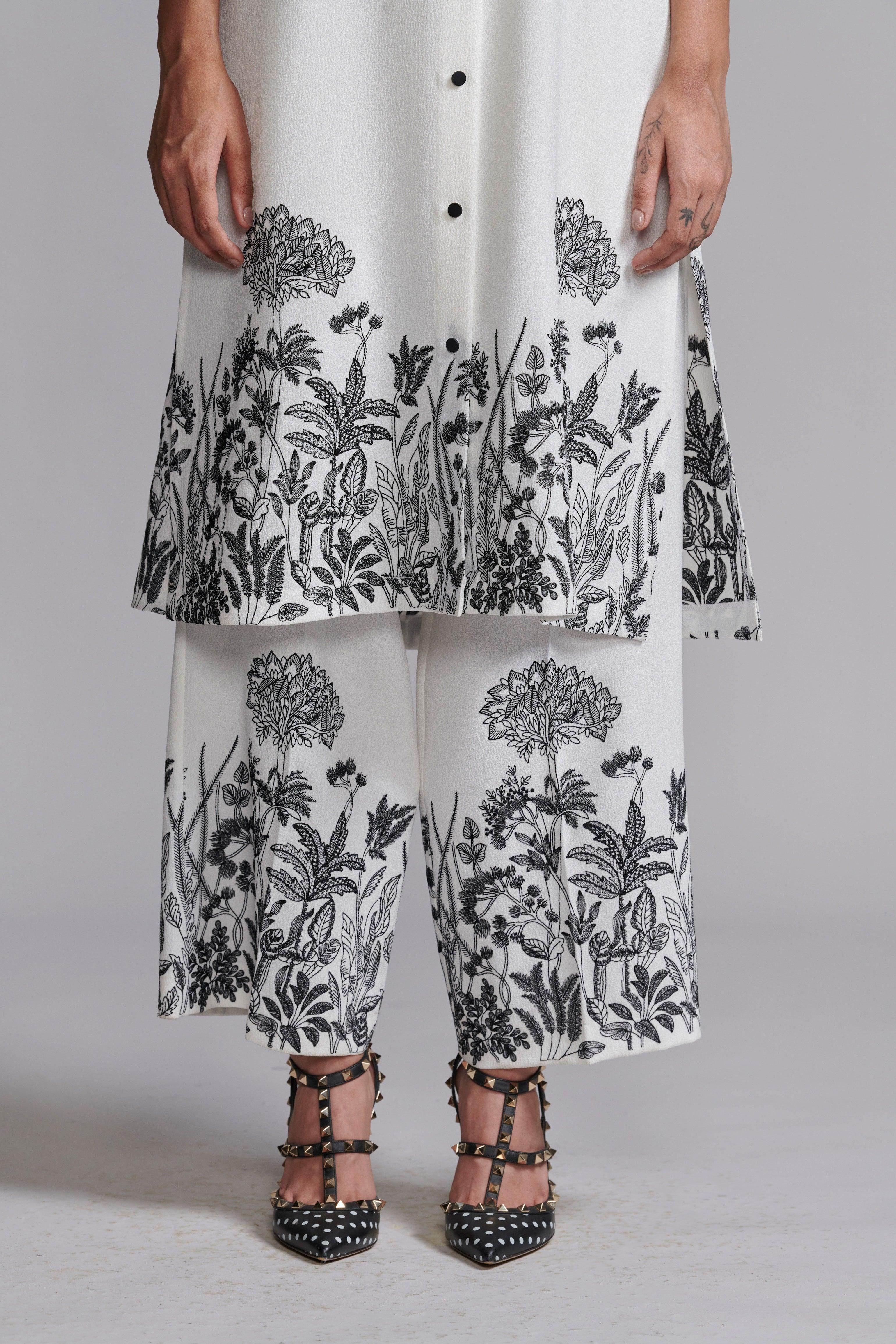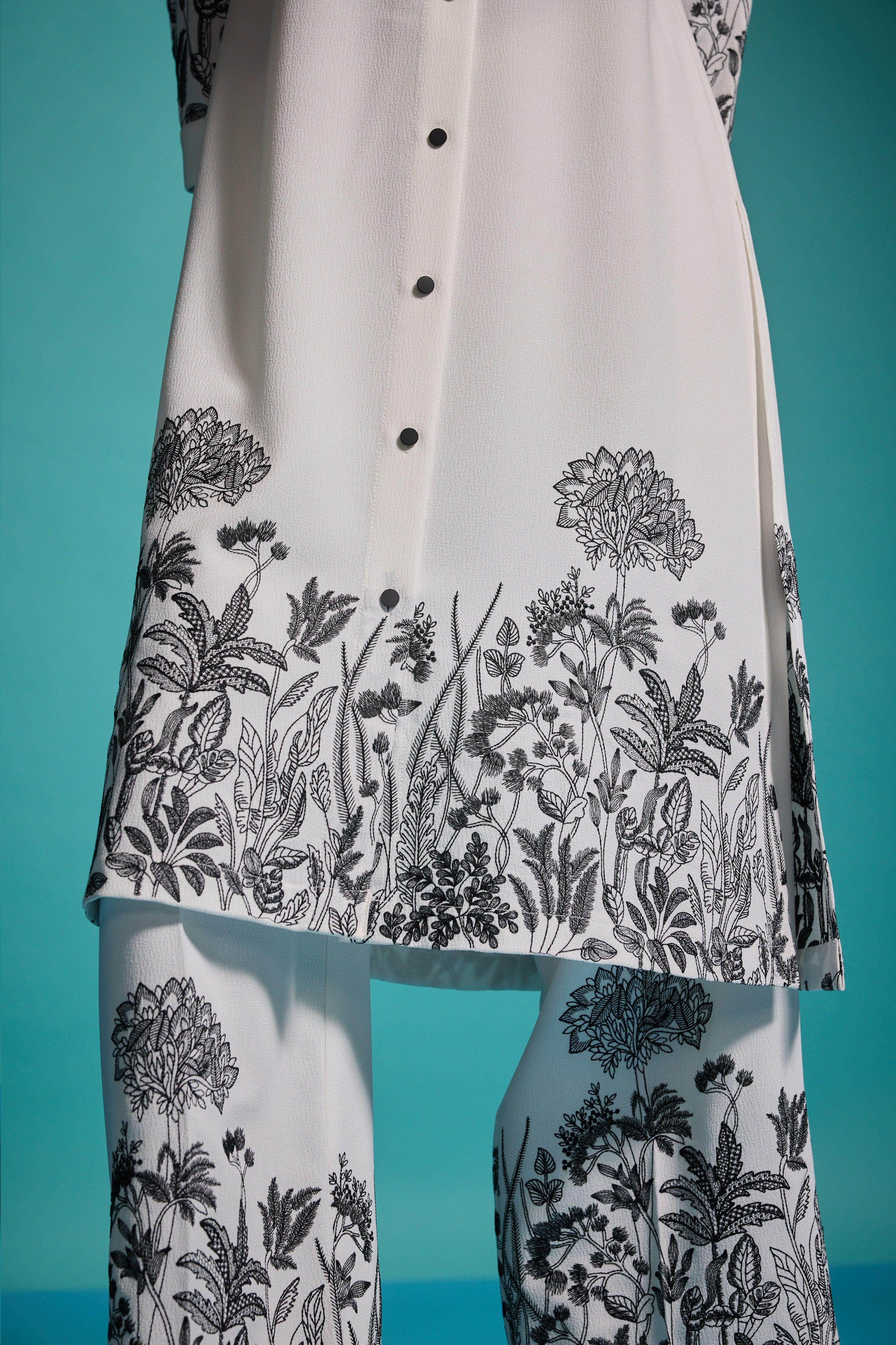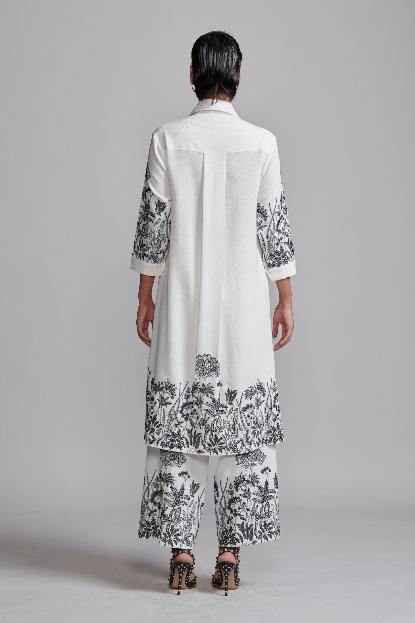 Ivory longline textured shirt with graphic contrast black floral outline embroidery on the sleeve cuffs and bottom hem. Features a shirt collar with contrast black button-down placket. Box pleat at the back. Cropped sleeves with cuffs and single black button closure. Made from organic, breathable natural viscose.