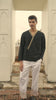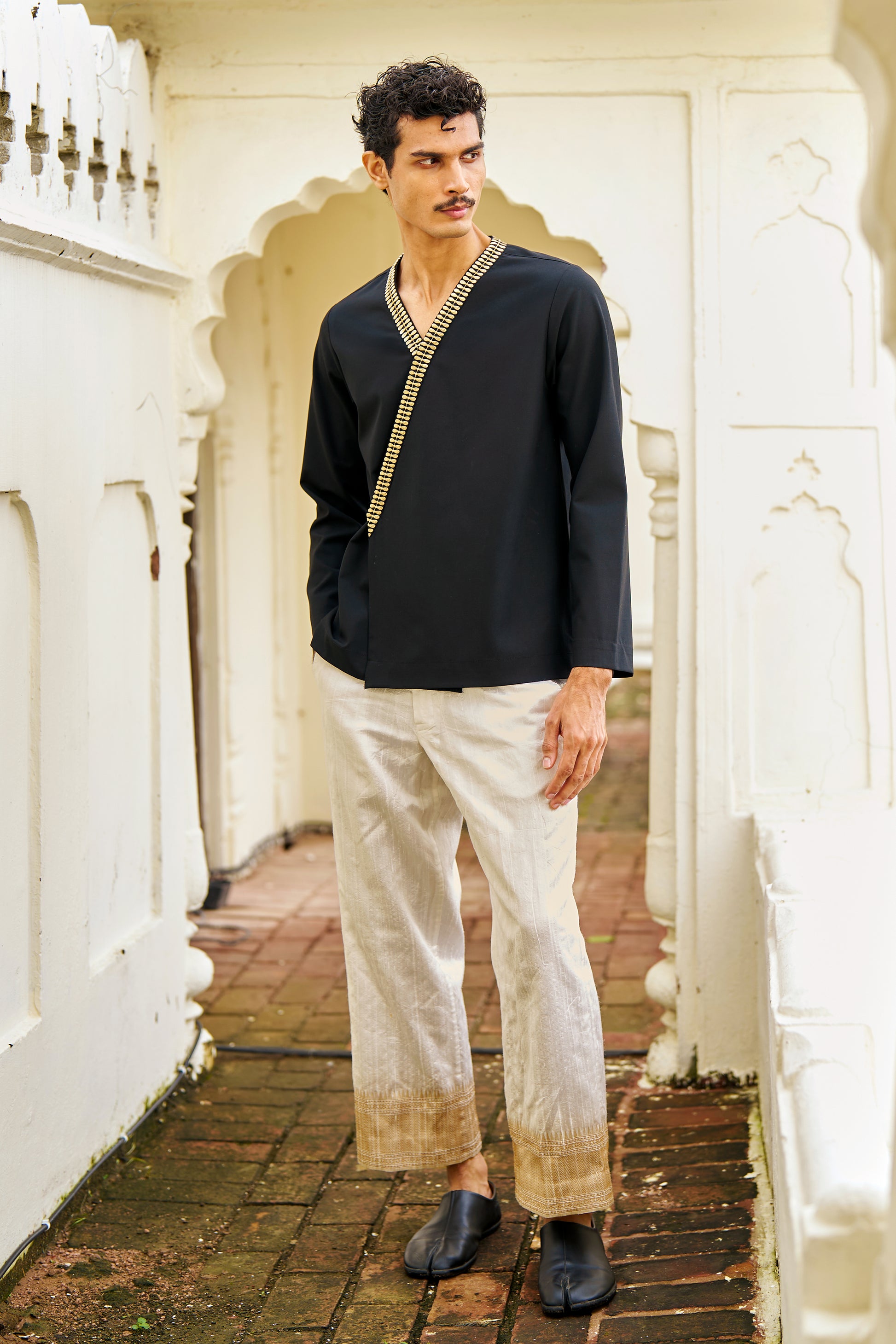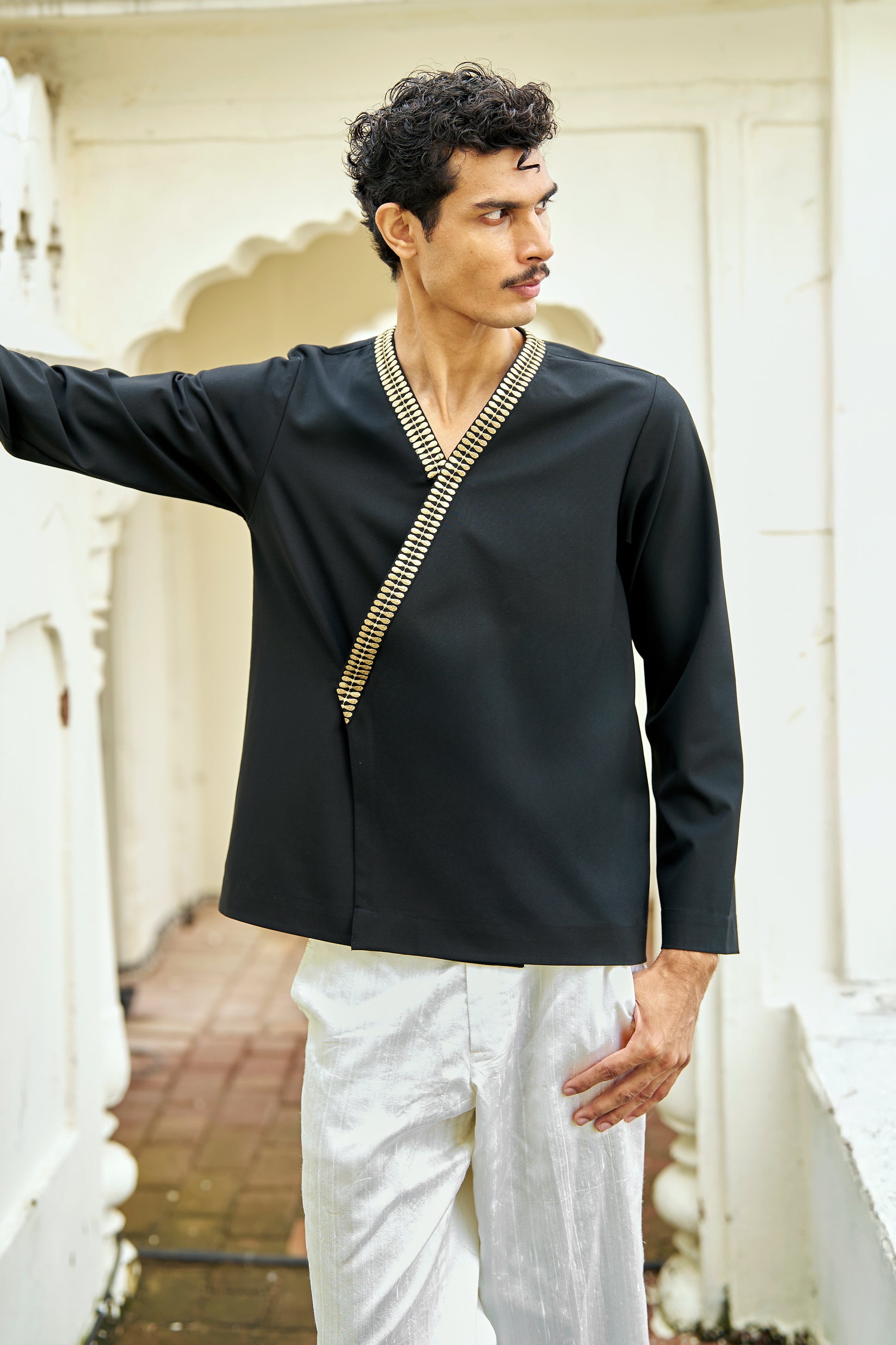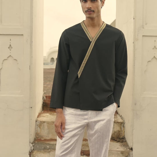 Front-overlap black shirt in all-weather suiting material. V-neckline framed with geometric gold metallic thread embroidery. Off-center concealed placket with snap-button closure. Full sleeves in a relaxed fit.