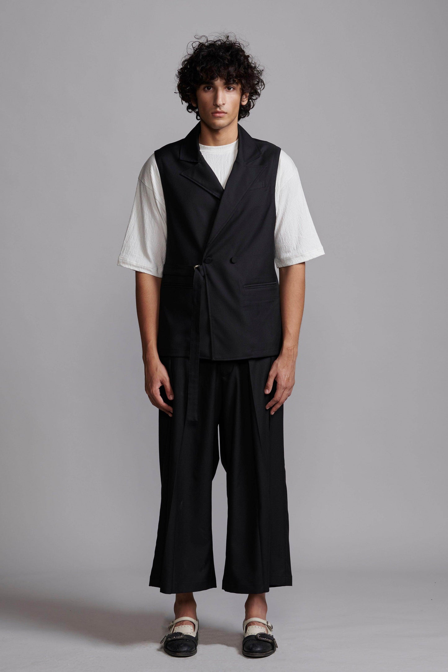 Black sleeveless double-breasted waistcoat-inspired jacket. Features a notch collar with two buttons and front pockets. Functional belt with metal buckle can be worn loose (American) or fitted (Italian). Unstructured and unlined. Made from all-weather suiting material.