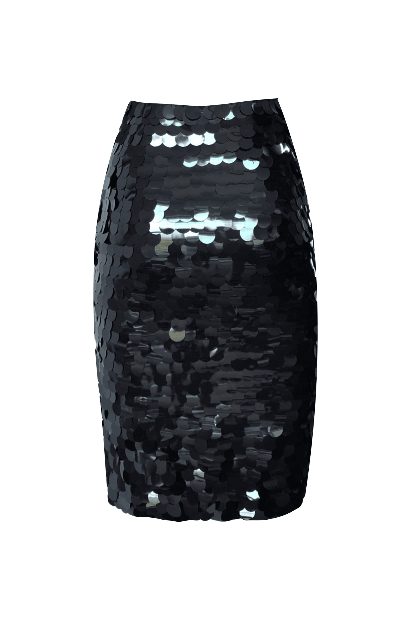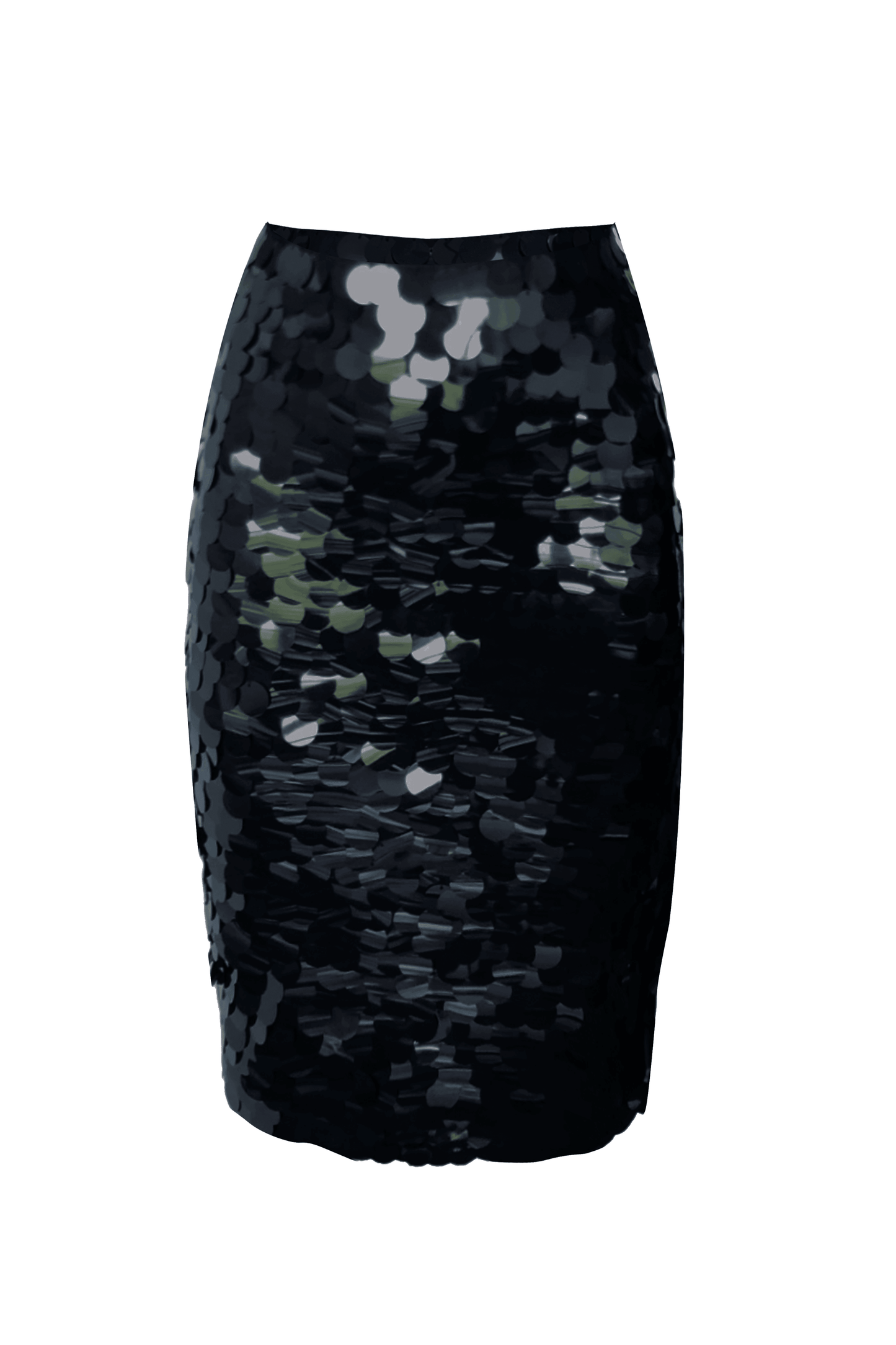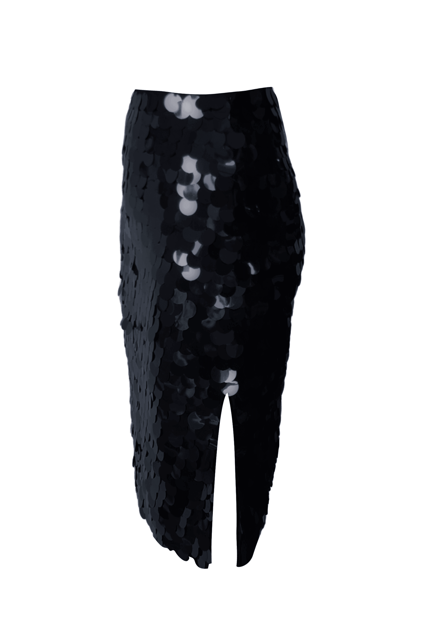 Cascading black paillette midi-length skirt. Zipper on the side. The garment is fully lined.