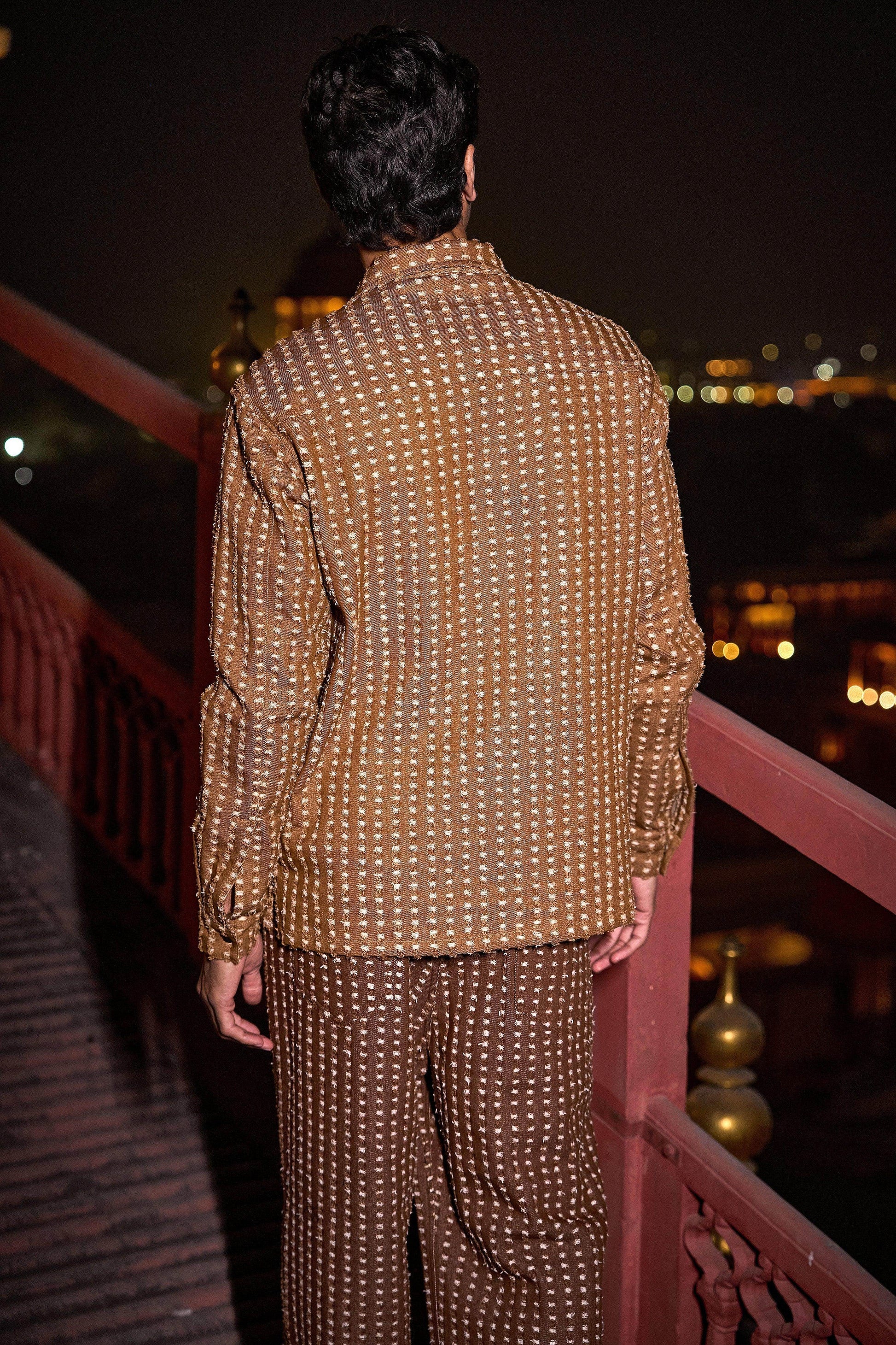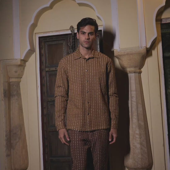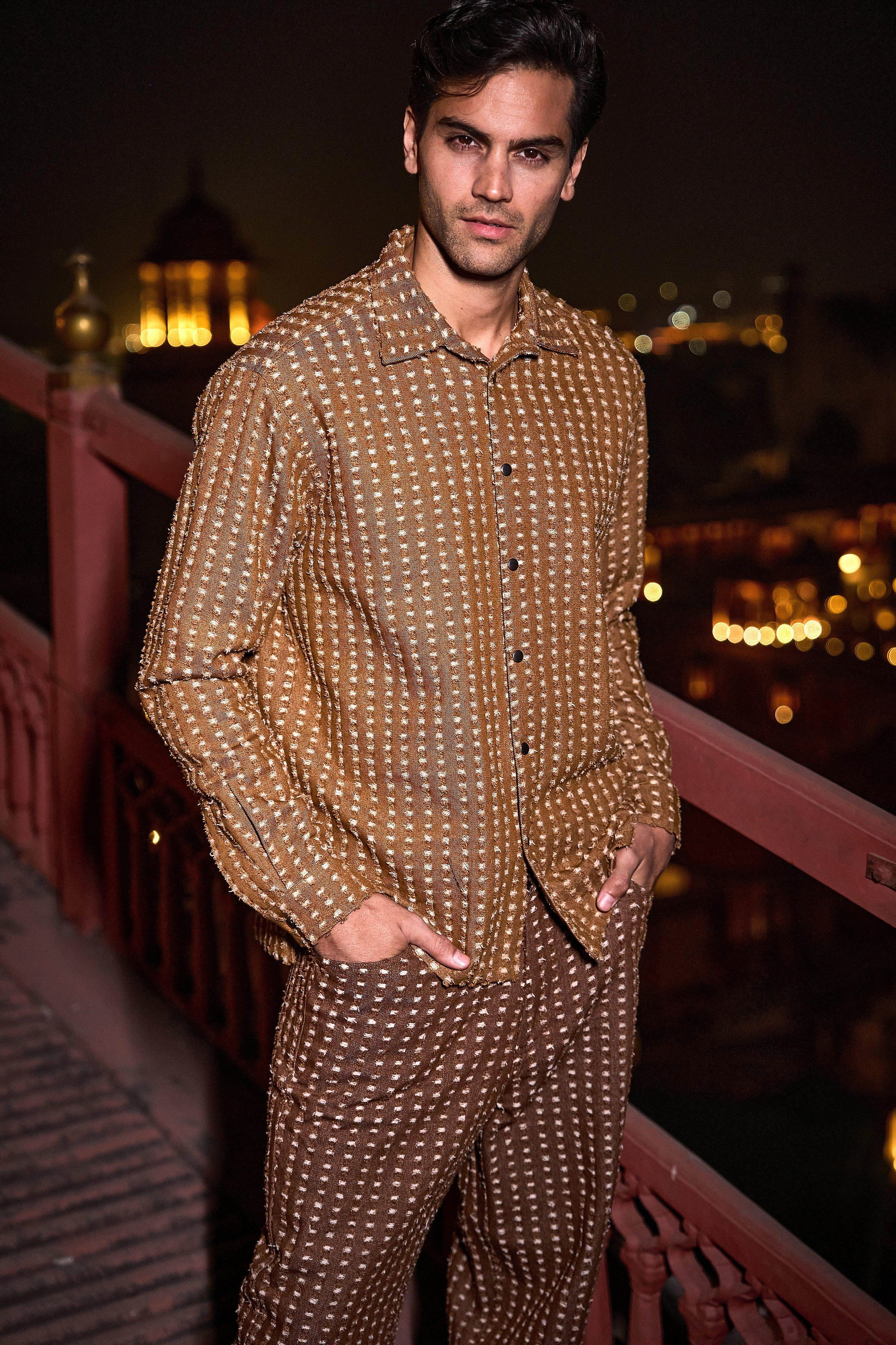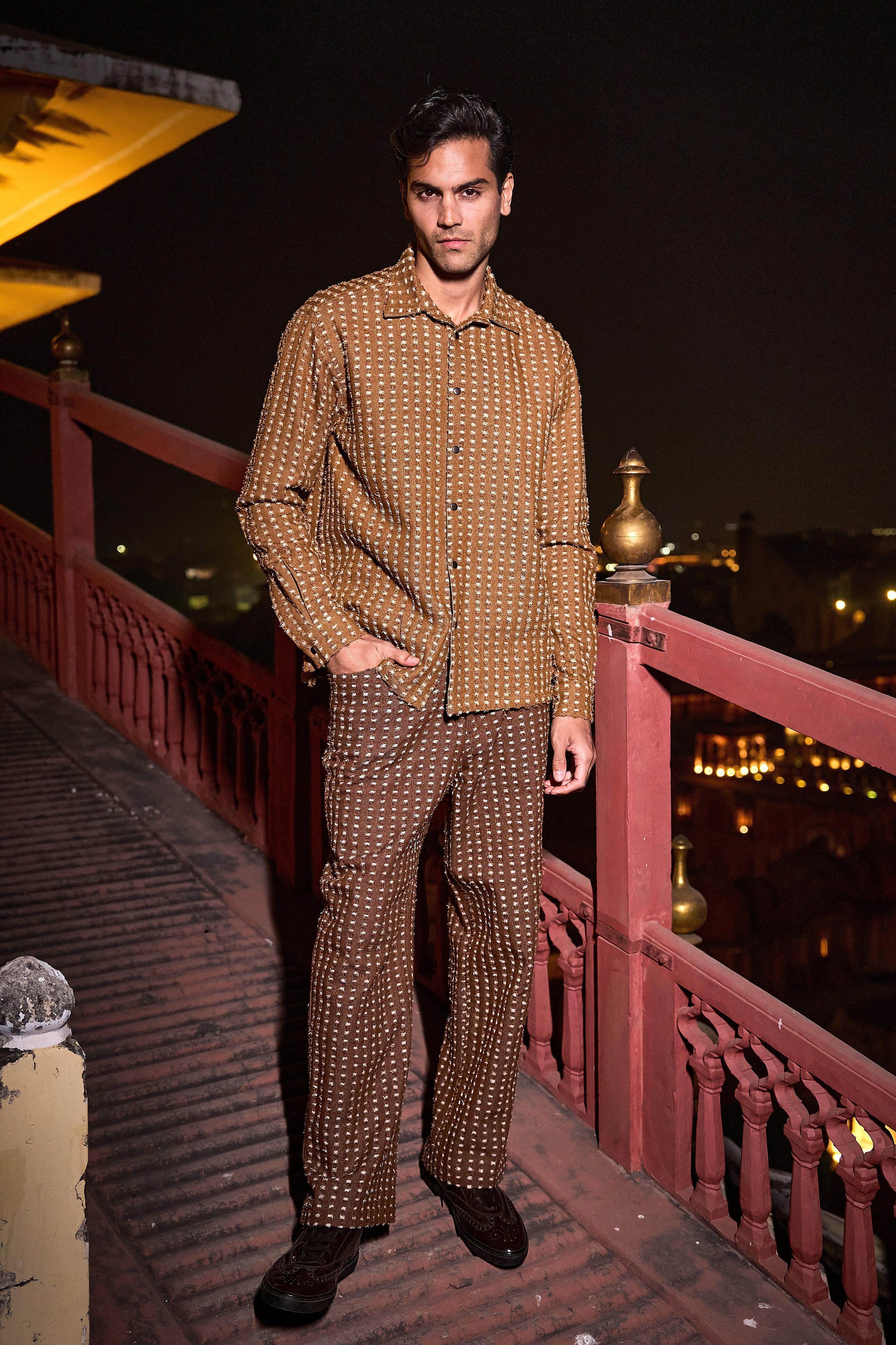 3D textured boxy denim shirt in khaki and white clipped jacquard cotton fabric. Full sleeves with snap buttons on the center front placket and full sleeve cuffs.
