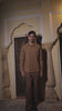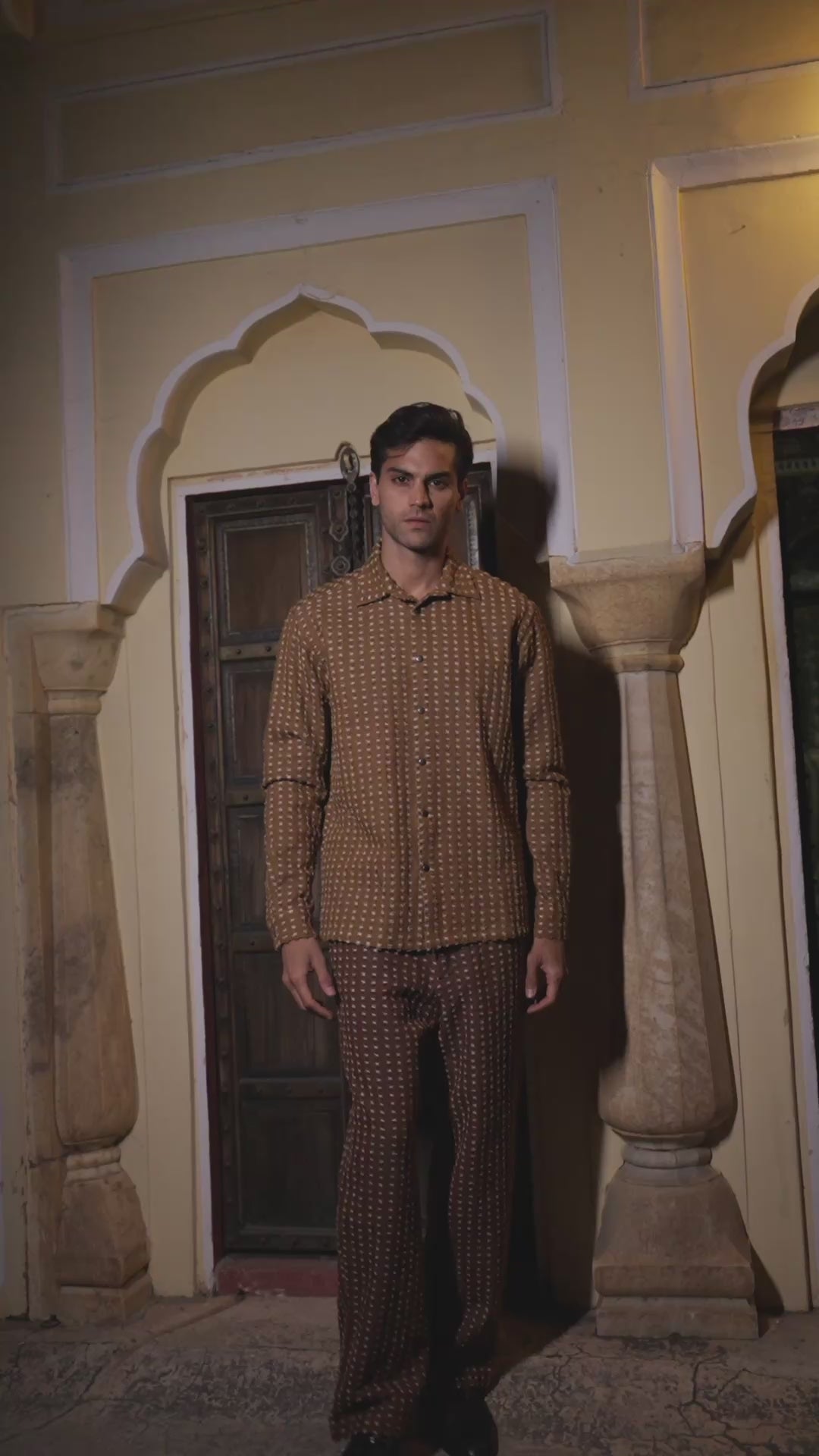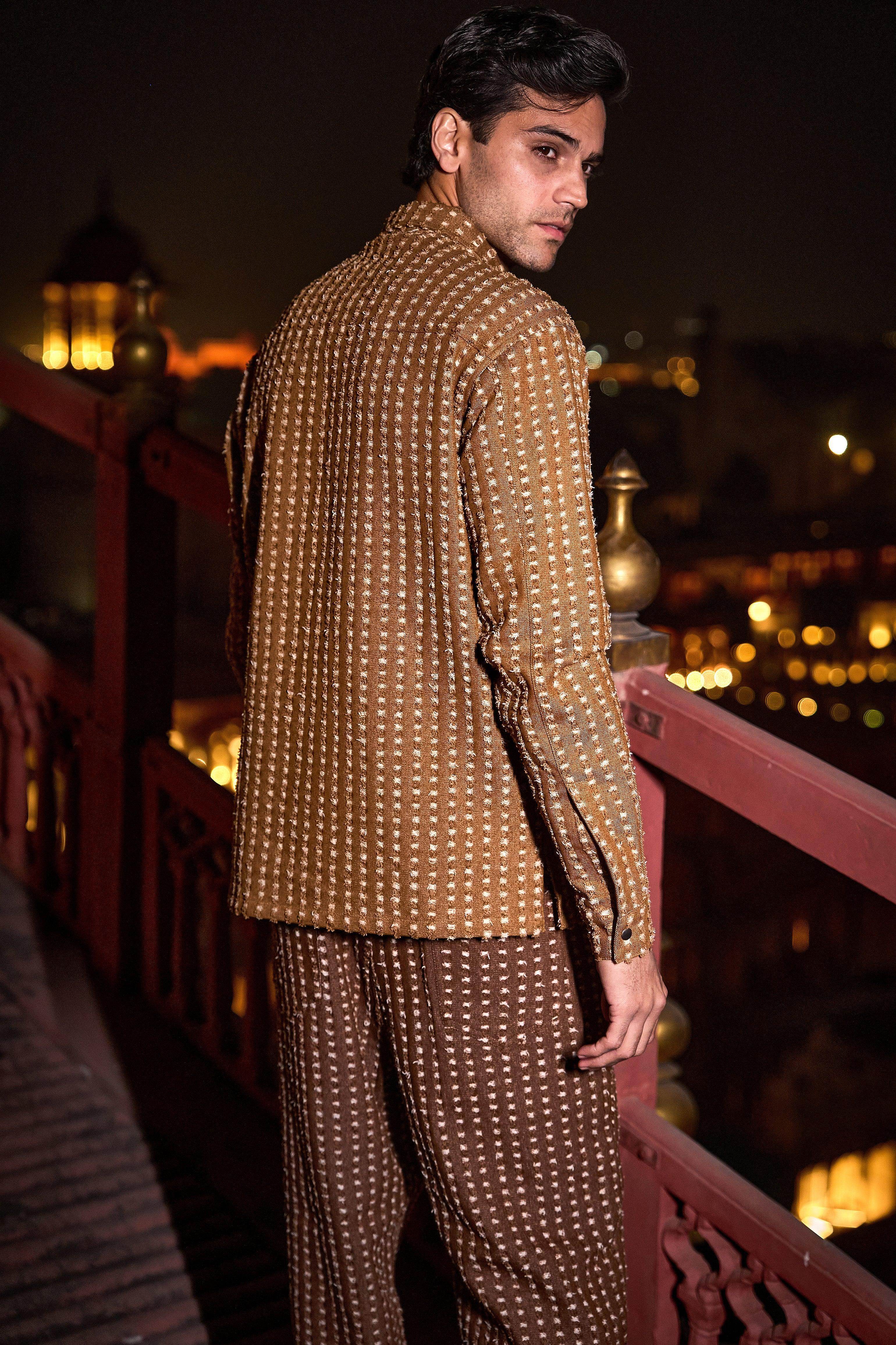 Paired with complementary straight cut denim pant in brown and white clipped jacquard cotton fabric. Pockets in the side and back. Belt loops on the waist. Hook/eye and zip closure in the front.